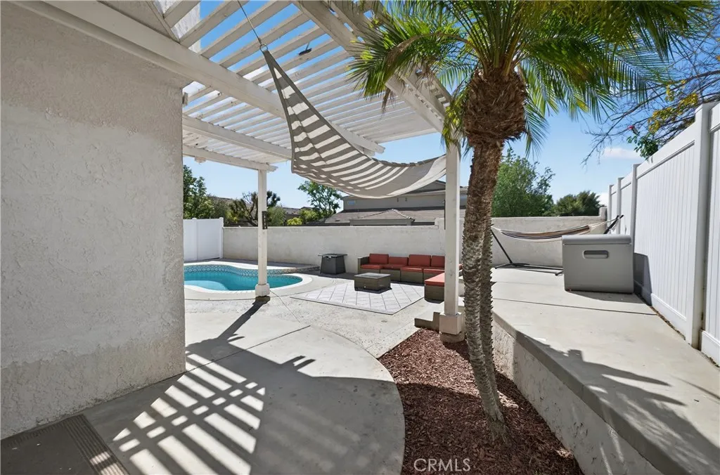Come see this POOL home in Menifee Lakes community! The home features spacious 4 bedrooms and 3 bathrooms. First floor bedroom makes great office or guest room. Kitchen features a pantry and plenty of cabinet space. Whether you want privacy in your own backyard pool, or to socialize at the community beach club pool, the heat doesn't stand a chance! Menifee Lakes offers many amenities such as golf, private beach club, and a 35 acre lake with fish. Home is located minutes away from freeway and shopping center.