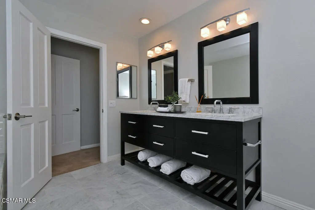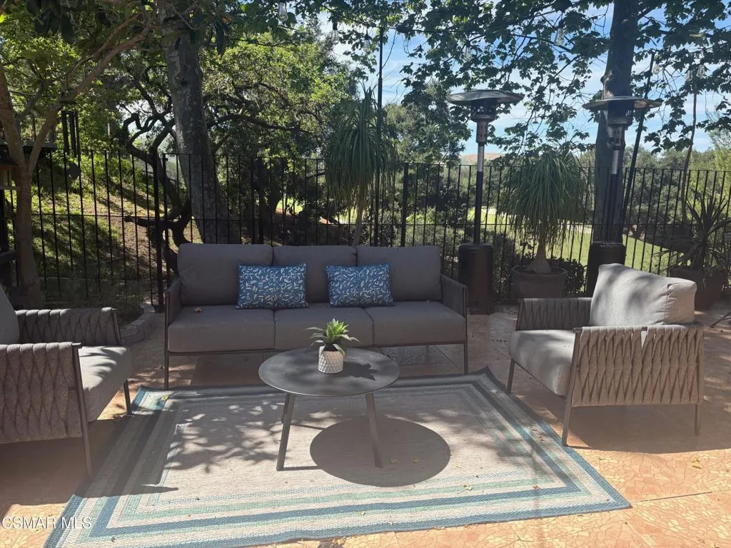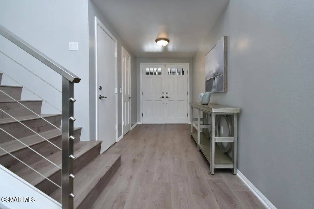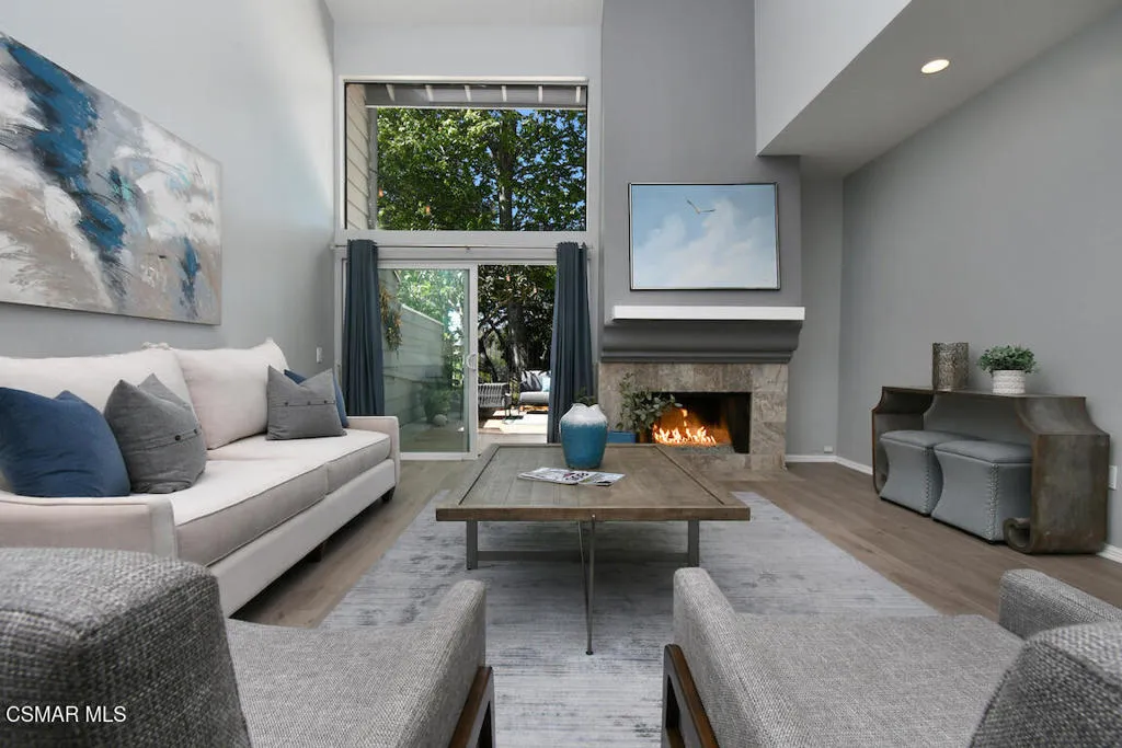 This beautifully remodeled contemporary townhome sits in the heart of North Ranch, offering scenic fairway views of the North Ranch Country Club golf course and surrounded by exquisite multi-million dollar estates. Bright, open, and inviting, the home welcomes you with gleaming hardwood floors and a fresh, airy feel throughout. A modern staircase with sleek stainless steel and cable railings leads you upward, while soaring cathedral ceilings and a dramatic wall of glass with transom windows fill the space with natural light, all while maintaining a sense of privacy. The spacious living room features a stylish updated fireplace and flows effortlessly into the formal dining area, highlighted by a striking contemporary designer chandelier. The main level also includes a wet bar with Carrera marble countertops and a beautifully remodeled powder room. In the kitchen, you'll find granite countertops, a subway stone tile backsplash, large cast iron sink and newer faucet, white cabinetry with stainless hardware, and a charming breakfast nook. Upstairs, the luxurious primary suite offers a spa-inspired bathroom with Carrera marble, a separate tub and shower, and a designer double vanity. Two additional generously sized bedrooms and an updated bathroom complete the second floor. Step outside to a large private patio and yard with sweeping golf course and canyon views--perfect for effortless indoor-outdoor living and entertaining.