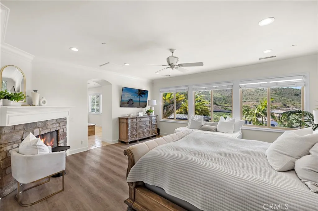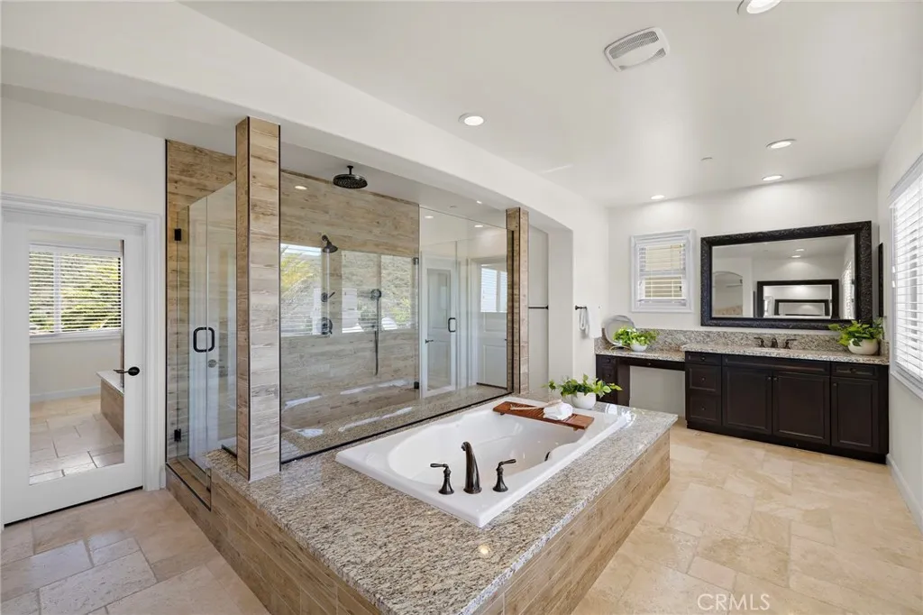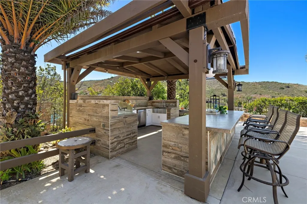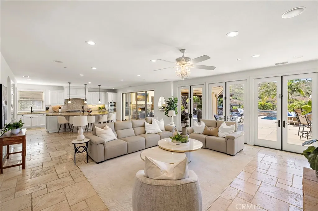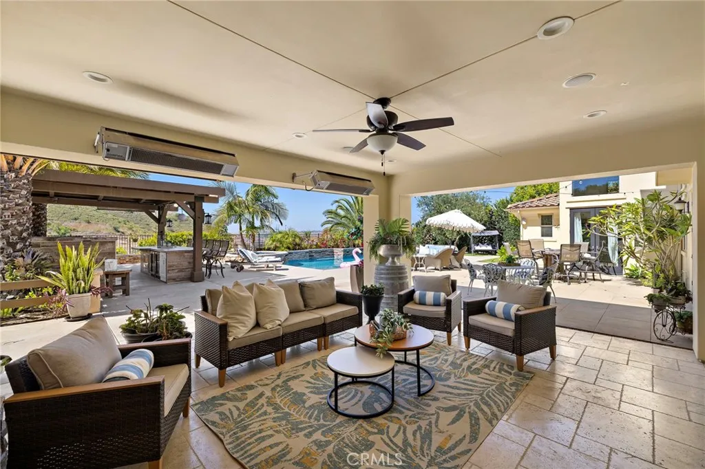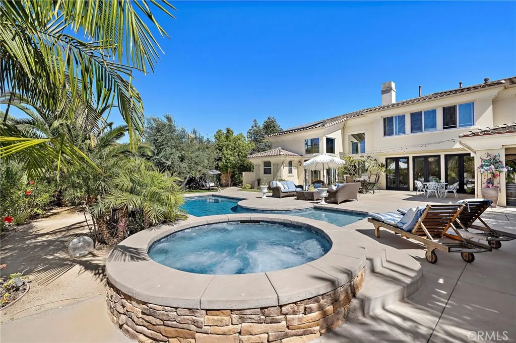 Situated on an expansive lot, this Mirador Plan 6 Italian Villa by Woodbridge Pacific is where stylish architecture blends seamlessly with luxury and comfort. Located in the desirable Whispering Hills community of Rancho San Juan, this special retreat is truly an experience—not just a home. A bright and open feel with abundant natural light welcomes you upon entry. Enjoy the incredible pool set against views of rolling hills and even the Saddleback Mountains—an ideal place to spend your time. The backyard also features the always-popular Capistrano Room, offering the feel of outdoor living with the comfort of indoor amenities. The functional floor plan and timeless design make this home ideal for both everyday living and entertaining. With approximately 5,120 square feet, the first level includes a bedroom with an en suite bathroom, a game room, a wet bar, and more. The second story features a spacious loft and four additional bedrooms. Inside, the home is equipped with high-end appliances, while the backyard boasts a full kitchen with custom cabinetry. Elegant chandeliers illuminate the foyer and main level, which showcases tumbled travertine flooring, while the upstairs features wide-plank luxury vinyl flooring. Additional highlights include a Trimlight system, built-in sound system, top-of-the-line pool equipment, and more. Conveniently located near award-winning schools, a variety of restaurants, iconic downtown San Juan Capistrano, shopping, picturesque beaches, and easy access to the 5 freeway and 241 toll road, this is a rare opportunity to own an exceptional estate.
