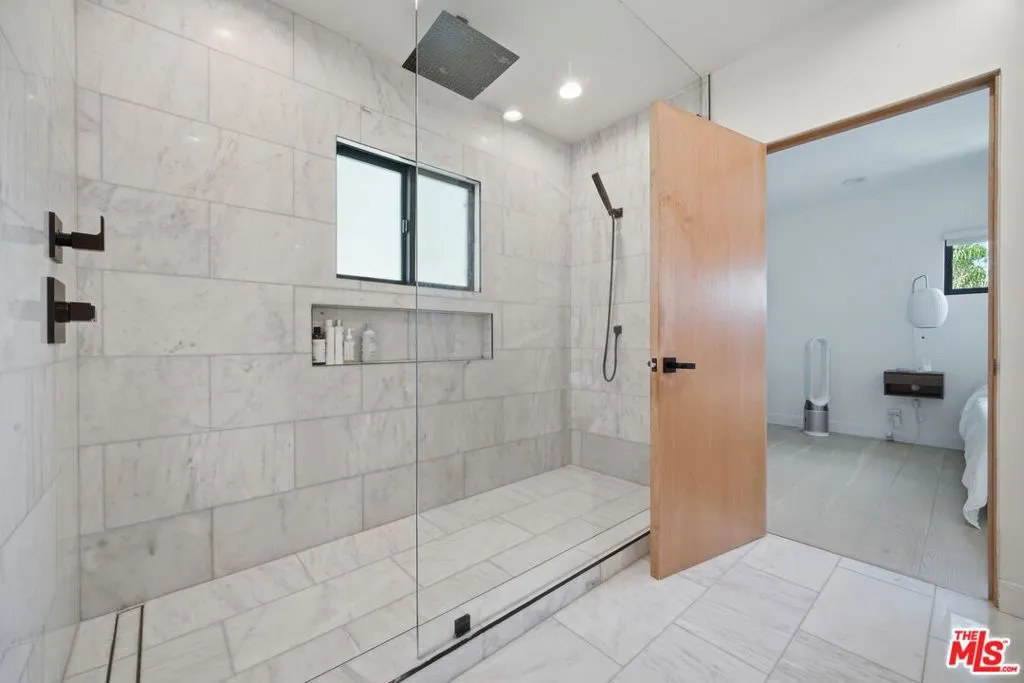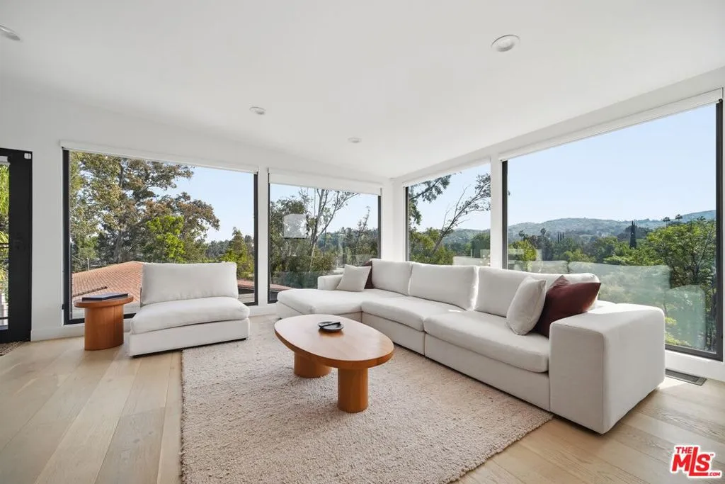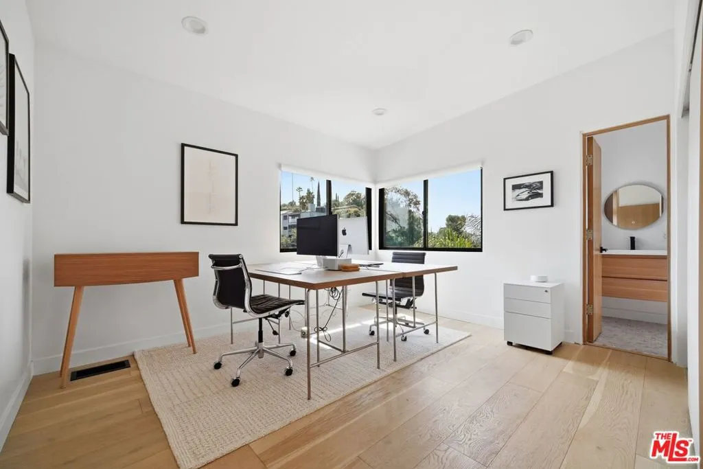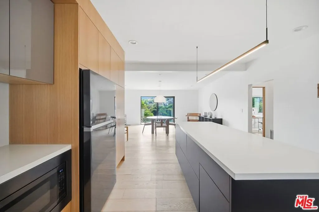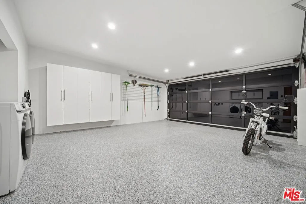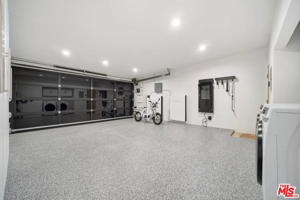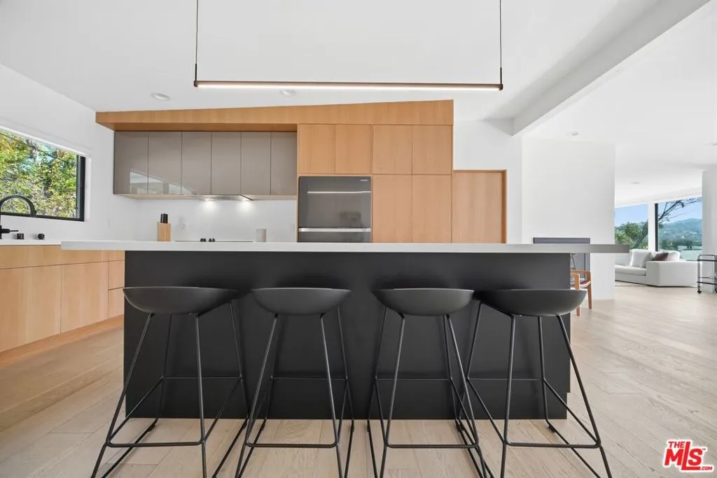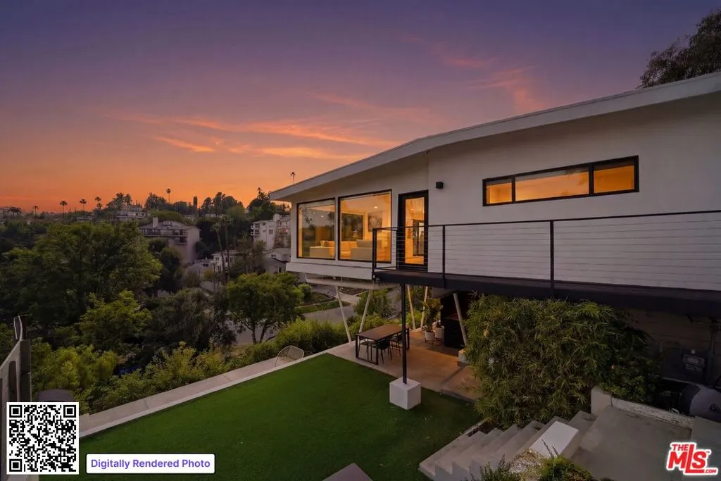 This recently remodeled mid-century home showcases refined materials, modern systems, and thoughtful design throughout. Offering 2 bedrooms and 2 bathrooms, the interior features 9 foot ceilings and engineered white oak flooring that enhance the home's clean, cohesive aesthetic. The kitchen stands out with a 97 inch quartz island, custom white oak cabinetry, and contemporary finishes. The living area is anchored by 80 inch floor to ceiling windows that frame large views and bring in abundant natural light. The adjacent dining area deck also captures expansive outlooks, creating a seamless connection between indoor and outdoor spaces. Energy efficient systems include Tesla solar power supported by two Tesla Power walls. Additional upgrades feature an epoxy coated garage floor, a washer and dryer, a Noritz tankless water heater, smooth stucco exterior, and white oak cladding that complements the home's architectural style. A blend of mid-century character and modern enhancement, this residence highlights quality craftsmanship and a well curated selection of premium finishes. The home is single level however, there are stairs leading to the side yard.