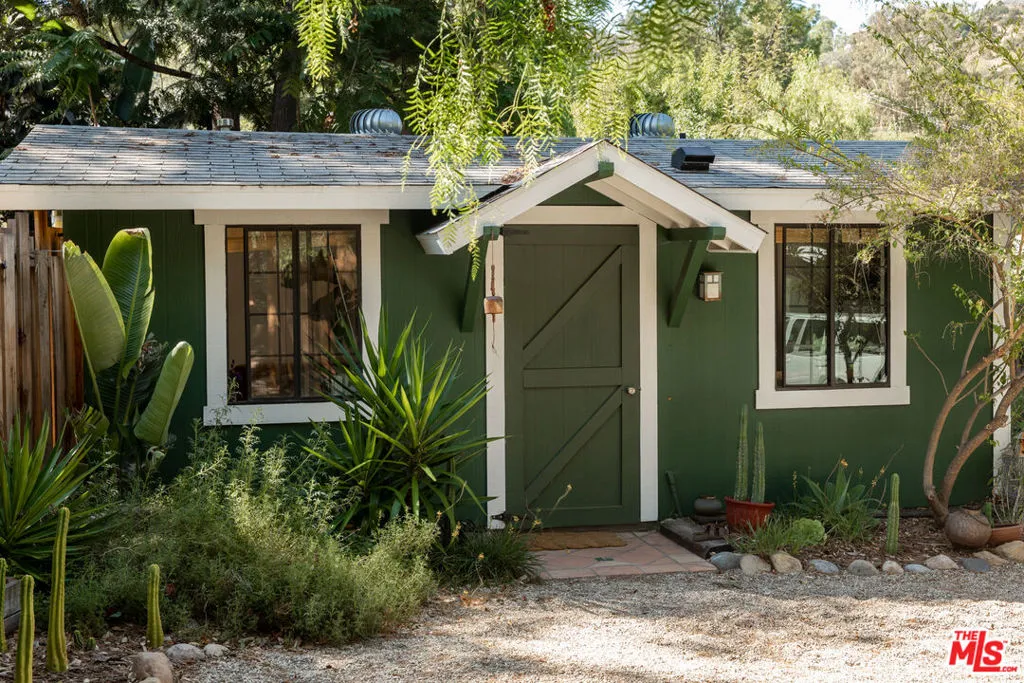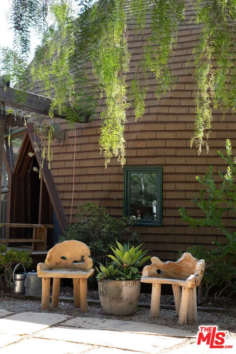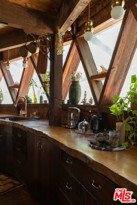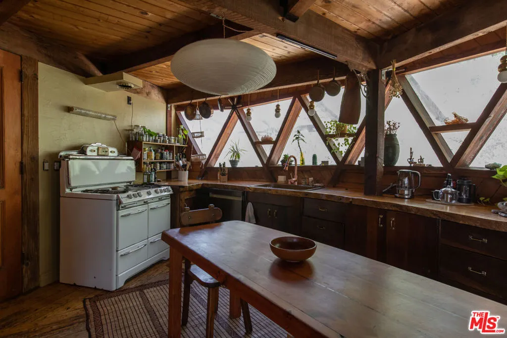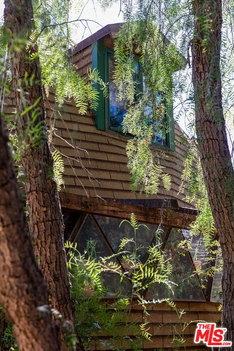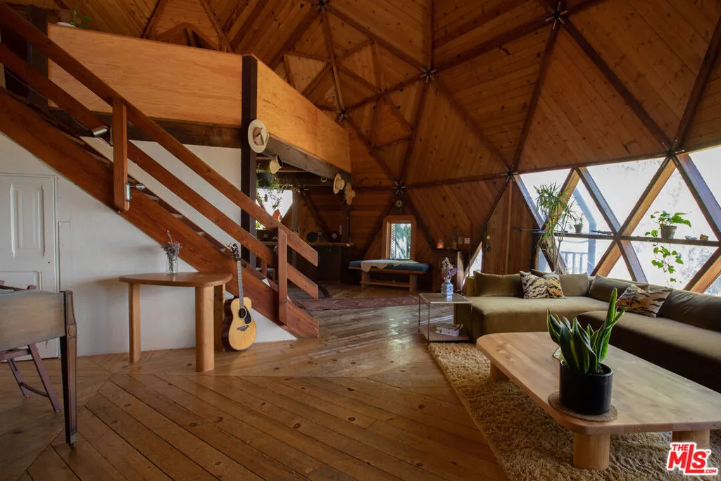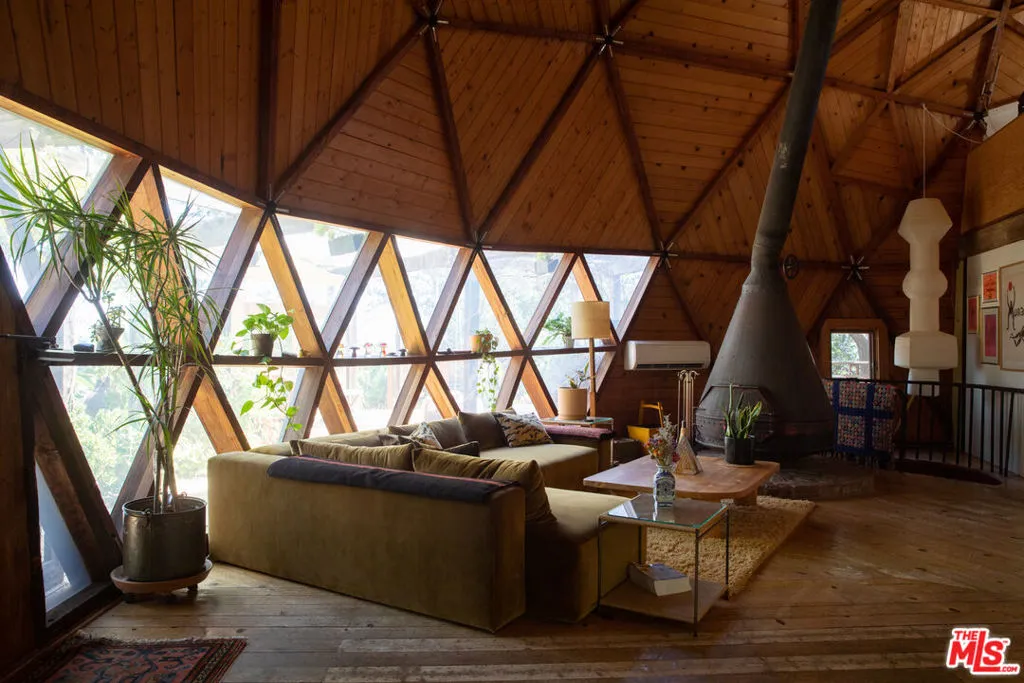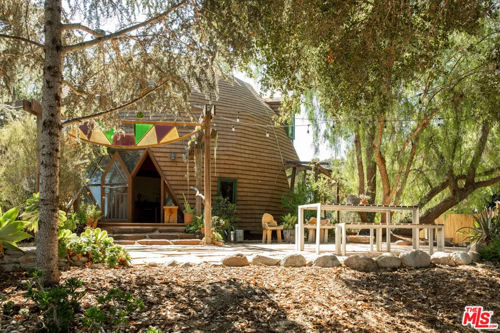 This Geodesic Dome home is all magic. Every corner is thoughtfully designed, creating beautiful sanctuary-compound living. The primary bedroom and bathroom are on the main floor with a guest suite on the lower floor (which is currently being used as a storage space). The upper loft area features an open bedroom space, bathroom, and living room area. The kitchen features wood beams that are said to be from the pier at Pacific Ocean Park and has recently been redone with finely designed custom cabinetry. The yard has landscaped paths leading to shaded nooks, fruit trees, a sauna, hot tub, outdoor shower, and cold plunge pool. There are three structures, including a one-bedroom, one-bathroom guest house, a large open studio, and a workshop, which is currently being used as a music studio. This property is the Topanga dream!