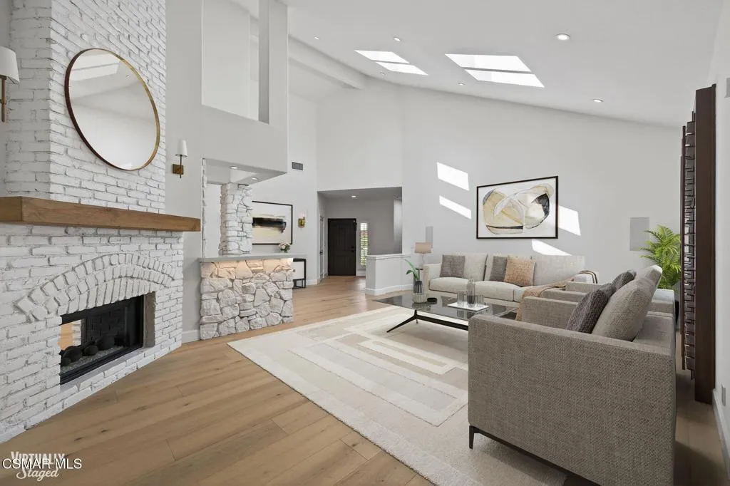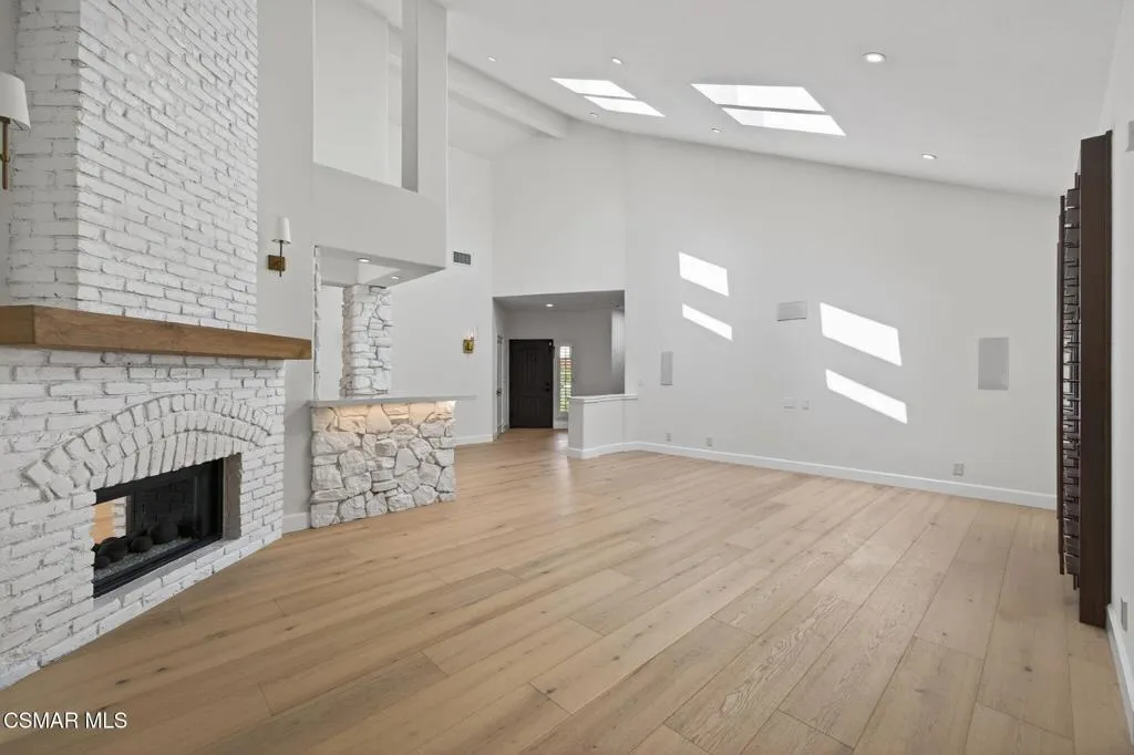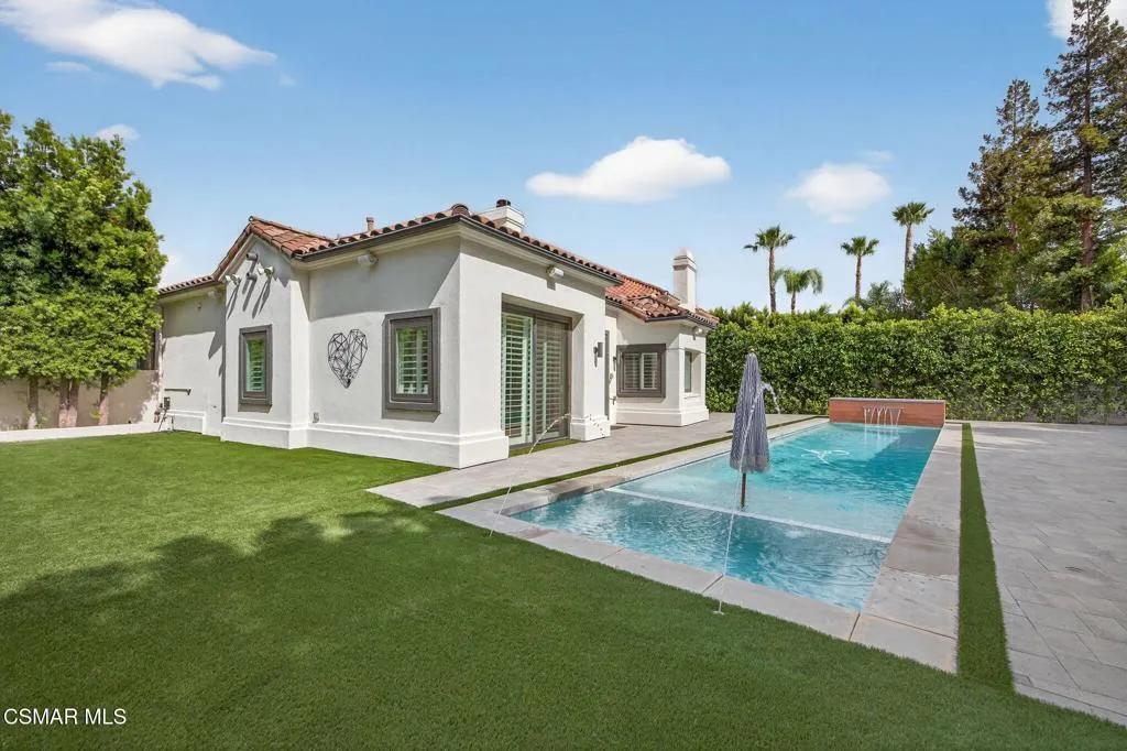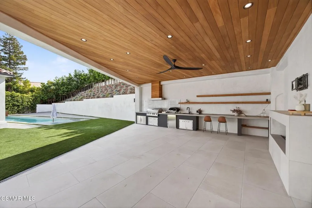 Single story Westlake Village home on a nearly 1/3 acre private corner lot. Exceptional outdoor rear yard. The backyard is truly a standout, featuring an outdoor living area with a built-in BBQ, pizza oven, sink, fireplace, and wired for a TV. Meticulously landscaped grounds with new hardscape throughout the exterior to create a setting rarely found in this price range. Fire feature added to the pool and spa. Other upgrades are a recently replaced roof with new Spanish tile, newer windows, brand new wood flooring throughout, shutters, a remodeled primary bath. Custom lighting is found throughout, along with in-wall speakers for TV and music both indoors and out. Added skylights bring in even more natural light.