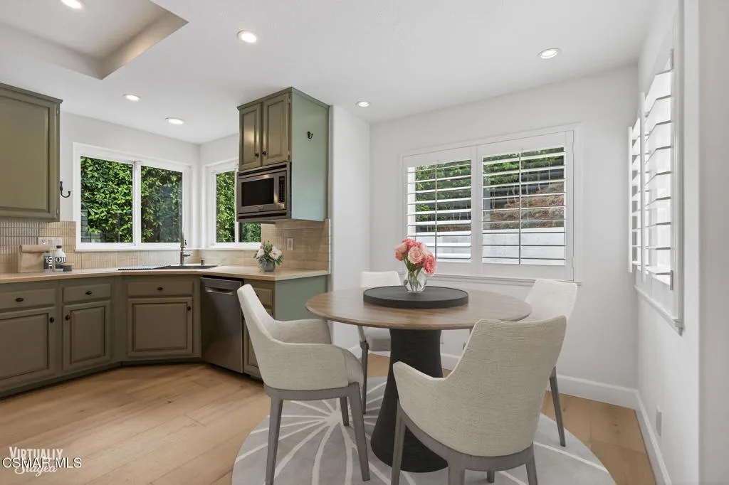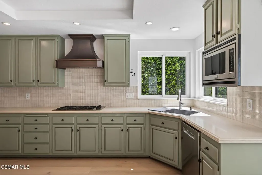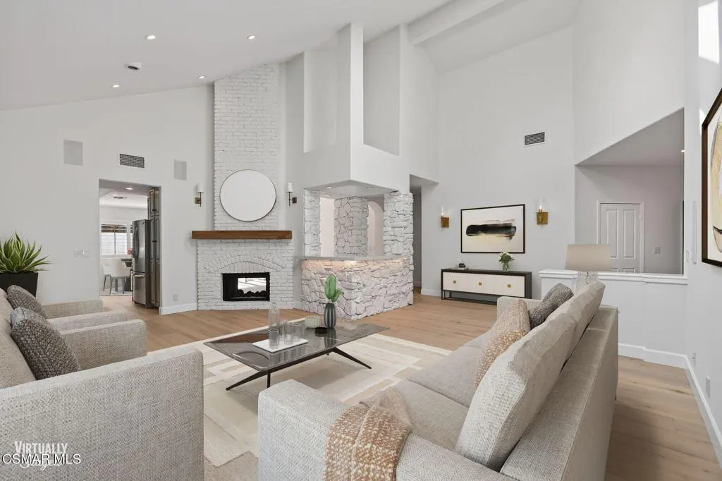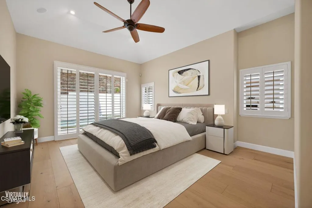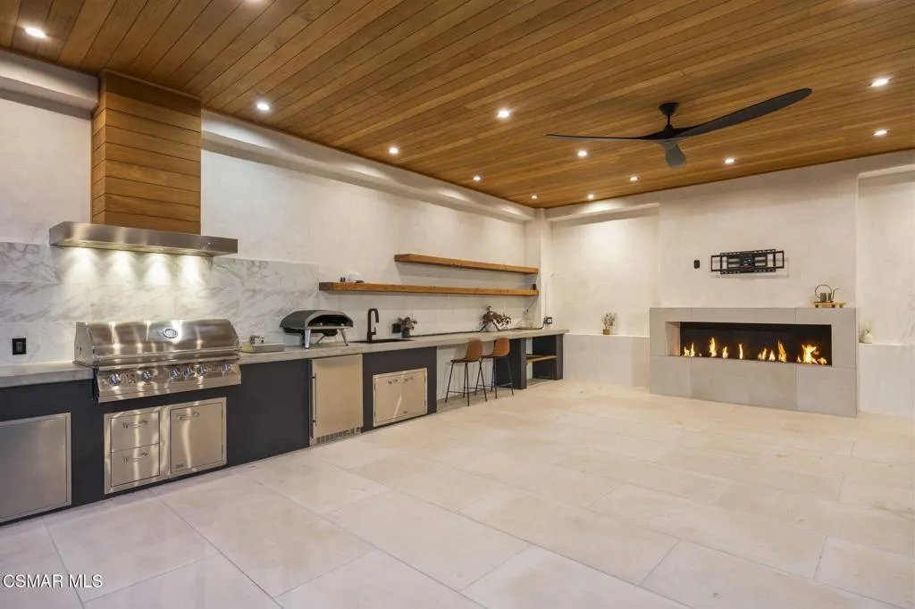 Single story Westlake Village home on a nearly 1/3 acre private corner lot. Exceptional outdoor rear yard. The backyard is truly a standout, featuring an outdoor living area with a built-in BBQ, pizza oven, sink, fireplace, and wired for a TV. Meticulously landscaped grounds with new hardscape throughout the exterior to create a setting rarely found in this price range. Fire feature added to the pool and spa. Other upgrades are a recently replaced roof with new Spanish tile, newer windows, brand new wood flooring throughout, shutters, a remodeled primary bath. Custom lighting is found throughout, along with in-wall speakers for TV and music both indoors and out. Added skylights bring in even more natural light.