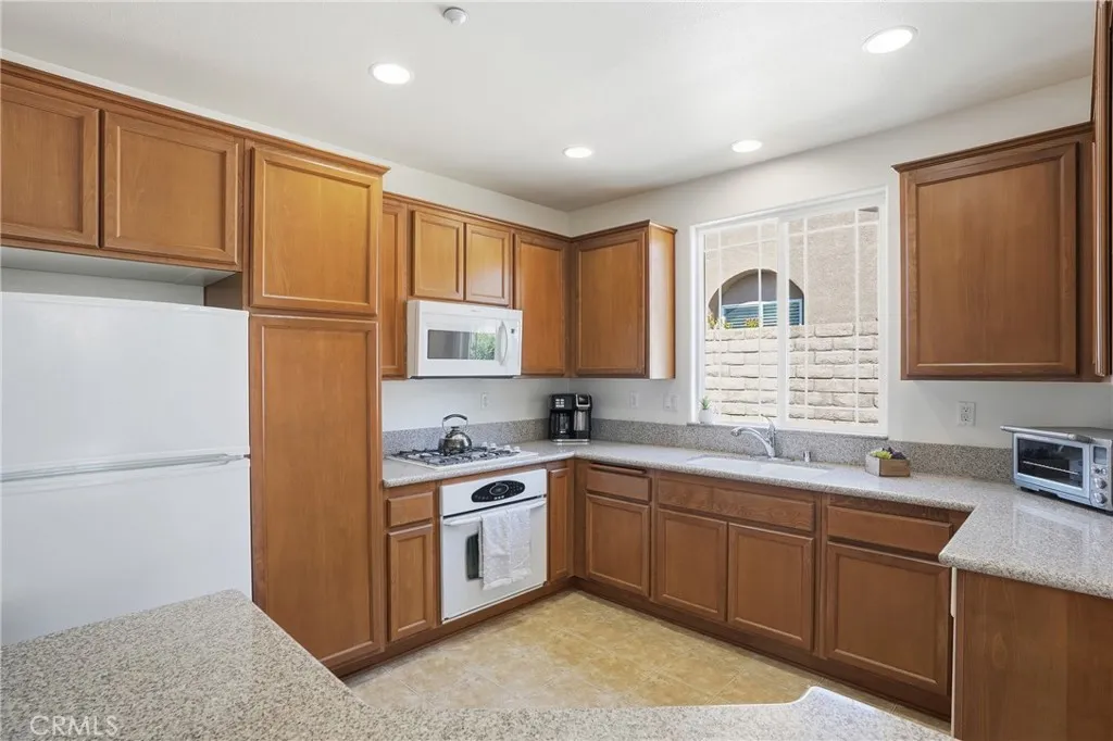 Welcome to this sought-after single-story end-unit townhome in La Ventana, lovingly cared for by its original owners. Offering 3 bedrooms and 2 baths, this home is filled with natural light, soft neutral tones, and an open layout that feels both spacious and comfortable. The great room features vaulted ceilings, while the open kitchen boasts granite tile counters, warm wood-style cabinetry, and a breakfast island--perfect for gathering. The split floor plan provides a private primary suite, with two additional bedrooms and bath on the opposite side. Step outside to a peaceful, low-maintenance backyard--ideal for relaxing evenings. Complete with an oversized 2-car garage and appliances included, this home has it all. Enjoy low HOA dues with access to a gated community, greenbelt, pool, and clubhouse. Come see it before it's gone! Open House this Sunday 4/12 from 12:00 to 2:00.
