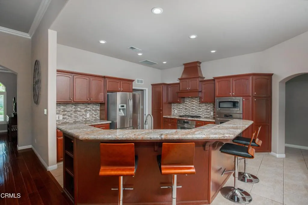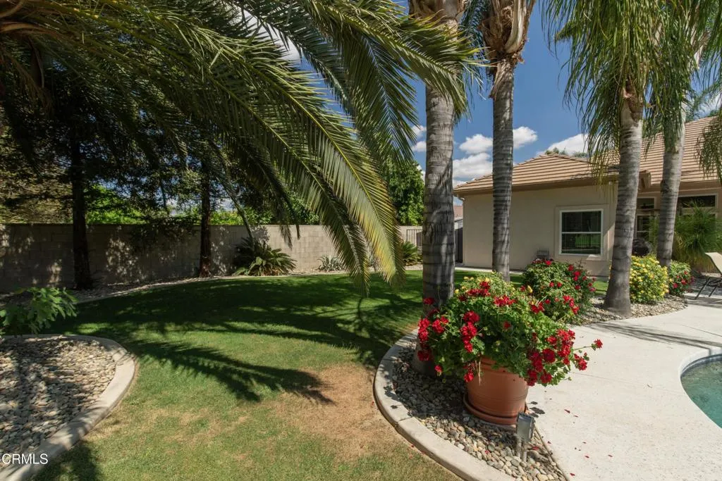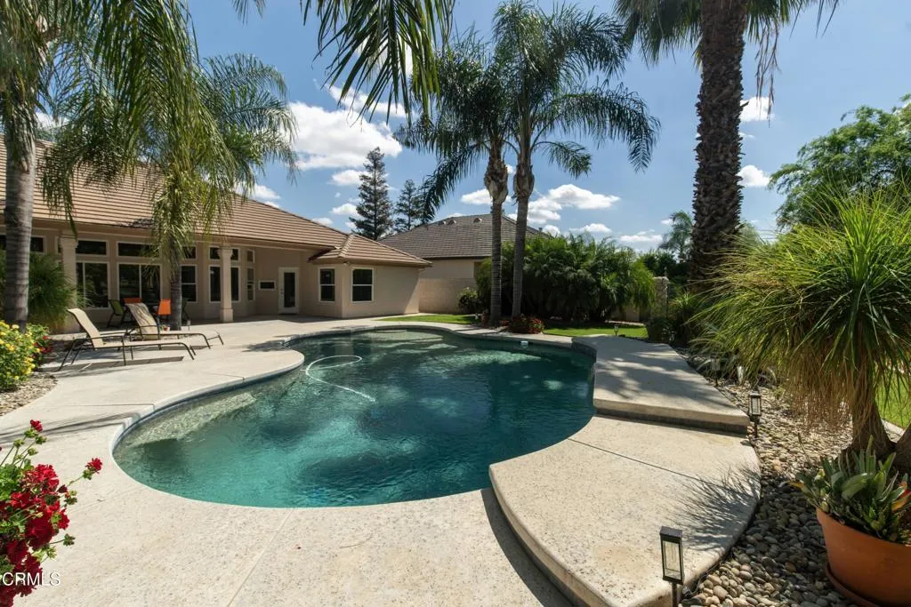 This amazing Riverlakes Golf Course home truly has it all, located in the gated Arbors community on the 16th hole w/ lovely course views. Featuring 4 bedrooms and 3 baths w/ one bed used as a study, this 2,667 sf home offers both flexibility and function. The huge backyard is a private retreat w/ a pool, mature palm trees, and covered patio perfect for entertaining. Inside, you'll find high-end finishes like engineered wood floors, crown molding, plantation shutters, and OWNED solar. The open layout showcases a large kitchen w/ granite counters, stainless-steel appliances, island w/ breakfast bar, decorative tile backsplash, and dining area. In the family room, enjoy an impressive rock fireplace, built-in entertainment center, and stunning backyard views. A formal dining room adds elegance, while the primary suite offers a walk-in closet and luxurious bath w/ dual vanities, granite counters, soaking tub, and double-headed shower. This is more than a home--it's your everyday escape.