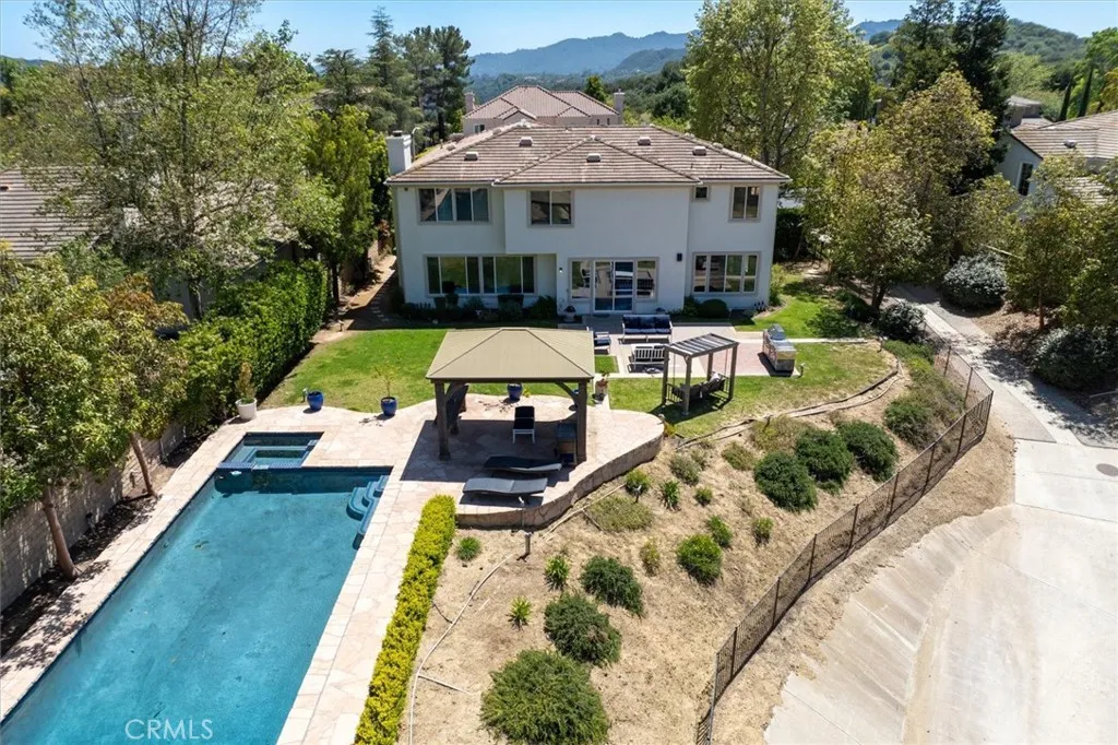 INCREDIBLE VALUE! Tucked away within the prestigious guard-gated enclave of Summit Point Estates, this exquisite five-bedroom, four-and-a-half-bath residence offers the perfect blend of timeless elegance and modern luxury. Situated at the end of a peaceful cul-de-sac, the home welcomes you with a stately double-door entrance that opens to soaring 30-foot ceilings and a bright, thoughtfully designed floor plan ideal for both refined entertaining and everyday living. The grand formal living and dining rooms exude sophistication, seamlessly flowing into a chef's dream kitchen—beautifully appointed with dual center islands, top-of-the-line Thermador appliances, and an abundance of custom French country cabinetry. The adjacent family room, anchored by a cozy gas fireplace, offers a warm and inviting ambiance, while the charming breakfast island provides the perfect spot for casual dining. A well-appointed guest suite with a private bath completes the main level, ideal for visiting family or friends. Upstairs, the expansive primary retreat features a serene sitting area, dual walk-in closets, and a luxurious en-suite bath with double vanities, soaking tub, and separate shower. Three additional bedrooms—two sharing a Jack-and-Jill bath and one with a private en-suite—provide ample space for family or guests. Walls of glass open to the resort-inspired backyard, where lush landscaping surrounds a sparkling pool and spa, expansive lawn, and covered patio—offering an idyllic setting for entertaining or tranquil relaxation. A finished four-car garage, complete with a 220-volt EV charger, adds to the home's exceptional amenities. Located in the scenic Santa Monica Mountains, just minutes from hiking trails, premier shopping and dining at The Village, and the iconic beaches of Malibu—this is California living at its finest.
