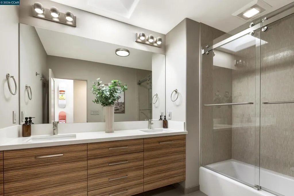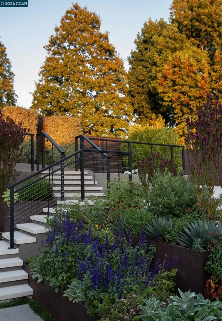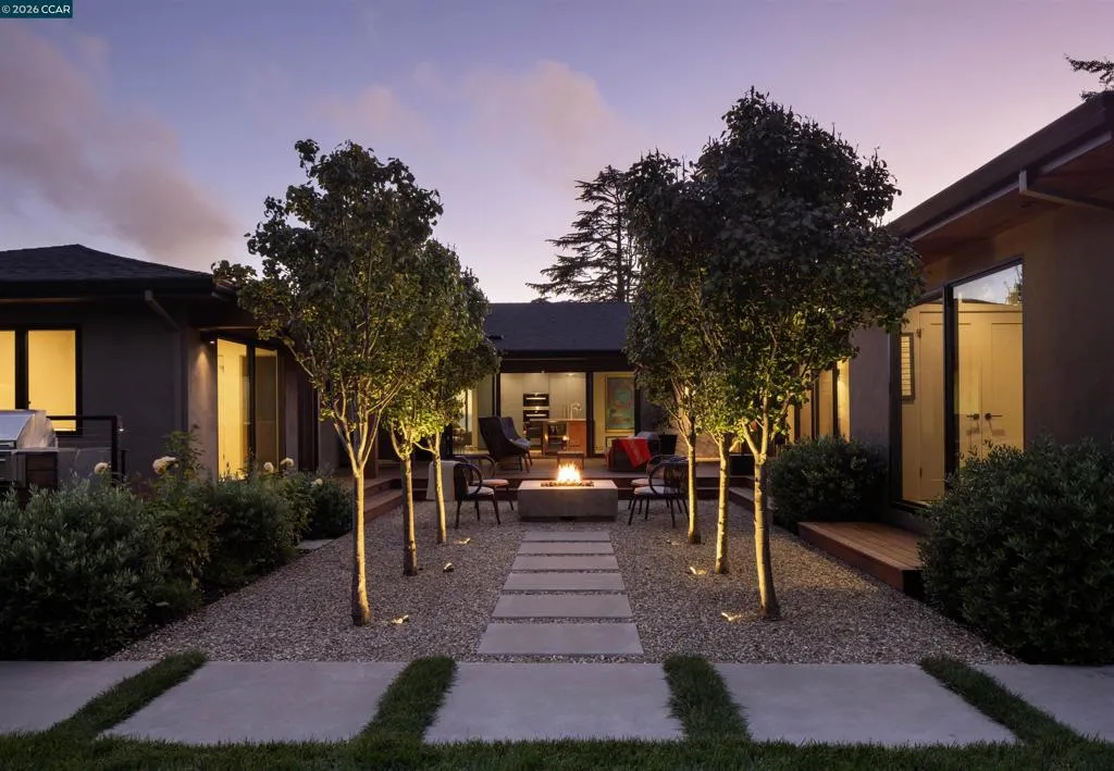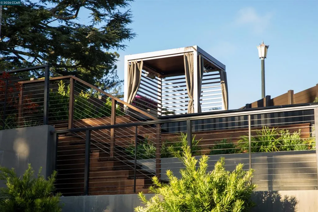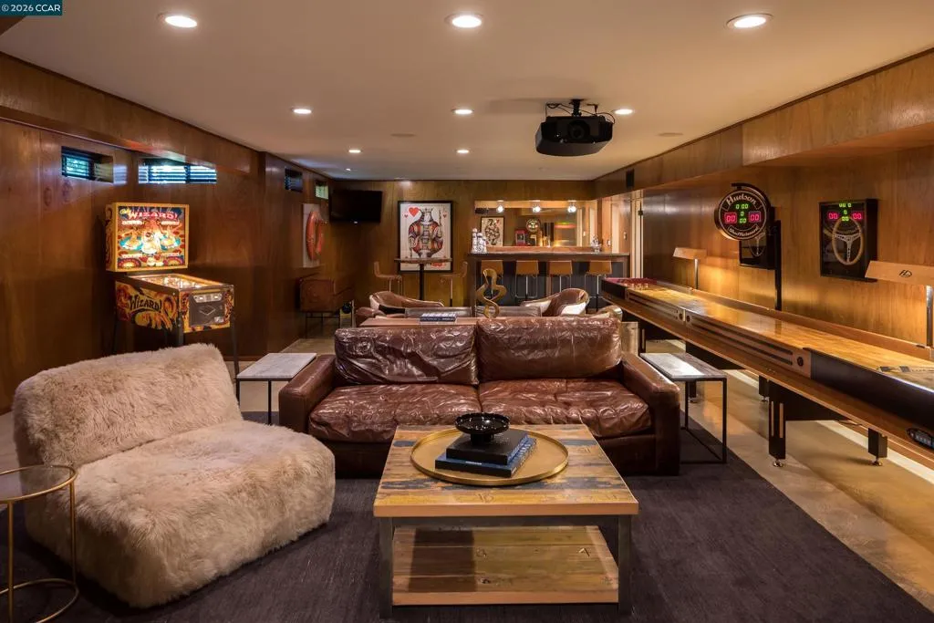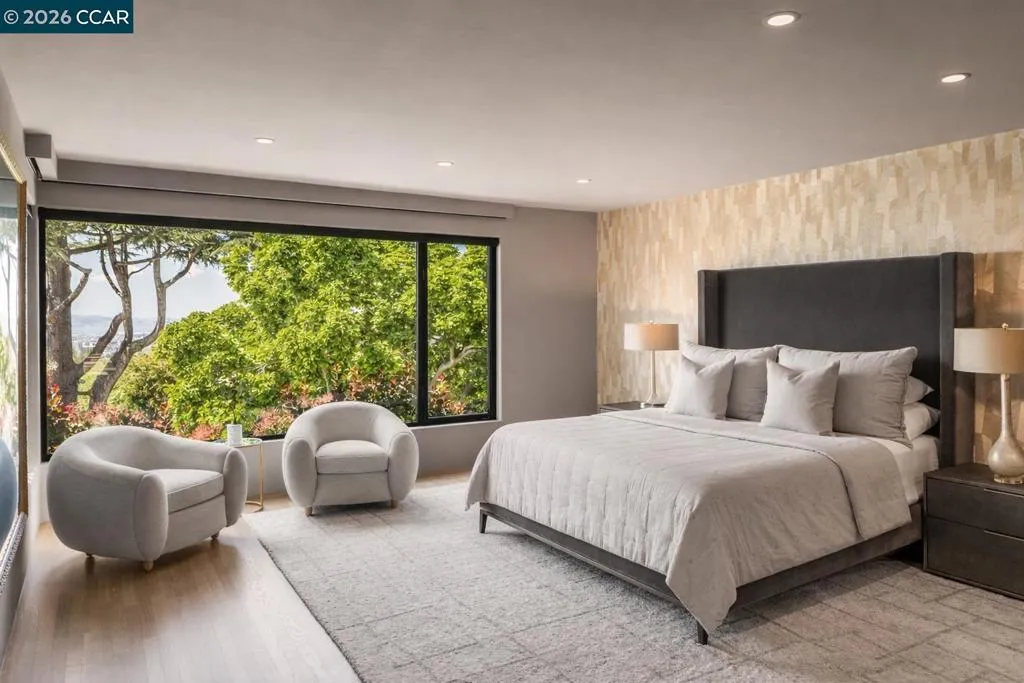 A private oasis designed for indoor-outdoor living, inspired by the elegance of luxury hospitality. Thoughtfully reimagined, this residence blends refined contemporary design with exceptional comfort and functionality. The home offers 5 bedrooms and 5-and-a-half bathrooms, including 3 en-suite retreats. The primary suite is a sanctuary, featuring a spa-like bathroom with an expansive multi-head and steam shower. At the heart of the home, the chef’s kitchen is appointed with Wolf, Sub-Zero, and Miele appliances, dual wine refrigerators, and custom cabinetry, flowing effortlessly into the main living spaces and to the expansive deck. Outdoor living is a defining feature, with Thermory decking, a fire pit lounge, multiple entertaining areas, a basketball court, a climbing wall, and a private plunge pool/spa with cabana-style seating overlooking the Bay. An expansive window wall fills the living room with natural light and frames views of the landscaped grounds, downtown Oakland, and San Francisco beyond. Additional highlights include a formal dining room, dedicated workspaces, and a finished lower level with a large entertaining room, gym, bathroom, wine room, and generous storage. A rare offering where architecture, privacy, and resort-like living come together beautifully. Views: Downtown