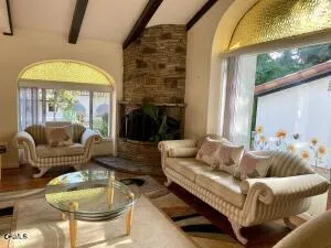 Welcome to this fully furnished 2-bedroom, 2-bath home, nestled on a peaceful 2-acre property in the heart of Ojai Valley. As you step into the living room, you'll be greeted by vaulted ceilings, a charming fireplace, and an abundance of natural light flooding the space. Enjoy your own beautifully landscaped private outdoor space that wraps around the home, complete with a cozy outdoor fireplace perfect for relaxing or entertaining. Located within the historic Casa De La Luna compound, this serene retreat offers the perfect blend of privacy and convenience. Surrounded by nature, it's just 10 minutes from downtown Ojai and 20 minutes from Ventura, allowing you to enjoy the best of both vibrant town life and tranquil natural surroundings. This home features shared access to a beautifully landscaped 2-acre property, onsite parking, and modern amenities like air conditioning and heating for year-round comfort. Best of all, utilities such as internet, water, power, and trash are all covered in the rental price. If you're seeking a peaceful escape with easy access to local attractions and outdoor activities, this property in the heart of Ojai Valley is an ideal choice. Available May 1st, don't miss the chance to make this unique rental your home!