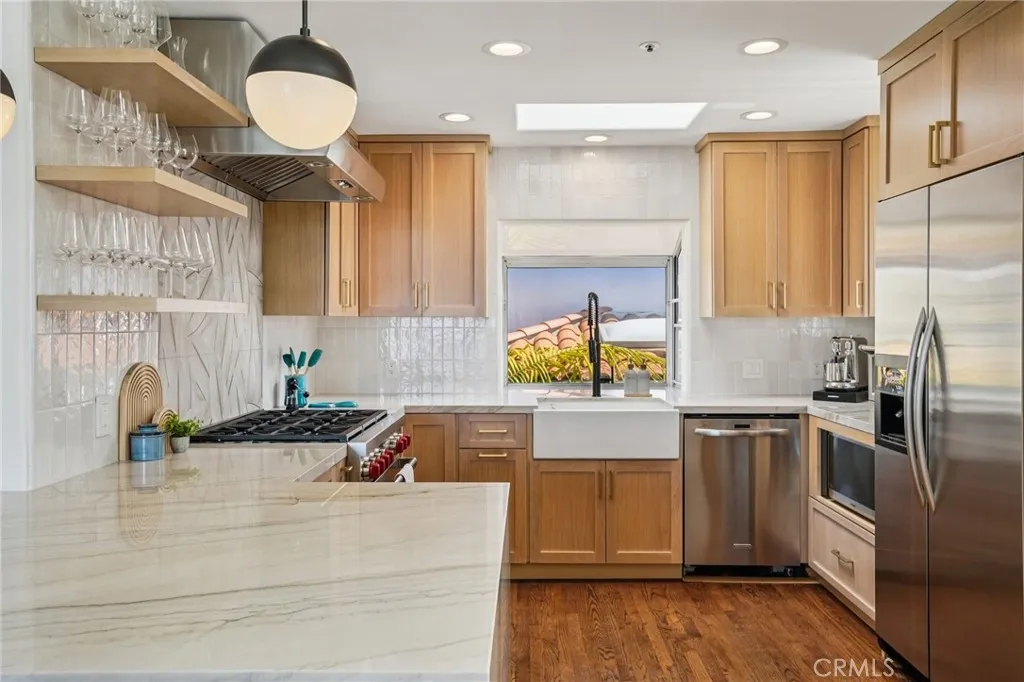 Panoramic ocean views, warm hardwood floors, and extensive modern renovations—this is the kind of home that makes you pause mid-conversation just to watch the sunset. Located in the prestigious Manhattan Beach Hill Section, you can find coastal living, privacy, and walkable trails, shops, and restaurants —not to mention the beach— just outside your front door. Tucked into one of South Bay’s most sought-after pockets, this location offers a rare balance of peaceful, elevated living with off-the-charts walkability—just moments from the Greenbelt, downtown Manhattan Beach’s top restaurants and boutiques, and the sand. Morning coffee strolls, sunset dinner plans, and spontaneous beach days are all right at your fingertips as well as the option to enjoy sweeping ocean views from the comfort of your couch. Opening the door to your new home, the entry level features two bedrooms—ideal for kids, visitors or a home office—connected by a beautifully finished Jack-and-Jill bathroom with Quartzite countertops and custom cabinetry. A dedicated laundry room and generous storage space round out the space. The full-floor primary suite feels like a sanctuary. Step onto your private balcony for morning coffee or a quiet reset, then unwind in the spa-inspired bathroom featuring a generous walk-in closet, custom dual marble vanity, open rainfall shower with multiple shower heads, soaking tub, and heated floors. On the top floor, a stunning great room with panoramic, west-facing ocean views takes center stage. Sunlight pours into the living, dining, and kitchen areas, creating an open space built for everyday living and entertaining. The kitchen features White Oak cabinetry, Quartzite countertops, stainless steel appliances, and a striking 6-burner WOLF range—paired with a farmhouse sink, soft-close drawers, and open shelving. A custom wet bar w/ matching ceramic tile backsplash ties everything together. This home was designed for easy and elegant entertaining. Step onto the balcony, fire up the grill, and enjoy the coastal breeze. Over the holidays, you’ll have a front-row seat to the Manhattan Beach fireworks. Additional highlights include a 2-car garage w/ extra storage, guest parking spot, 3 Hill Section parking passes, dual-zone A/C, central vac, a brand-new water heater, as well as brand-new doors, sliders, lighting, and sconces throughout. This is coastal living exactly the way it’s meant to be—and Hill Section homes with views like this rarely stay available for long.