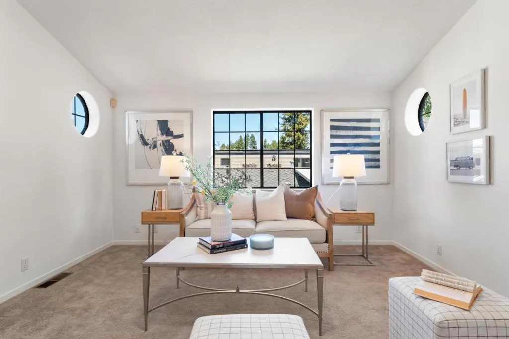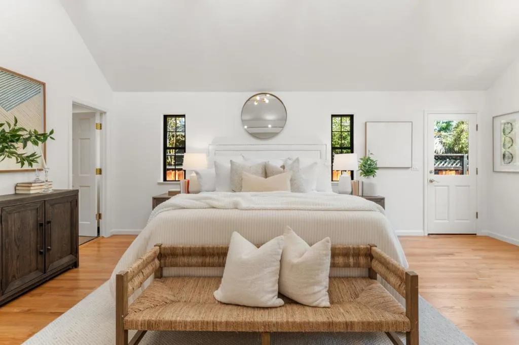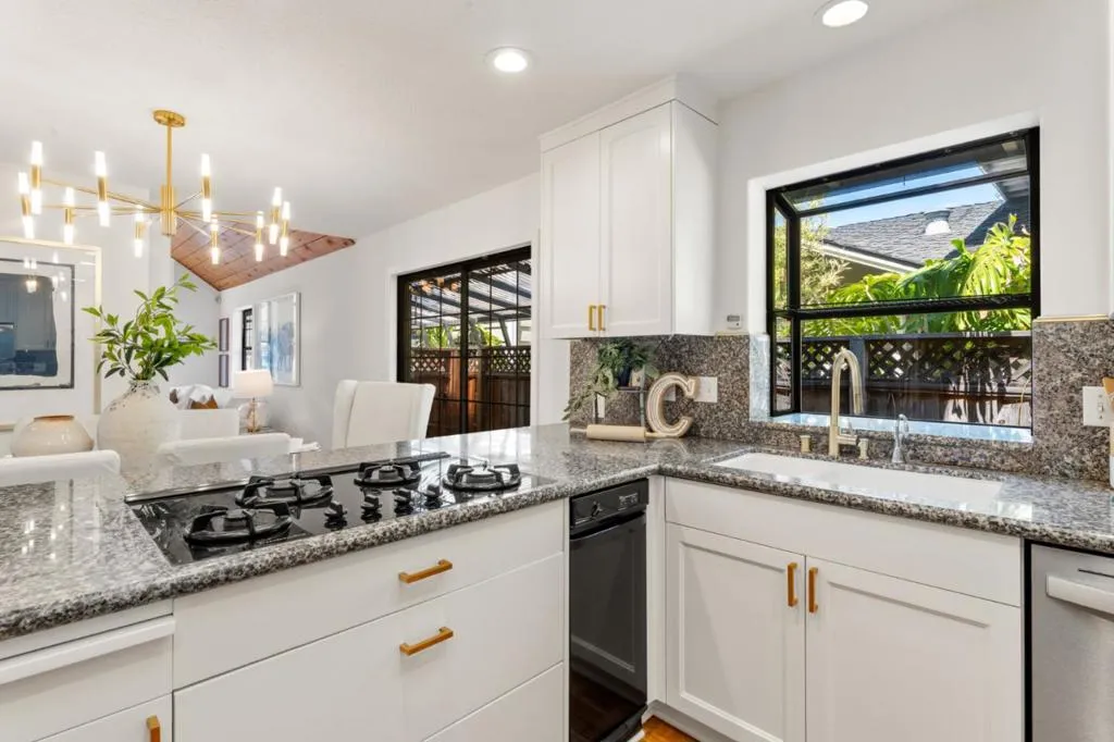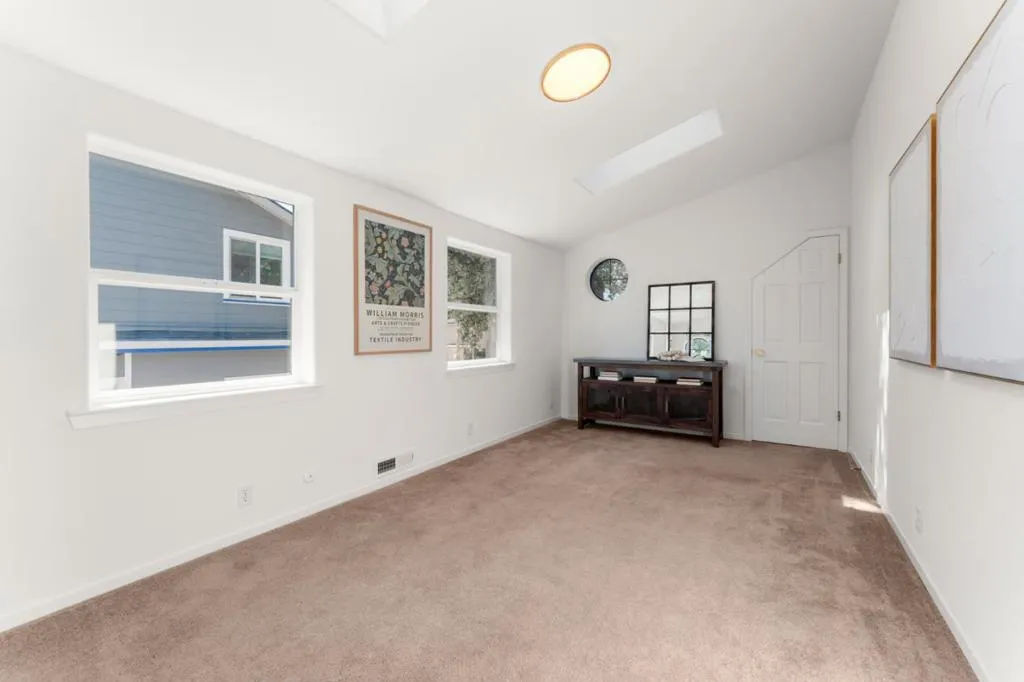 Located in Mountain View, close to Castro St and transporation, this 2,513 sq. ft. home offers four bedrooms and three full bathrooms, with the primary bedroom and 2 other bedrooms on the ground floor. The kitchen is equipped with a gas cooktop, double oven, microwave, dishwasher, refrigerator, freezer, trash compactor, and a skylight that adds natural light An inviitng dining area is open to the kitchen The living area features gas log fireplace and high, vaulted ceilings . The home includes a separate upstairs loft/family room and a fourth bedroom and 3rd bath. The laundry room is conveniently located near the downstairs bedrooms with washer and dryer included. Additional features include central AC, forced air heating, two car garage and a bonus living area behind the garage with kitchen, 1 bath and upstairs sleeping area. . The property sits on a 7,500 sq. ft. lot within the Mountain View Whisman elementary school district.