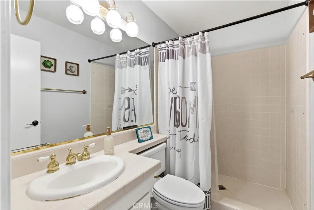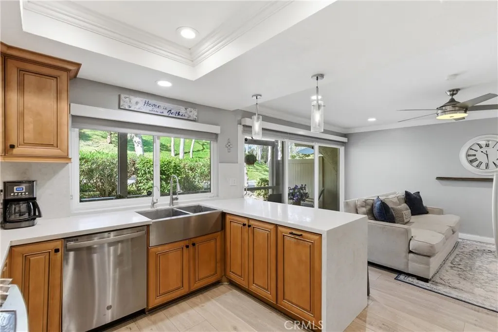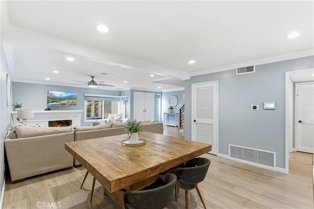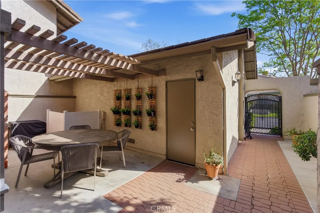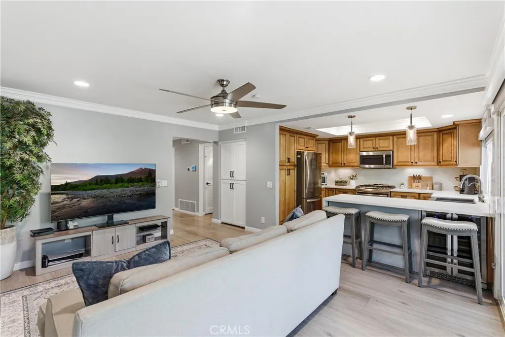 Open, light-filled living in Anaheim Hills’ Galerie community! This beautiful home has an exceptionally spacious 3-bedroom floor plan, with over 2,136 square feet and multiple outdoor living areas to enjoy. A 2-car garage and a gated entryway welcome you through a private patio courtyard before you step inside. The double-height foyer opens to dramatic curved stairs and luxury vinyl plank flooring that runs throughout the main level. The first living area features a fireplace and flows into your dining space, all with recessed lighting above. The family room and kitchen share an open layout that connects to one of the home’s best features: an expansive covered patio with sliding glass doors, overlooking the landscaped greenery of the community. The updated kitchen is finished with quartz countertops featuring a waterfall edge, bar seating for casual meals, and upgraded stainless steel appliances. A powder bath and dedicated laundry room round out the first floor. Upstairs, all three bedrooms are on the same level, each with carpet, ceiling fans, and recessed lighting. The primary suite is a retreat unto itself, with a huge bedroom area and an airy vaulted ceiling, sliding doors to a private terrace, plus a generous walk-in closet. The en-suite primary bath has a double-sink vanity and a soaking tub with shower. Two secondary bedrooms offer good natural light and storage, sharing a full hall bath. Galerie is a peaceful, well-maintained community with a clubhouse, pool and spa, playground, and BBQ and picnic areas. Top-rated Anaheim Hills schools, Oak Canyon Nature Center and trails, Anaheim Hills Golf Club, and diverse local dining and shops are all close by. A rare combination of space, privacy, and community.