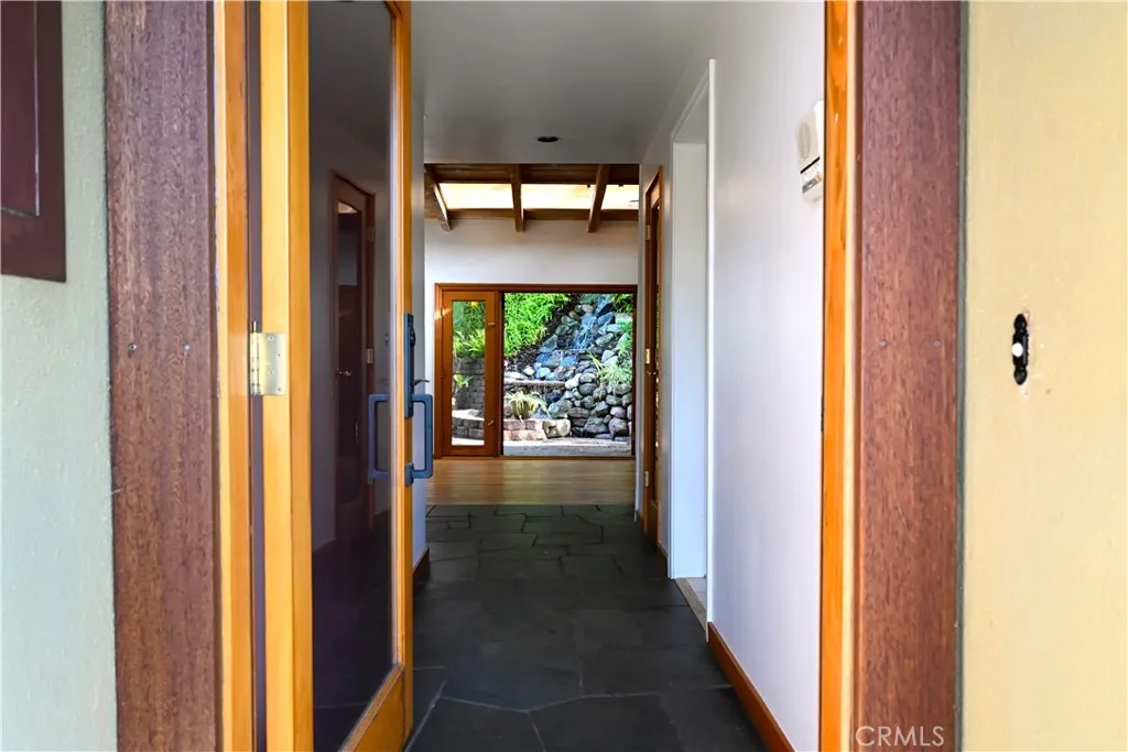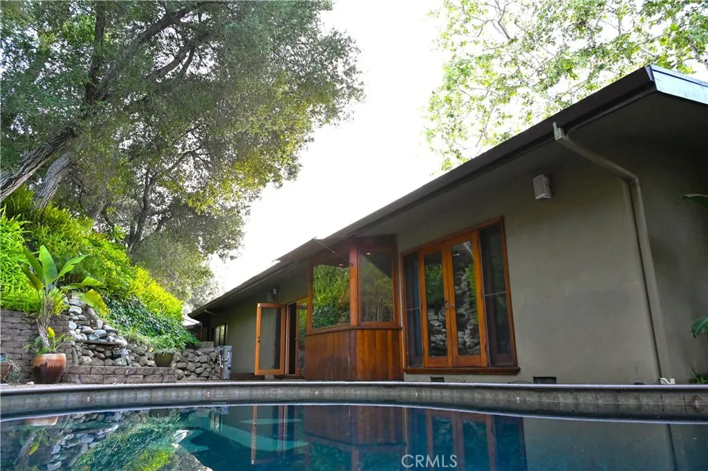 This gated, contemporary 3-bed, 2-bath home is located in a private cul-de-sac in the coveted Royal Woods neighborhood of Sherman Oaks. The turnkey home has been thoughtfully designed and meticulously maintained by its dedicated owner. The living and dining rooms feature a slate entryway and warm, hardwood floors complimented by an exposed, natural wood-beam ceiling, with integrated skylights, offering an abundance of natural light. Modern French doors throughout, offer more light and a seamless transition to the entertainer’s backyard; a tranquil retreat that hosts a dramatic, cascading waterfall, saltwater pool, and mature landscaping. The chef’s kitchen, designed for functionality and style, has granite countertops, light-wood cabinetry, stainless appliances, recessed lighting, and a built-in wine rack. The adjoining breakfast nook features a unique built-in fireplace integrated into a large, concrete-finished wall. The primary bedroom suite offers a warm, inviting palette and transitions effortlessly to the poolside patio. The primary bath features granite countertops, a granite-wrapped tub, and an expansive, natural-stone walk-in shower. There is a second, well-appointed bathroom and two secondary bedrooms; both share a private patio, finished with a wooden-framed bamboo fence and flagstone pavers. The home also boasts a bonus room (office/gym), utility room, 2-car attached garage, a large car-port , extra storage room, and interlocking, paved driveway. Easy Westside access and proximity to top-rated private and public schools, local parks, the Sherman Oaks Galleria and Fashion Square malls, and the best dining, shopping, and entertainment options of Ventura Blvd.