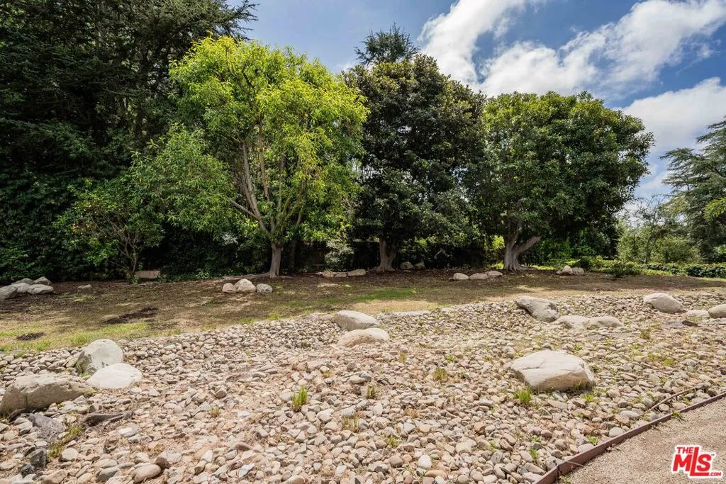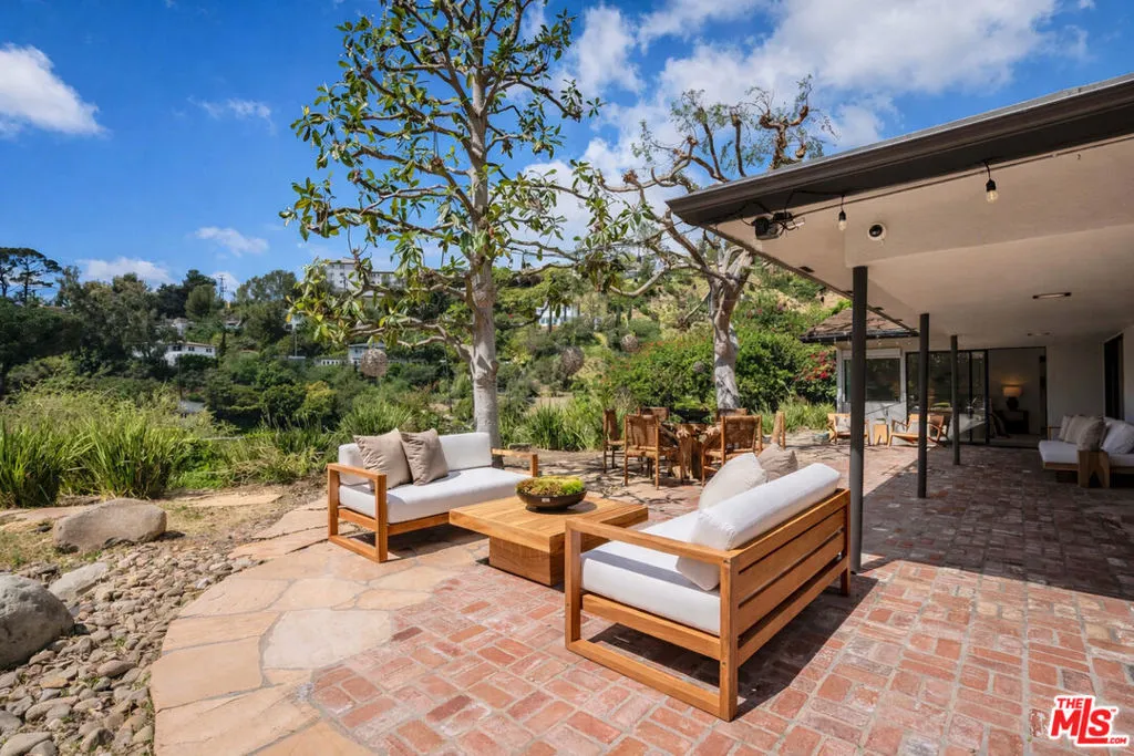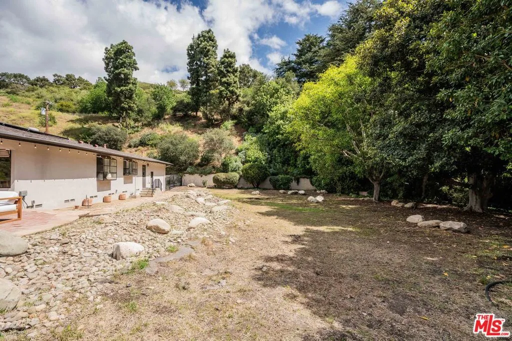 Stunning single-level Mid-Century Modern home situated at the end of a quiet cul-de-sac in the heart of Brentwood. This newly renovated 4-bedroom, 4-bath residence offers nearly 3,000 SF of light-filled living space on an expansive 3/4 acre double lot spanning over 32,000 square feet. A bright, open floor plan showcases a refined minimalist aesthetic with abundant natural light and seamless indoor-outdoor flow. The living room is anchored by a striking stone wall and dual-sided fireplace. Glass sliding doors open to a spectacular backyard retreat with sweeping hillside and canyon views. The dining room features a dramatic curved glass wall, enhancing the home's architectural appeal. The kitchen is thoughtfully designed with beautiful bay windows, custom cabinetry, granite countertops, ample storage and a charming breakfast area. The primary suite offers serene views, a private outdoor seating area, and spa-like bathroom with double vanity and oversized shower. What sets this property apart is the exceptional outdoor space. The oversized lot provides incredible privacy and serves as a blank canvas with endless potential. Ideal for a pool, guest house, sports court, lush lawn and customized outdoor living spaces. This large mostly flat lot has significant upside potential for future house expansion and development of outdoor amenities. Additional features include a full laundry room, attached 2-car garage with direct entry and fully-owned solar panels. Located in a peaceful and private setting with no homes across the street, only a quiet hillside just below the iconic Getty Museum. A rare opportunity to own a move-in ready modern home combining timeless design, privacy, and extraordinary potential.