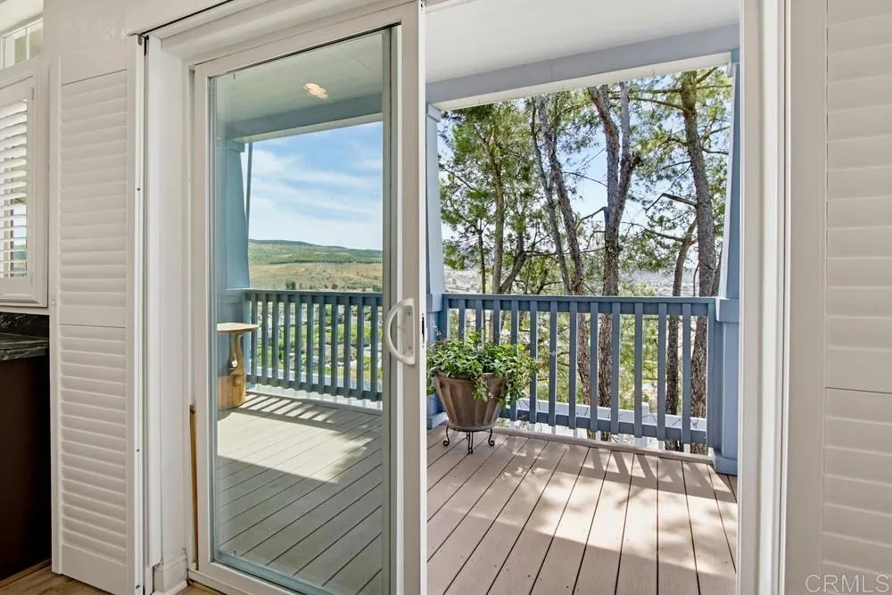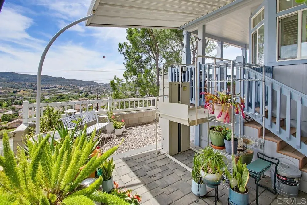 WELCOME HOME! Perched to capture an exceptional view of the surrounding mountains and valley, this beautifully maintained home offers a lifestyle that feels both peaceful and inspiring from the moment you arrive. Light pours in through tall shuttered windows, creating a warm and inviting atmosphere throughout the open-concept living space, where the kitchen, dining, and living areas flow effortlessly together. The kitchen is thoughtfully designed with stainless steel appliances, abundant cabinetry, pantry storage, and a large center island that naturally becomes the heart of the home. The living room features vaulted ceilings and a cozy fireplace, perfectly framing the stunning views beyond. The spacious primary suite offers a true retreat with a walk-in closet and a beautiful en-suite bathroom designed for comfort and relaxation. Step outside to enjoy multiple outdoor living spaces including a private “secret garden,” a low-maintenance fenced front yard, and an expansive covered deck where you can relax, entertain, and take in the scenery year-round. Additional highlights include paid-for solar, indoor laundry, a large storage unit, a covered carport with extended driveway, and a convenient lift providing easy access to the home. A golf cart is also available, adding to the ease of enjoying this vibrant community. Located in the highly desirable gated 55+ community of Lake Jennings Park Estates where you own the land and enjoy low HOA, residents have access to resort-style amenities including a clubhouse, pool, spa, fitness center, and more, all just minutes from Lake Jennings, hiking trails, shopping, dining, and a short drive to both the beaches and mountains.