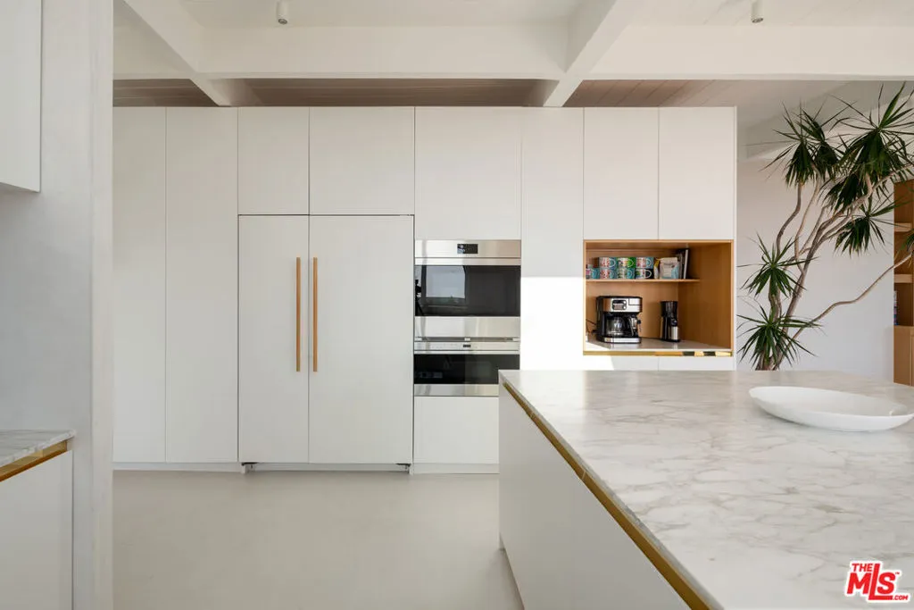 Set in coveted Marquez Knolls, this private 1960s Mid-Century residence has been meticulously restored with exceptional finishes and sweeping ocean views. Spanning approximately 3,503 square feet, the single-level 4-bedroom, 4-bath home offers seamless indoor-outdoor living. A dramatic entry opens to vaulted ceilings and abundant natural light throughout. The layout includes a formal living room with fireplace, separate family and dining rooms, and a chef's kitchen outfitted with high-end appliances and a large center island. The primary suite features a walk-in closet and spa-inspired bath with soaking tub, dual vanities, and walk-in shower. Extensive improvements enhance both the interiors and outdoor living spaces. The grounds have been thoughtfully reimagined with new concrete, updated gates and fencing, a pergola, garden shed, landscape lighting, irrigation, French drains, downspouts, refreshed soil and stonework, and an outdoor shower. The pool and entertaining areas have been completely upgraded with new equipment, plumbing, tile, plaster, and a custom BBQ with countertop and tile finishes, creating an ideal setting for year-round enjoyment. The entire property, including the home and surrounding walls, has been freshly painted and newly landscaped for a polished, cohesive presentation. Prior upgrades further elevate the home, including refreshed interiors, built-ins, upgraded lighting, refinished garage flooring, new electrical in the garage with Tesla universal charger, security cameras, updated bathroom hardware, installed TVs, improved sliding glass doors, and generator servicing. The home has been thoroughly remediated and professionally tested, offering a clean, move-in ready opportunity with documentation available. As the Palisades continues its revitalization, key landmarks are reopening including Palisades High School with the Village slated to return this summer, signaling strong momentum and renewed energy throughout the community. Ideally located near top-rated schools, dining, and coastal amenities, this home captures the essence of California living.
