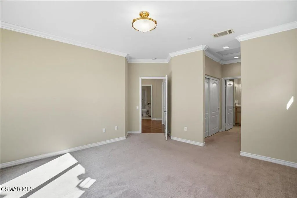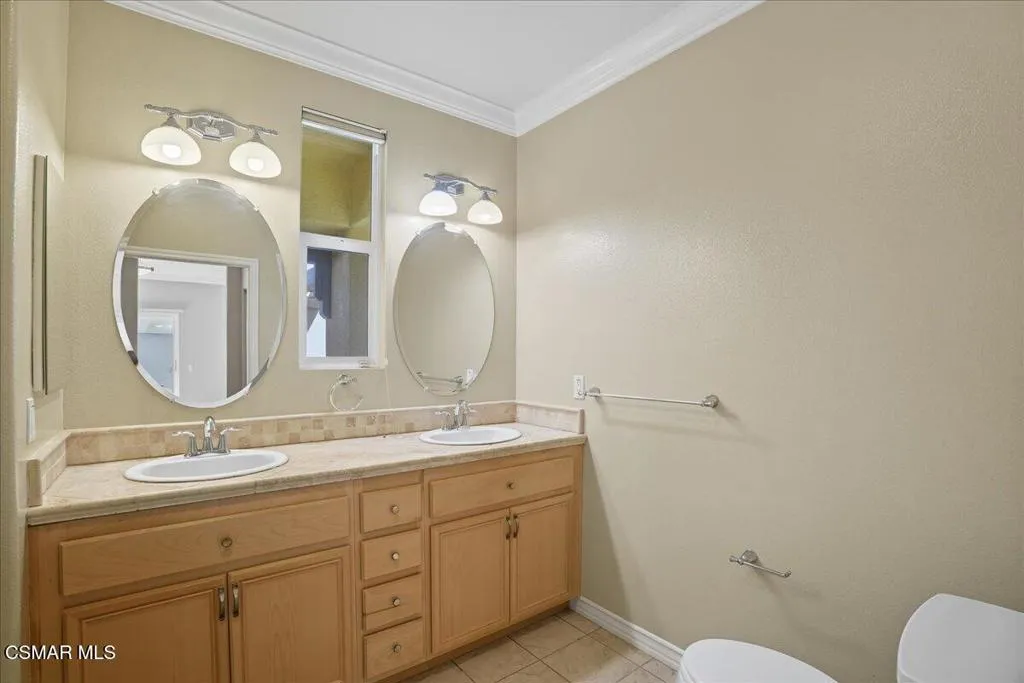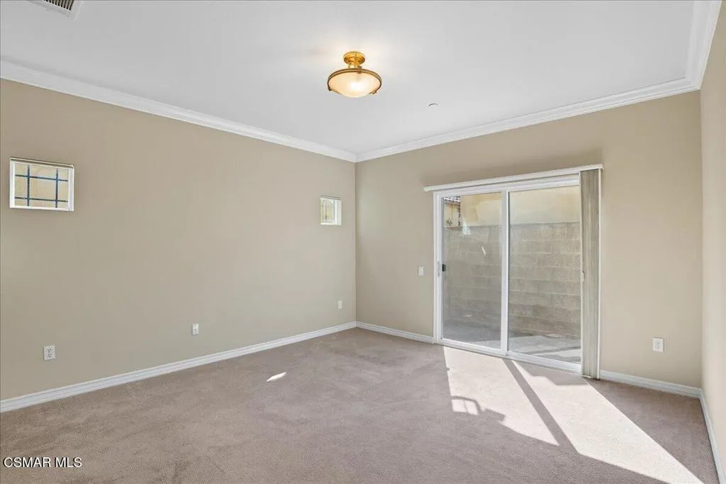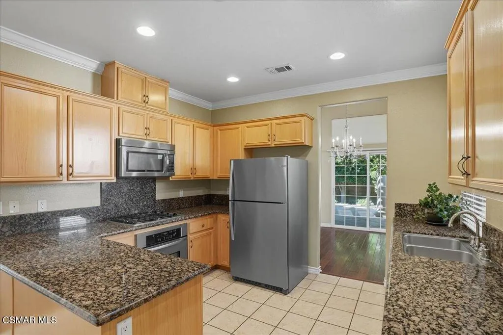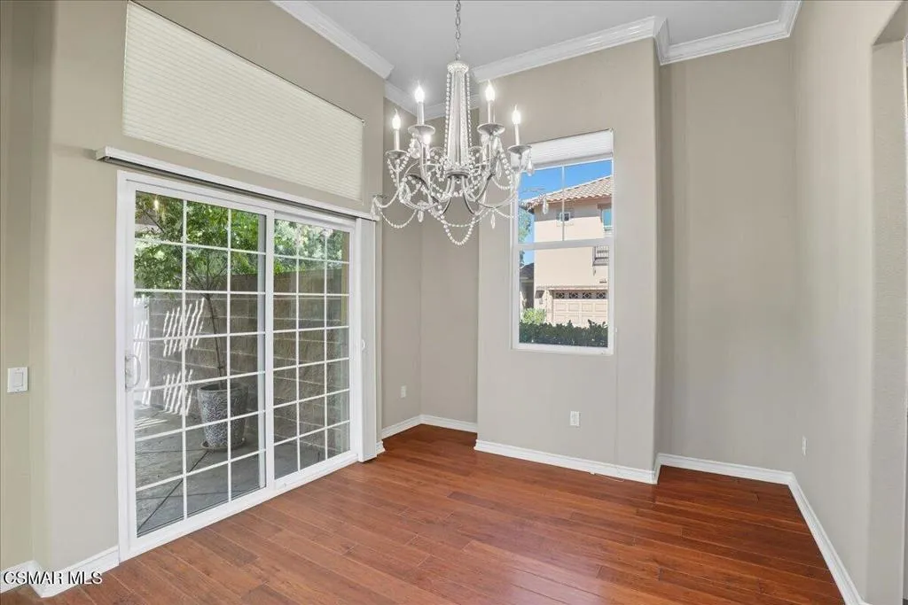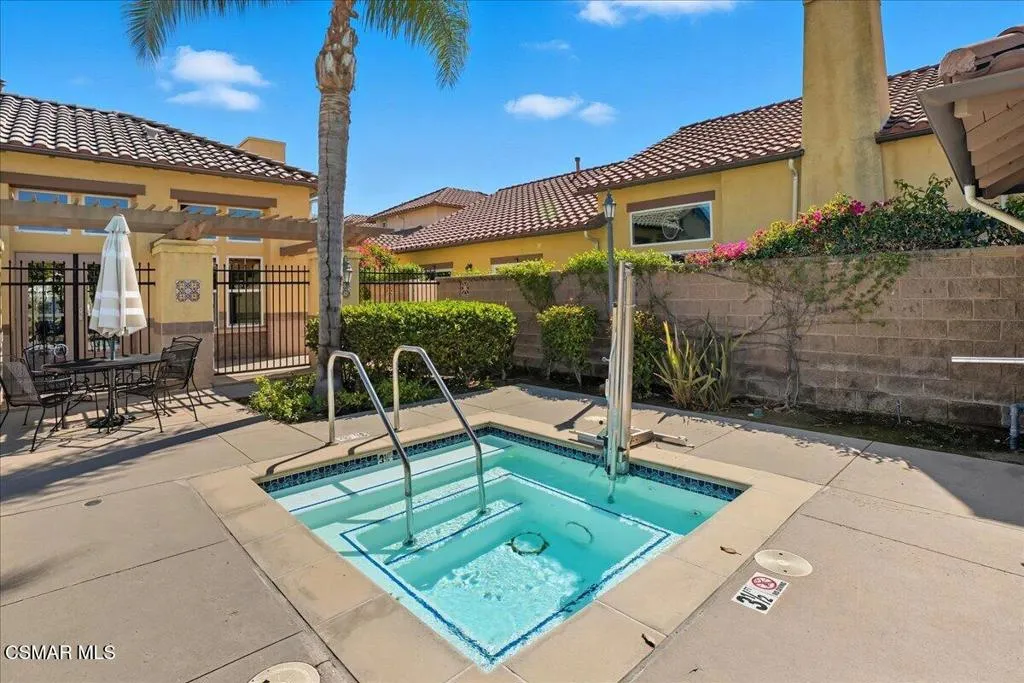 An Italian inspired sanctuary in the heart of Paseo de las Flores. Experience the pinnacle of single-story living in this meticulously upgraded residence--one of the larger and more private floor plans in Simi Valley's premier 55+ enclave. This home has no shared walls with other homes. Designed with the elegance of an Italian villa, this 1,537 sq. ft. home feels expansive thanks to soaring high ceilings, crown molding, and an abundance of natural light. Rich hardwood floors flow seamlessly from the formal dining room, centered by a lovely chandelier, into a stately living room featuring a decorative fireplace. Culinary enthusiasts will love the open kitchen, equipped with granite countertops, dual pantries, and premium stainless-steel appliances.A true highlight of the home is the ''private compound'' outdoor experience. Through sliding glass doors--fitted with custom Hunter Douglas treatments--you'll find a grand, wood-beamed patio supported by stately columns. Ensconced by a canopy of mature trees, this low-maintenance yard offers a secluded space to relax or entertain. Modern comforts and accessibility define the rest of the home, featuring a true zero-step entry, a spacious walk-in primary shower, and energy-efficient dual-paned windows. The home offers an indoor laundry area, a two-car garage with quality built-in cabinetry, and convenient direct interior access. The the gated community provides a pool, spa, and two clubhouses -one complete with a full catering kitchen, all just moments from Santa Susana Community Park, with nature pathways, shopping, and dining. This is more than just a home--it's your private retreat.
