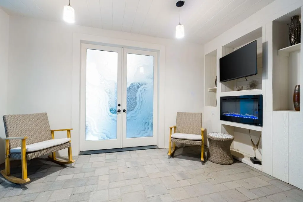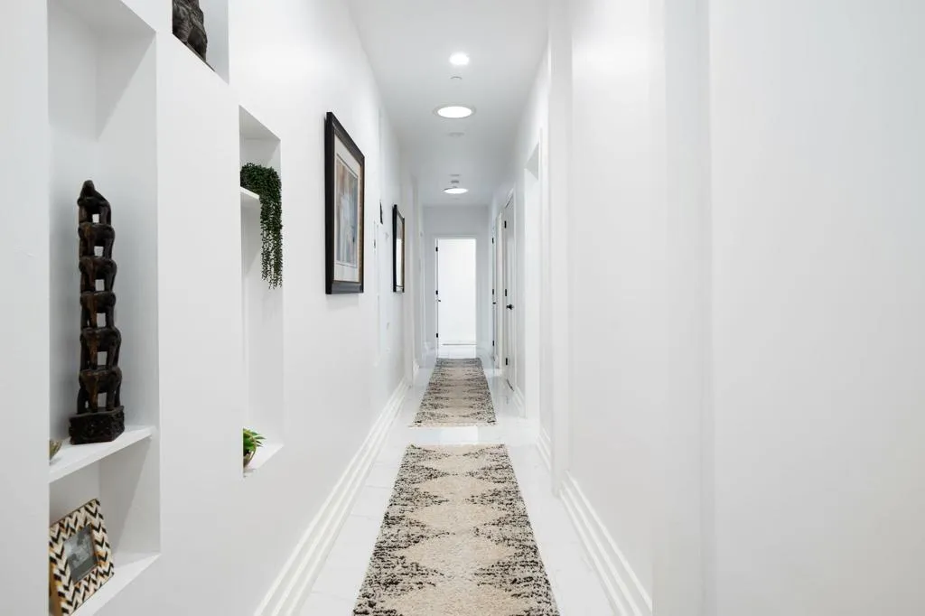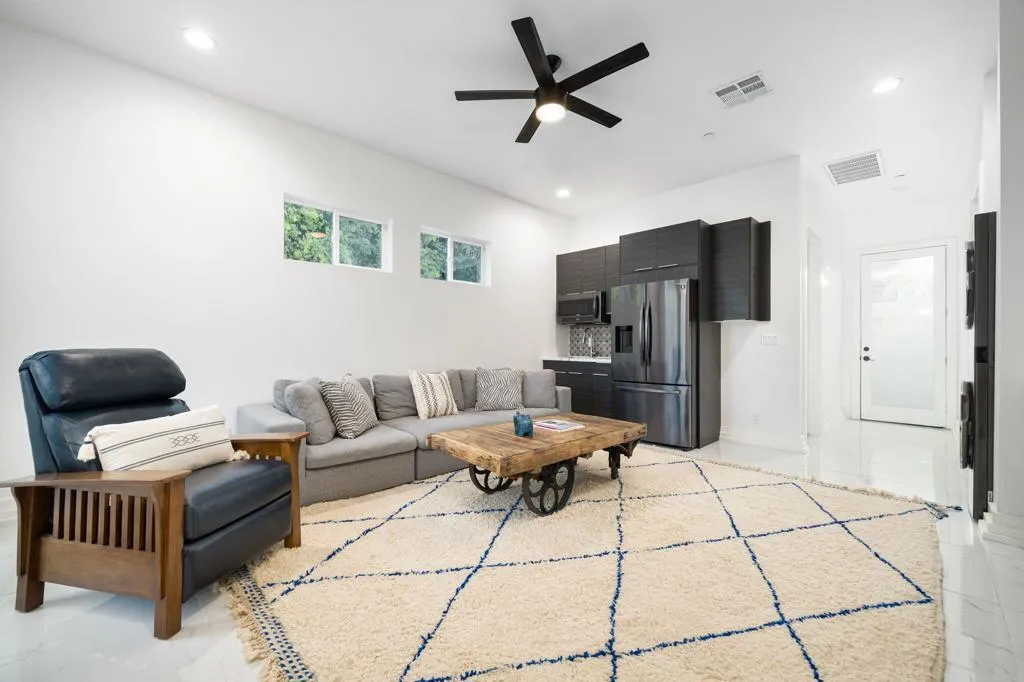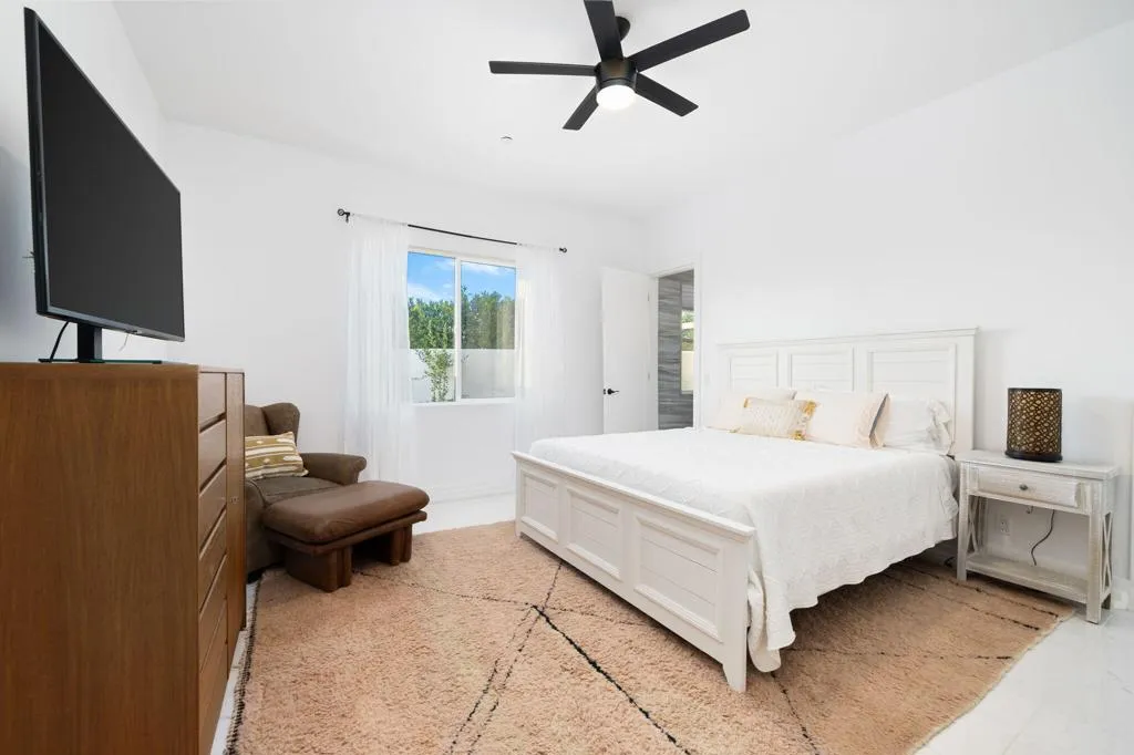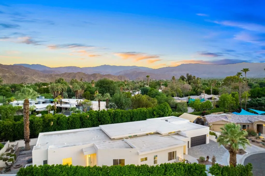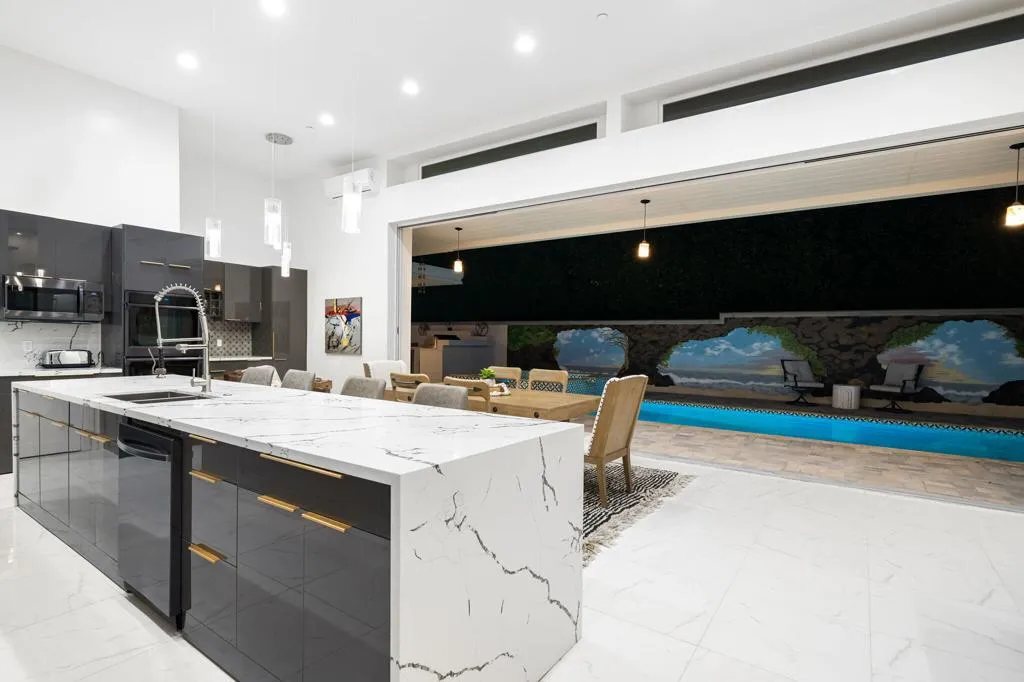 El Paseo shopping district, this nearly new custom home blends artistic style and opulent luxury in a generous single-level design. A private cul-de-sac homesite of nearly 10,019 s. f. reveals a pool and spa, custom mural, a fireplace and built-in BBQ. Custom etched-glass entry doors open to a spacious and welcoming great room that looks out to the pool and mural through massive slide away glass doors. Crowned by a high ceiling with clerestory windows, this fabulous space combines a living room with linear fireplace and custom built-ins, a dining room with wet bar, and a stunning European-inspired kitchen with custom high-gloss cabinetry, an oversized double-waterfall island with seating, quartz countertops, a full backsplash, walk-in pantry, and black-stainless Samsung appliances including a double-oven, French-door refrigerator and five-burner cooktop. Approximately 3,755 square feet, the home ensures comfort and privacy with five ensuite bedrooms and six baths. One bedroom is ideal for guests and boasts a kitchenette, washer and dryer and separate entrance. The primary suite opens to the outdoors via three sets of French doors and hosts a bar with wine refrigerator, a freestanding tub, walk-in rain shower, walk-in closet and LED mirrors. Embellishments throughout the residence include custom glass doors and shower enclosures, large-format porcelain tile, on-trend LED lighting fixtures, art niches and more. Flex Solar on property.