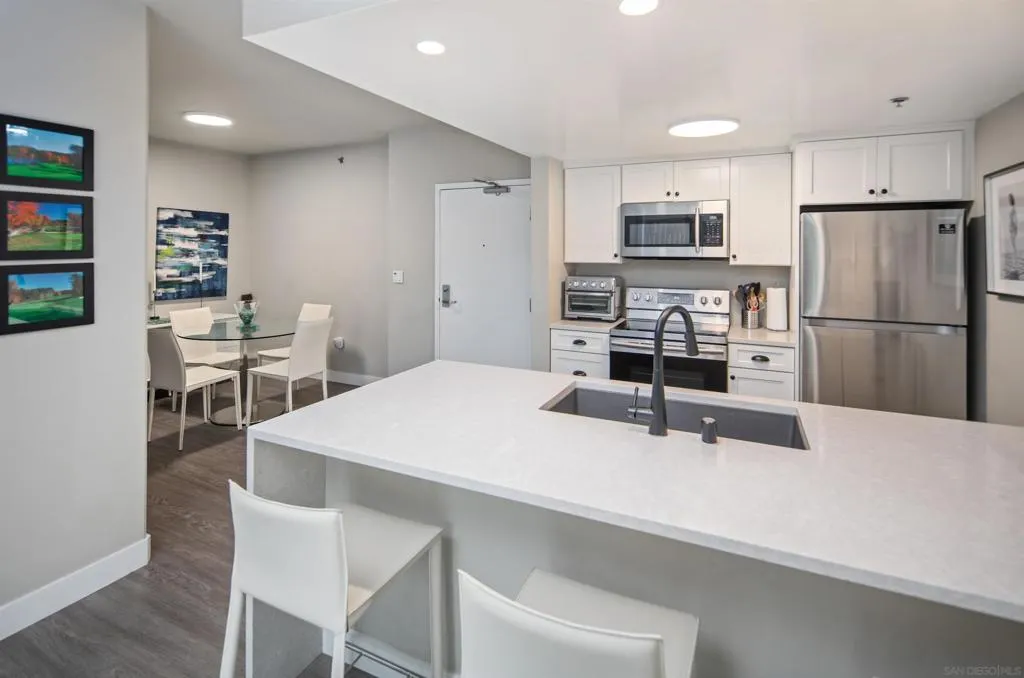 This beautifully renovated, south-facing two-bedroom at Acqua Vista is an incredible value. The residence was modified to open up the layout, with a fully remodeled kitchen, quartz countertops with waterfall edge, new cabinetry and new flooring throughout. Enjoy abundant natural light, a private balcony, and thoughtful upgrades that maximize space and flow. This home can be purchased furnished. Located in the vibrant Little Italy neighborhood, Acqua Vista was newly remodeled and offers valet parking, two lobbies, a fitness center, and a rooftop pool/spa terrace—all just steps from some of San Diego’s best dining and markets. Welcome to Acqua Vista, ideally located in the heart of Little Italy—one of Downtown San Diego’s most sought-after neighborhoods. Just steps away from the vibrant energy of India Street, this location offers access to some of the city's best local dining and weekend experiences. Enjoy mornings at the Little Italy Mercato, brunch at Morning Glory, or dinner at restaurants like Davanti Enoteca or Born and Raised. Beyond food, the community atmosphere, frequent events, and proximity to the San Diego Bay make this neighborhood one of the most dynamic places to live in the city. Acqua Vista recently underwent a stylish community update, featuring a fresh coat of exterior paint, refreshed common areas, new halls and lobby areas, and new pool terrace. Residents enjoy exclusive amenities including valet parking—an uncommon perk in the Downtown market—two lobbies, a fitness center, meeting room, and a rooftop-style pool and spa deck on the 8th floor. This south-facing two-bedroom home stands out with a layout that balances functionality and comfort. Unlike many residences in Acqua Vista, this home features a thoughtfully opened-up kitchen, bringing in light and creating seamless flow between the kitchen, dining, and living areas. The fully renovated kitchen includes quartz countertops with waterfall edge, new cabinetry, and new flooring that continues throughout the residence. A private balcony extends from the living area—an added bonus not available in all floorplans. This exterior-facing home enjoys abundant natural light throughout the day thanks to its southern exposure, and the positioning ensures greater privacy compared to courtyard-facing units. With its recent updates and smart design, this home offers a modern feel while maintaining the charm and convenience of Little Italy living.