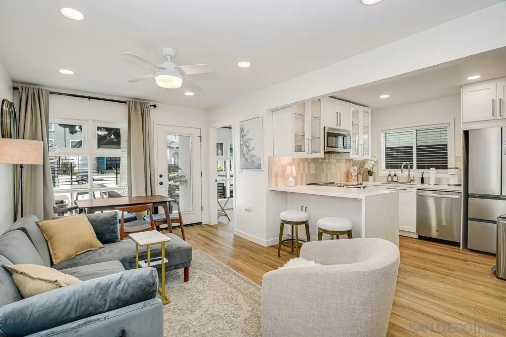Newly remodeled duplex in South Mission Beach! Walk into luxury, beach-living nestled between the beach and bay. 809 Dover Ct. at Dover Square come fresh off a remodel down to the studs, making this 1940s build truly come to life. The unit comes fitted with new stainless appliances, hard flooring, custom tiled kitchen and bathroom, in-unit laundry and a garage parking space. The unit is fully furnished with sleek, modern furniture. The property also offers communal sitting areas with fire pits and BBQs. Centrally located, this property is only one block to the bay and 2 blocks to the beach. Restaurants, shops and fun at Belmont Park are within immediate reach.
