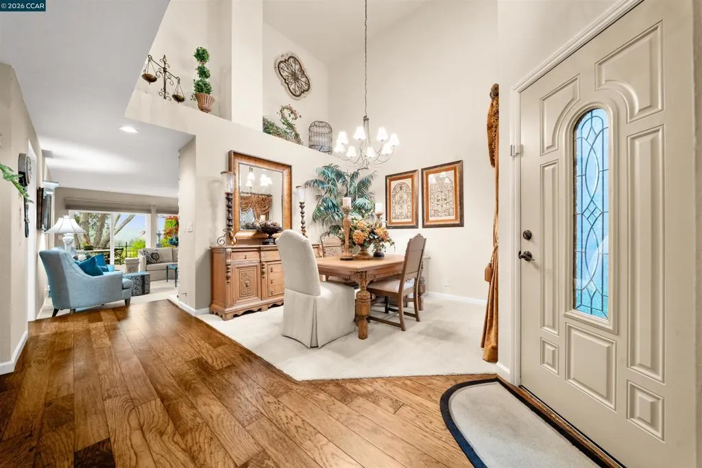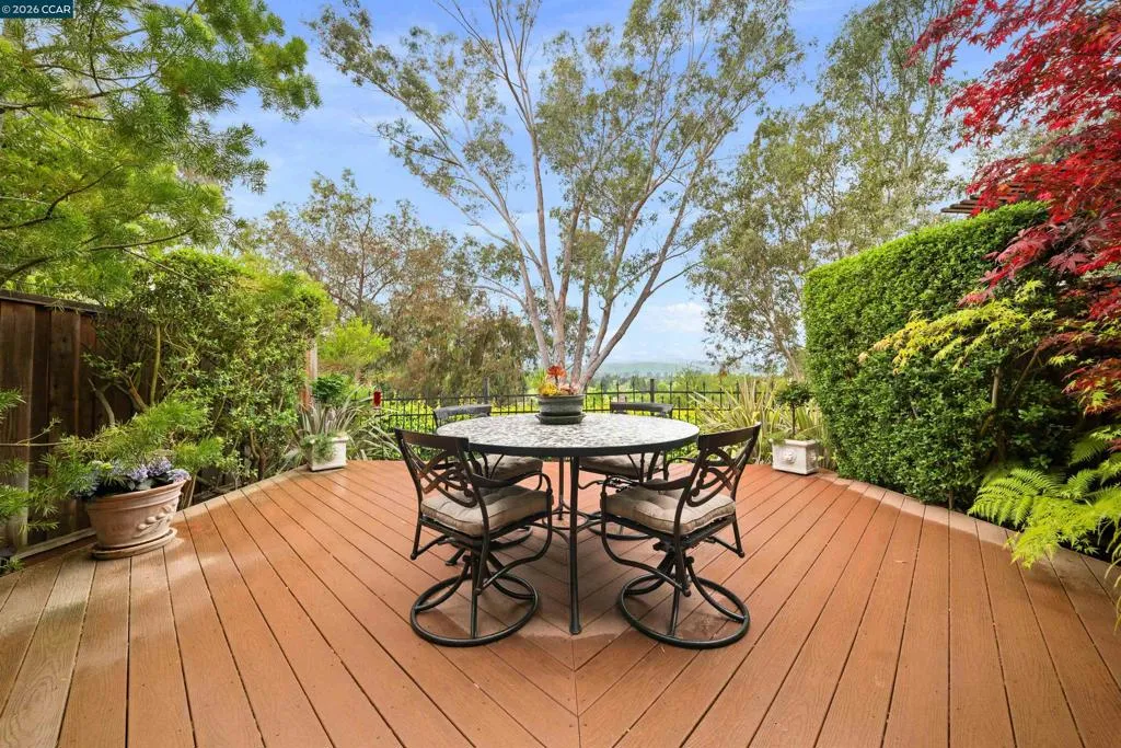 Ideally situated within the prestigious gates of Blackhawk, this beautifully remodeled residence offers a rare blend of sophisticated design and prime location. Enjoy the convenience of being walking distance to the premier dining and shopping at Blackhawk Plaza while backing to serene open space with direct access to scenic walking trails. The home makes a grand impression with a two-story foyer and formal dining area, accented by rich Hickory wood flooring throughout the main living spaces. The kitchen features premium quartz countertops, a bright eat-in area, and tranquil views. The heart of the home is a spacious living room centered by a fireplace that has been remodeled with natural travertine stone to the ceiling and custom built-in cabinetry. Retreat to the primary suite, a sanctuary boasting cathedral ceilings, a cedar-floored walk-in closet, and a masterfully remodeled spa-like bathroom with quartz countertops, dual sinks, a soaking tub, and an expanded shower. All bathrooms have been recently updated with quartz surfaces and modern hardware. Outside, a large Ever-grain composition deck overlooks the hillside with no rear neighbors for added privacy. Includes an attached garage with extensive storage, nearby guest parking, and access to community pool amenities.