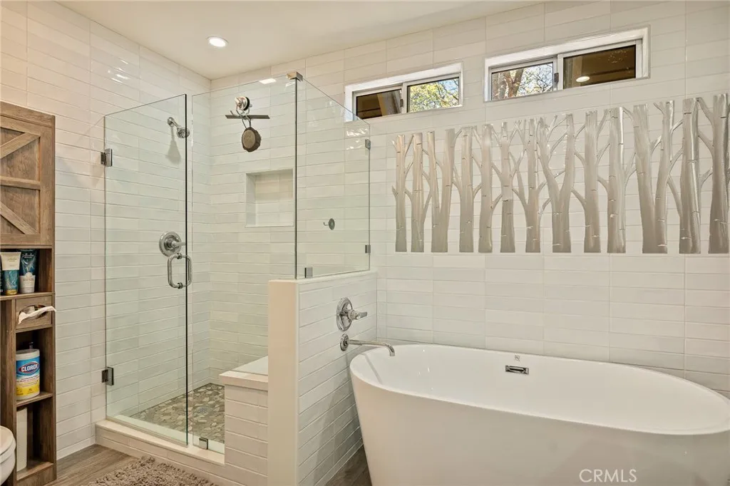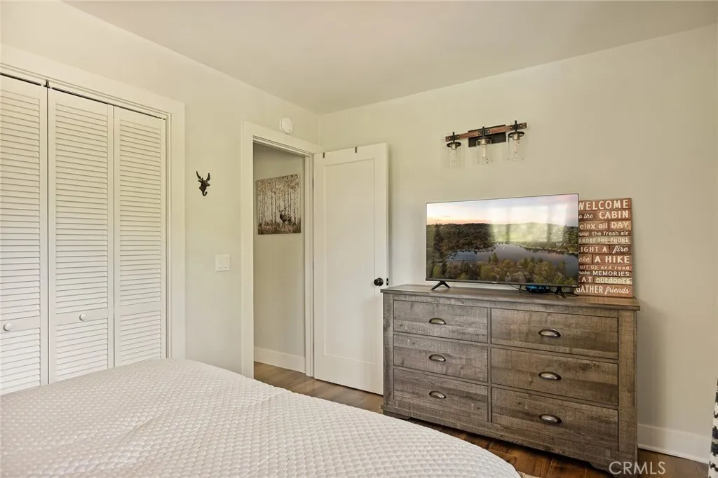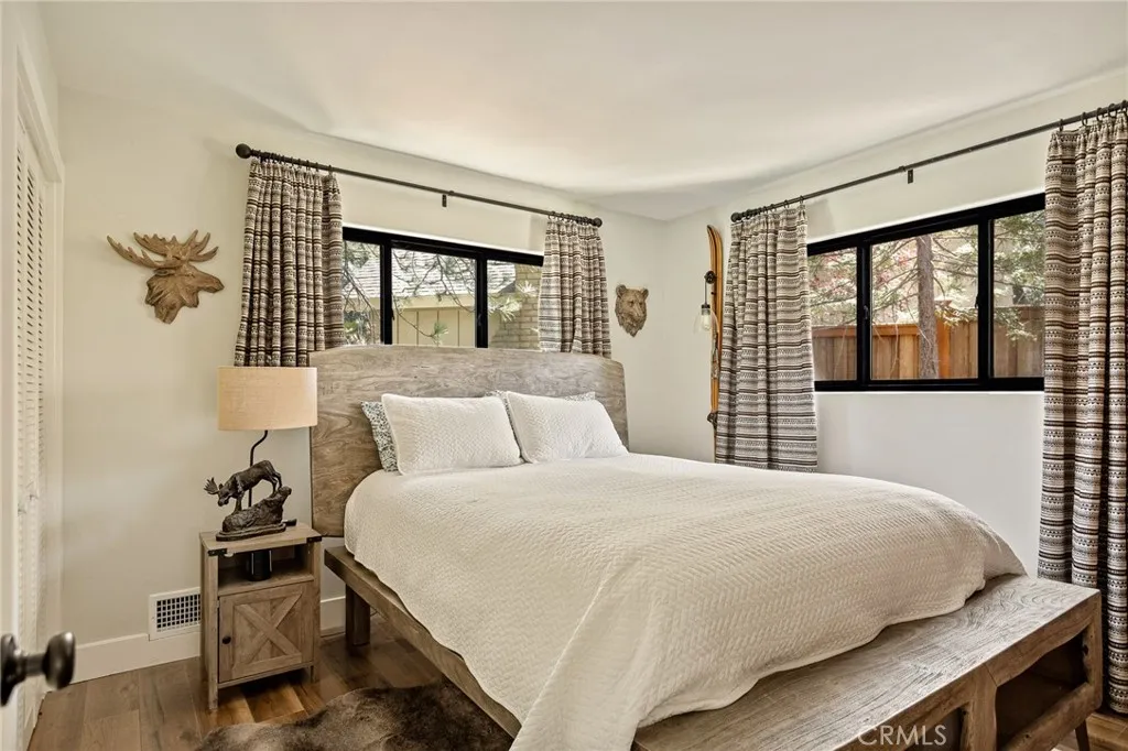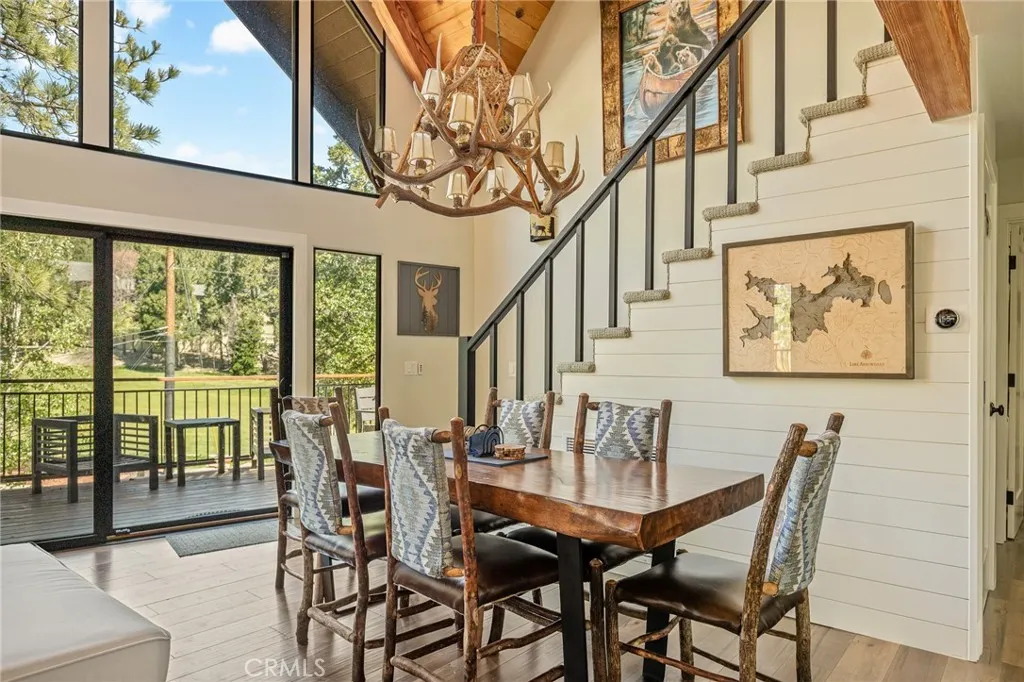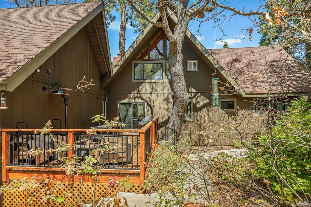 Welcome to your Modern Lodge retreat in the heart of Lake Arrowhead’s coveted Arrowhead Woods, complete with full lake rights. Ideally located within the prestigious Covenant and just a short stroll to the Lake Arrowhead Country Club, this beautifully updated home offers the perfect blend of mountain charm and modern comfort—set directly across from the fairways with serene golf course views. Positioned just one quiet street away from the greens, this property offers a rare opportunity to enjoy the feel of golf course frontage—without being directly on it. With only a lightly traveled road separating you from the course, you’ll enjoy open, peaceful views paired with added privacy. Recently enhanced the home showcases expanded tongue-and-groove wood detailing throughout, adding warmth and authentic lodge character. Additional upgrades include a newly widened driveway with an extra concrete parking pad, a custom-built bunk room, and landscaping improvements that enhance both curb appeal and outdoor living. Spanning approximately 2,168 sq ft, the layout is both functional and highly desirable. Three bedrooms—including the primary suite—are located on the main level, a rare feature in Lake Arrowhead. The primary suite offers direct deck access, while the additional bedrooms make single-level living easy and convenient. Upstairs, a loft and dedicated bunk room guest space create the perfect separate retreat for kids or guests—ideal for games, movies, and their own hangout zone. The home is filled with warmth and style, highlighted by exposed wood beam ceilings, hardwood and tile flooring, and large sliding glass doors that seamlessly connect indoor and outdoor living. The open-concept living, dining, and kitchen area is perfect for both entertaining and everyday enjoyment. Step outside to the expansive deck and fenced private backyard—ideal for pets or children—offering a safe, usable space rarely found in this setting. Enjoy peaceful golf course views alongside a private, upgraded outdoor environment designed for relaxing or entertaining year-round. Additional features include air conditioning, a 2-car garage plus golf cart space, and close proximity to Lake Arrowhead Village, trails, beaches, dining, and shopping. Turnkey, thoughtfully upgraded, and offering a rare combination of golf course proximity, functional layout, and usable outdoor space—this is a standout opportunity in one of Lake Arrowhead’s most sought-after neighborhoods.