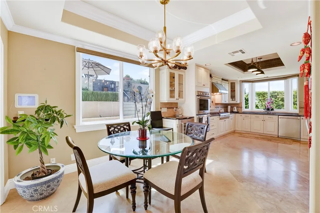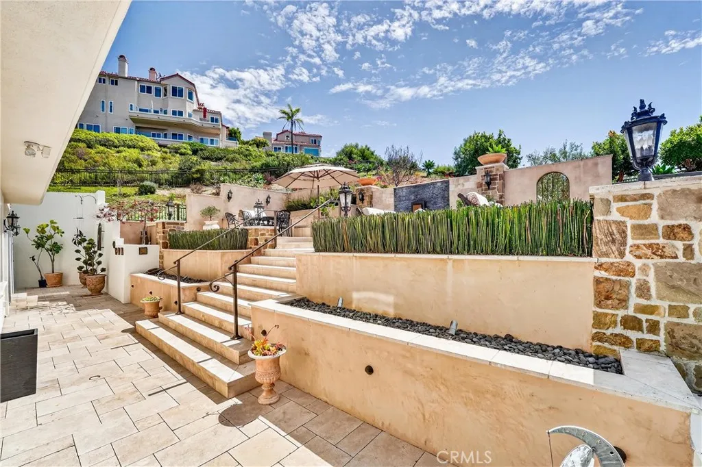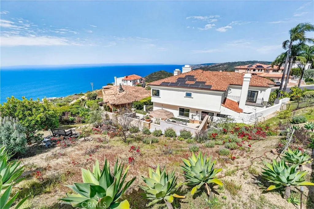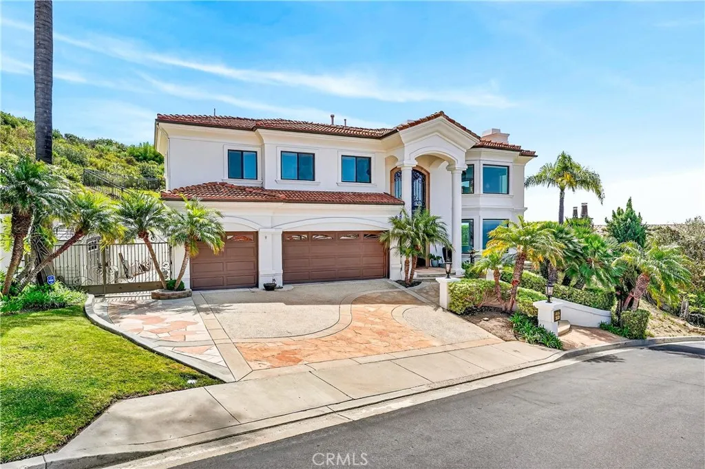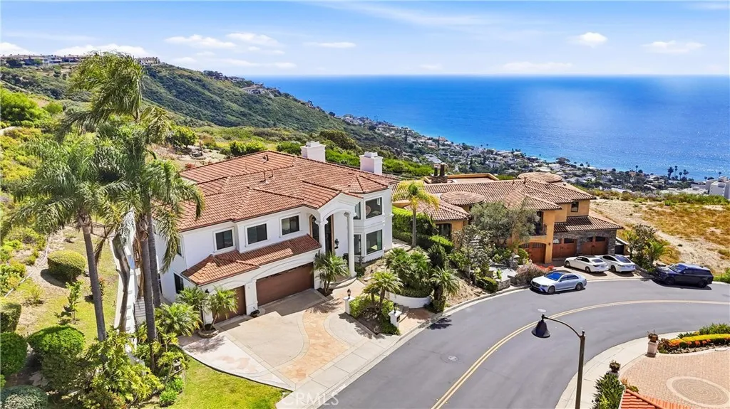 Set behind the gates of Laguna Sur, this remarkable estate showcases sweeping ocean, Catalina Island, and coastline views extending toward Palos Verdes. The residence offers a thoughtfully designed two-level floor plan with generous living spaces and an easy, open flow ideal for both everyday living and entertaining. The home makes a striking first impression with a custom entry featuring 10-foot-tall custom wrought iron doors with a 6-foot wrought iron window arching above. These doors open to a dramatic foyer with soaring ceilings and a distinctive circular marble design. Architectural elements throughout include graceful archways, statement columns, and expansive windows that highlight the views. Designer lighting and a sophisticated combination of wood and travertine flooring complete the space. A custom wrought iron staircase adds to the home’s refined character. The layout includes five bedrooms and four and a half bathrooms, along with a formal dining room and an inviting family room complete with a 15-foot built-in showcase-bookcase. Natural light fills the interior, enhancing the sense of space and drawing attention to the stunning coastal scenery. Upstairs, a versatile loft overlooks the main entry area below and captures beautiful ocean views. It is ideal for a lounge, office, or media space. Thoughtful enhancements elevate the home throughout, including an expansive backyard deck designed for outdoor entertainment and relaxation. The kitchen has been beautifully redone with updated finishes and appliances, creating a functional and stylish centerpiece. The primary suite has been upgraded with a redesigned closet and a refined bath retreat, offering a spa-inspired experience. Additional improvements include updated lighting throughout, refreshed fencing for added privacy, and an enhanced entryway that complements the home’s architectural appeal. A fully integrated solar system with 3 Tesla Powerwalls provides impressive efficiency and can power the entire home, including both air conditioning systems, off-grid. Located within the highly sought-after Laguna Sur community, this home presents a rare opportunity to enjoy coastal living with impressive views and refined, move-in-ready upgrades.