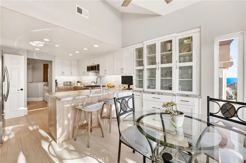 Experience elevated coastal living in Laguna Sur, a guard gated community with 24 hour security, offering privacy and peace of mind. From the moment you enter, you are greeted by breathtaking ocean views, walls of windows, and an abundance of natural light, with daily sunsets over the Pacific and Catalina Island enjoyed from the main living areas and expansive outdoor deck. The beautifully remodeled kitchen is a true focal point, featuring leathered granite countertops, a wine refrigerator, and a sophisticated wet bar, flowing seamlessly into the dining area where expansive glass enhances the indoor outdoor connection. Sliding doors open to a spacious deck with stairs leading to an oversized backyard on a desirable corner lot, designed for entertaining with a large island for cooking and gathering and multiple access points from both the kitchen and the downstairs primary suite. The living area is anchored by a redesigned fireplace that makes an immediate impression, complemented by light porcelain tile flooring and thoughtful storage throughout. The flexible floor plan offers three bedrooms plus a loft or office with a built in desk, including two separate primary suites with ensuite baths and ocean views, positioned apart for ideal privacy, with the downstairs primary offering direct backyard access. The property offers exceptional parking with the ability to accommodate up to six vehicles between the garage and driveway. Residents enjoy resort style amenities including two pools, spas, tennis courts, pickleball courts, and scenic walking trails extending to Laguna Beach. With remarkable views, functional design, and exceptional indoor outdoor living, this home captures the essence of Laguna Sur living.