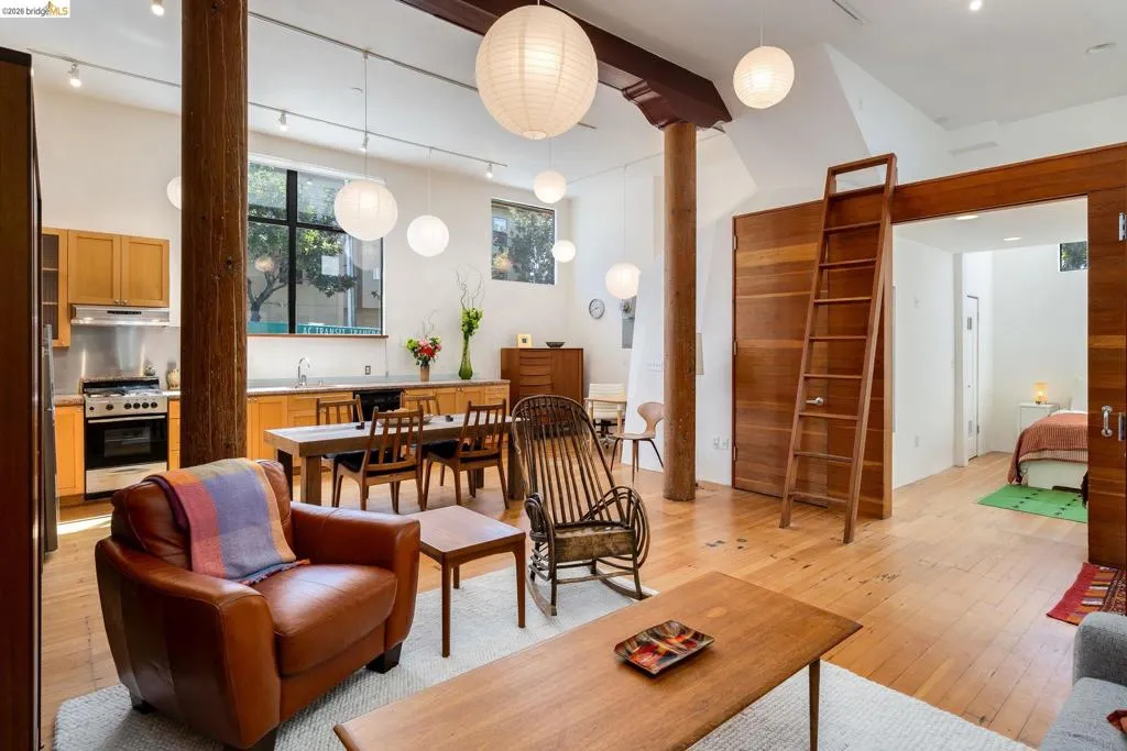 Come experience this thoughtfully designed condo located in an award-winning 9-unit community that seamlessly blends Salvaged, Recycled, and Low-Toxic finishes with a one-of-a-kind design. Step inside to a 13-foot ceiling. The expansive south-facing windows, skylight, and tall glass fill the interior with natural light. Original Douglas Fir floors and pillars, custom woodwork, and vintage Danish teak built-ins add warmth and character. The Chef’s Kitchen features maple cabinetry and unique countertops made from recycled traffic light glass. A handcrafted Douglas Fir dividing wall has a barn door to the bedroom, a 9-foot flush-hinged door to the bathroom, and an integrated ladder for access to the loft above. The artistic bathroom showcases a geometric hand-troweled finish, a whimsically crafted sink, and Vermont green slate tile. Additional highlights include In-unit Laundry, curated lighting, Solar, and a very large Exterior Storage Space. Dual-paned windows and Well-Insulated Walls provide a quiet interior, yet it's close to everything Berkeley has to offer! UC Berkeley, BART, and vibrant shops & restaurants. First time on the market since its condo conversion and redevelopment in 2001. It's an exceptional opportunity within this signature project. WalkScore 87 & BikeScore 94!