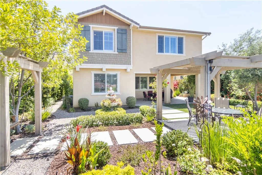 Built in 2017, this beautifully upgraded Lennar Plan 3 home offers 4BR/3BA, including a convenient downstairs bedroom. Ideally situated on a quiet street, the property enjoys fabulous city and hillside views. The interior showcases beautiful tile flooring, designer paint colors, dramatic cabinetry, granite countertops, a walk in pantry, and custom lighting. The open concept layout features an abundance of natural light with custom plantation shutters and modern finishes that flow seamlessly into the living areas. The large primary suite has gorgeous city and hillside views. The Primary bath is like a elegant spa experience with light colored custom tile, quartz counters and shower w/custom backsplash, dual vanity and an large walk in closet. Step outside to a private, park-like backyard complete with lush landscaping, a covered patio, and tranquil hillside views-perfect for relaxing or entertaining. Located near hiking and walking trails, this home combines comfort, style and an outdoor lifestyle. California living at its Best!