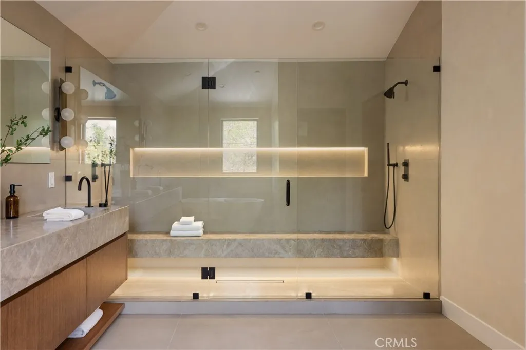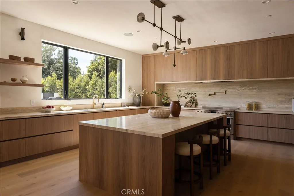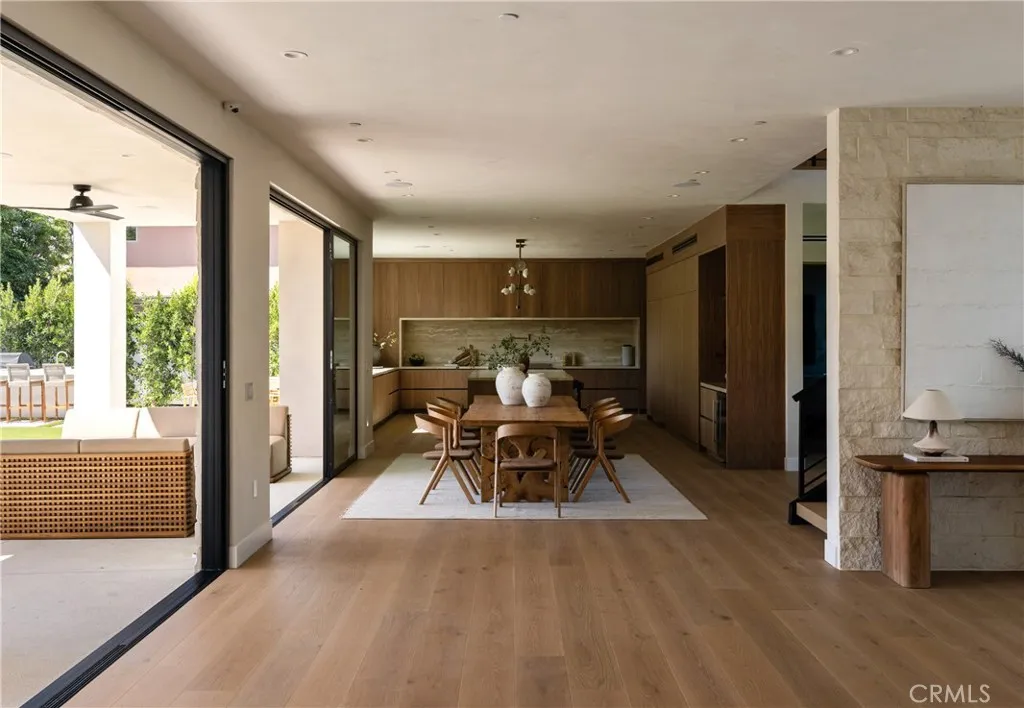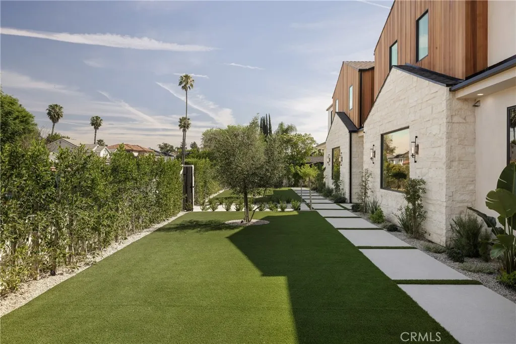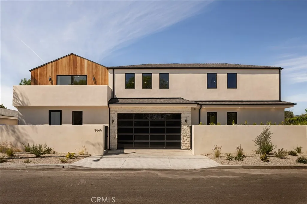 Situated behind private gates on a sprawling 9,000+ sq. ft. corner lot, this newly constructed architectural estate boasts an attached 1-bed, 1.5-bath ADU. Designed for modern living, the open-concept main level flows seamlessly from the spacious living and dining area into the gourmet chef’s kitchen, outfitted with professional-grade appliances, sleek custom cabinetry, a massive island and walk-in pantry. Two oversized sliding glass doors effortlessly extend the living space to the covered patio, creating a seamless indoor-outdoor living experience. The backyard is a true entertainer’s retreat, showcasing a resort-style pool and spa, fully equipped outdoor kitchen and privacy hedges that surround the property. Completing the main level is an ensuite bedroom and chic powder bathroom with a one-of-a-kind stone sink. On the upper level, you’ll find four generously sized ensuite bedrooms, a dedicated laundry room and spacious loft area that leads out to an expansive balcony. The luxurious primary suite features a custom walk-in closet and sumptuous ensuite with a soaking tub, large glass-enclosed shower and double vanity. The ADU offers exceptional versatility with its own private entrance, a living room, full kitchen, one bedroom and two bathrooms, perfect for guests, extended family or as additional living space. Further highlights include high ceilings throughout, a two-car garage and fully integrated smart home system that manages lighting, climate, audio and security. Ideally located within the top-rated Kester Avenue Elementary School District, just moments away from Ventura Boulevard’s premier shops and restaurants, as well as the Sherman Oaks Galleria.