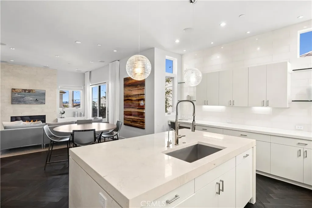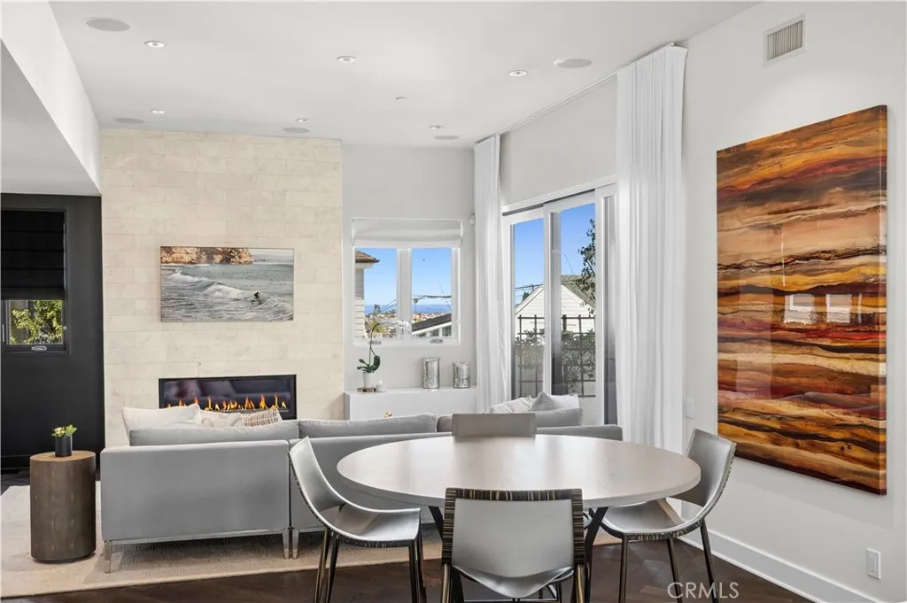 In the coveted Flower Streets, this custom 3-bedroom, 3.5-bath, fully furnished, residence crowns an idyllic 45-foot-wide corner lot with sweeping views of the Pacific Ocean, Fashion Island, and the Pelican Hill Golf Course. An architectural showpiece, the home is defined by its dramatic 3-story steel, wood, and frameless glass staircase, a striking centerpiece that sets the tone for refined living throughout. Hardwood herringbone flooring carries a timeless elegance across each level. The main living level unfolds into a spectacular great room with 10-foot ceilings, anchored by a floor-to-ceiling marble fireplace. Host in the custom serving area complete with ice maker, wine and mini-fridge, or a chef’s kitchen with impressive marble and limestone countertops, a glass tile backsplash, a professional Thermador range refrigerator/freezer. Expansive sliding glass doors open to a private balcony, blending indoor and outdoor living. Also on this level are a sunlit guest suite and a designer powder room. The upper level is devoted to a grand primary retreat, where walls of closets and a spa-inspired bath evoke luxury at every turn. A spacious deck offers a private jacuzzi and unrivaled panoramic vistas. On the entry level, a guest suite with full bath, a large laundry area, and a garage plus double carport adds both comfort and convenience. Smartly designed with Nest-controlled climate, integrated iPhone-controlled speakers, and thoughtful details throughout, this home offers the perfect balance of modern sophistication and timeless coastal style.