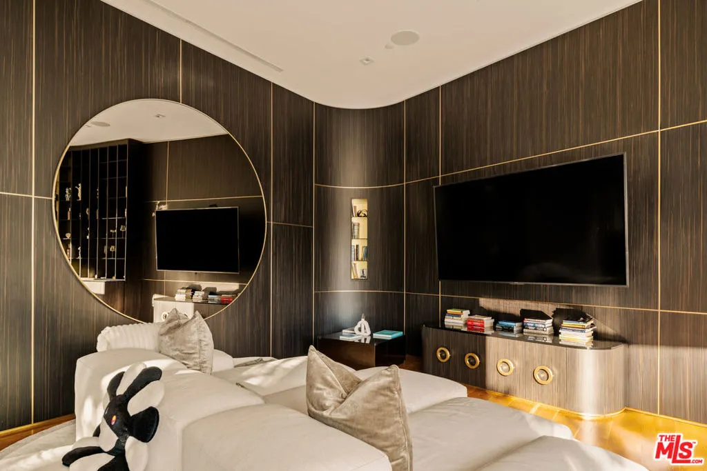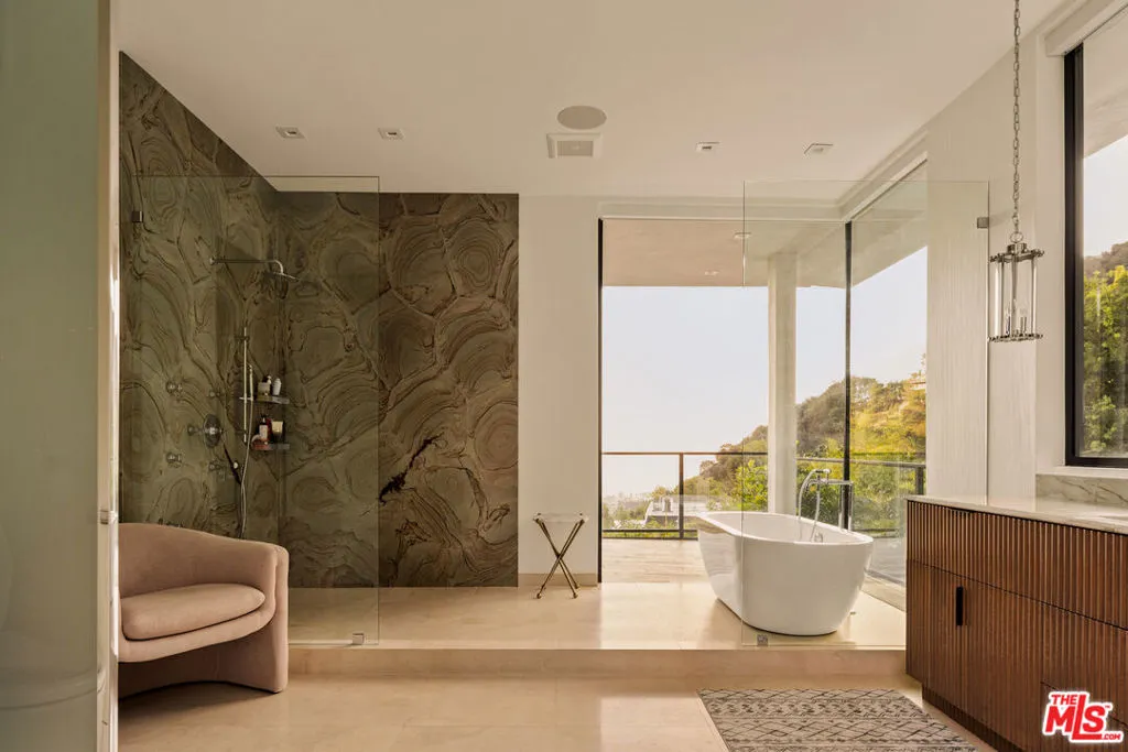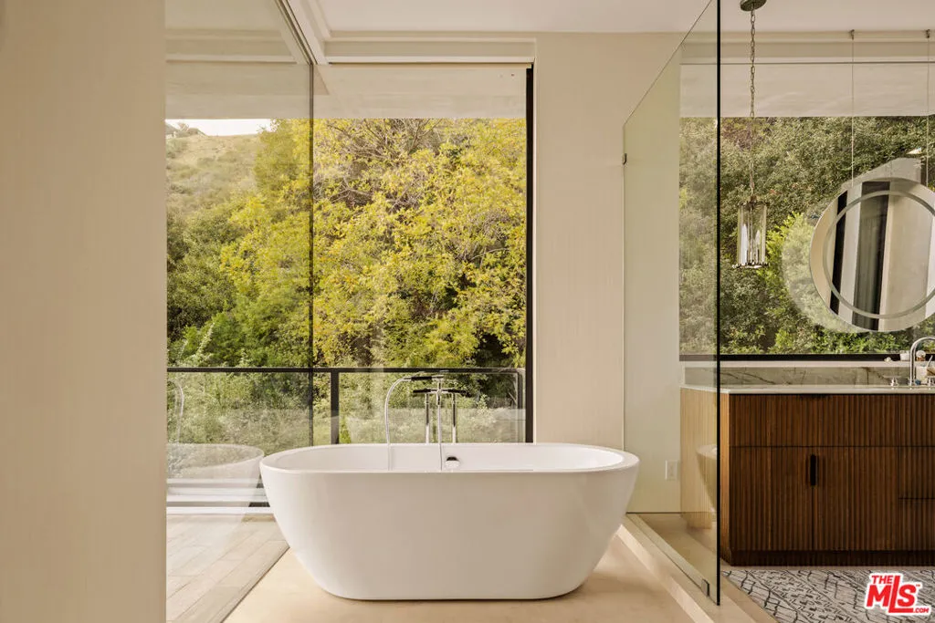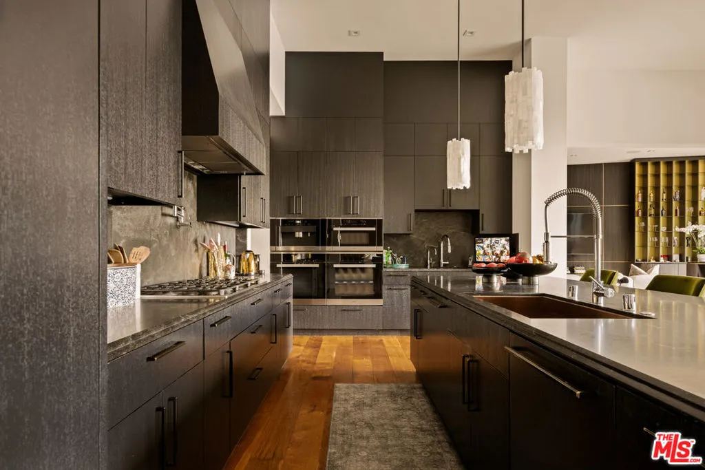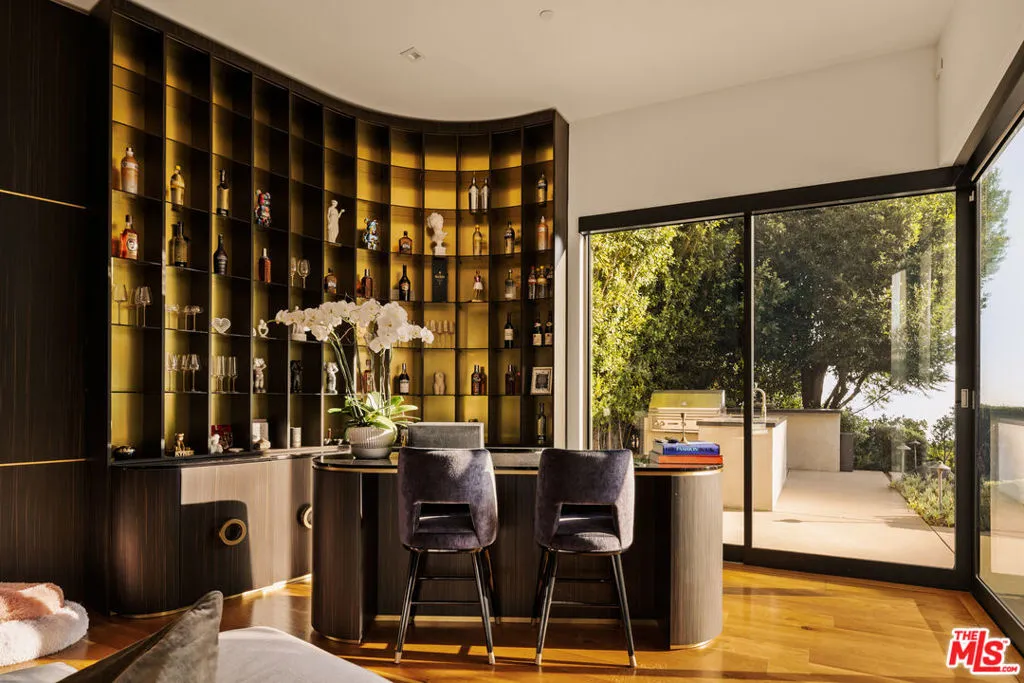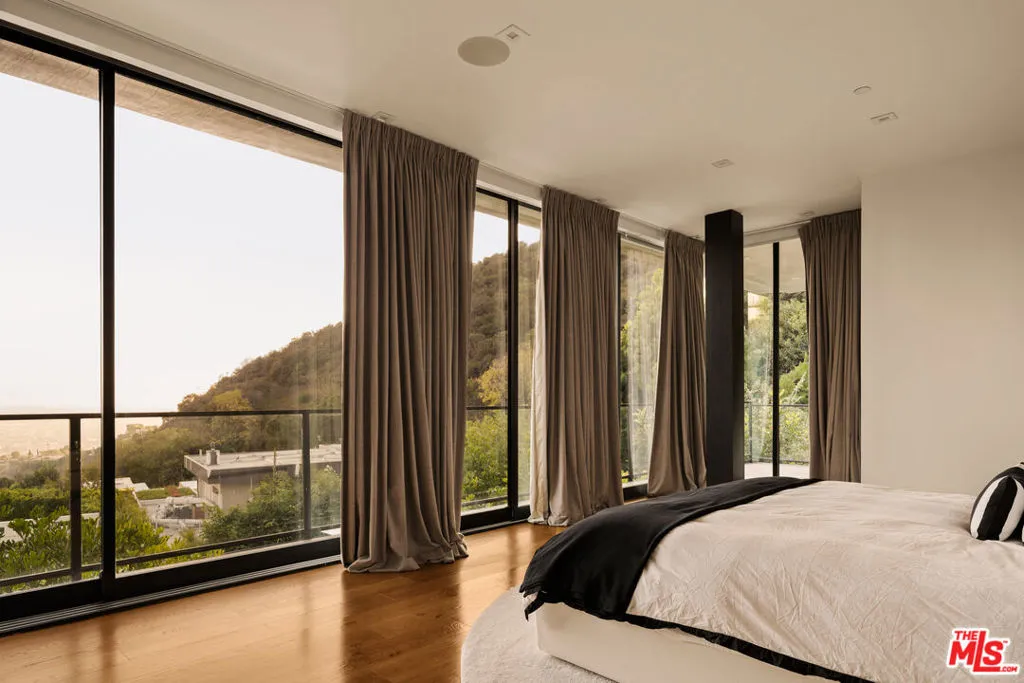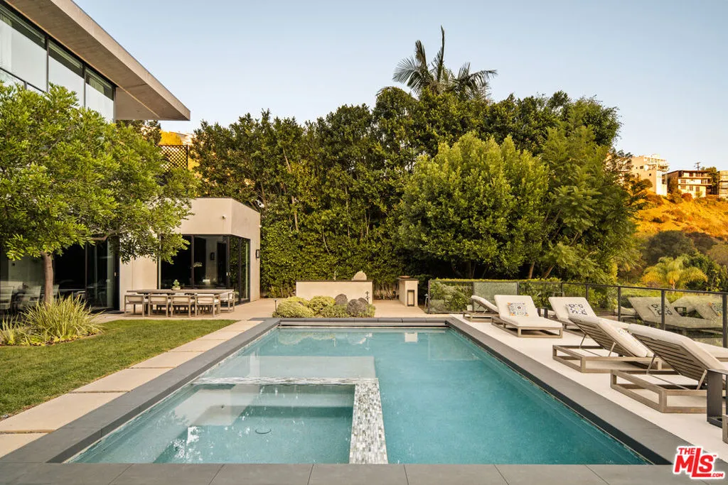 Warm contemporary architecture beautifully melds sophistication with simplicity and elegance. Gated and hedged for complete privacy, this newly reconstructed compound is designed with incredible attention to detail. Stunning city and canyon views are enjoyed from nearly every vantage point, while lush hedging and multiple gates ensure total seclusion. An open floor plan with soaring ceilings, lined by massive Fleetwood doors, delivers exceptional indoor-outdoor living and abundant natural light. A sleek chef's kitchen comes replete with an impressive island, dual copper sinks, Miele appliances, and custom cabinetry with black marble countertops. The primary suite occupies the entire upper level and encompasses an art gallery, a double-bath suite, showroom size closet, and multiple terraces to soak in the breathtaking views. The expansive backyard serves as a tranquil retreat complete with a large pool and spa, grassy yard, outdoor BBQ and kitchen, and ample space for entertaining.