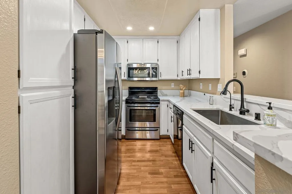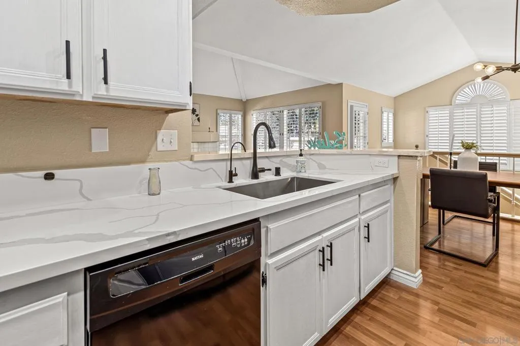 Tucked away at the end of a quiet cul-de-sac in the highly desirable Belsera community, this private 2-bedroom, 2-bath end unit offers the perfect blend of comfort, light, and lifestyle. With soaring ceilings and an open-concept design, the home feels bright and spacious from the moment you walk in, while its west-facing orientation helps keep the interior cooler during warmer months. The kitchen was updated in 2025 with refreshed quartz countertops, painted cabinetry, new sink and faucet, & upgraded lighting, opening seamlessly to the main living space ideal for both everyday living & entertaining. Additional improvements include fresh interior paint, brand new carpet, & a water heater and pressure regulator replaced in 2023. The bathroom was also upgraded in 2023 with new countertops, fixtures, glass shower doors, & a refinished tub, creating a clean & modern feel. Large windows bring in abundant natural light, while the elevated private balcony positioned above neighboring units offers a peaceful space to relax or host, overlooking greenspace and a seasonal creek during rainfall. Additional features include air conditioning, an attached one-car garage, a second assigned parking space, & in-unit washer and dryer. The home also benefits from a quiet setting, great neighbors, & a level of privacy that is hard to find. Residents of Belsera enjoy resort-style amenities including two swimming pools, picnic and BBQ areas, volleyball courts, scenic walking paths, and direct access to Mission Trails Regional Park—bringing an active, outdoor lifestyle right to your doorstep.