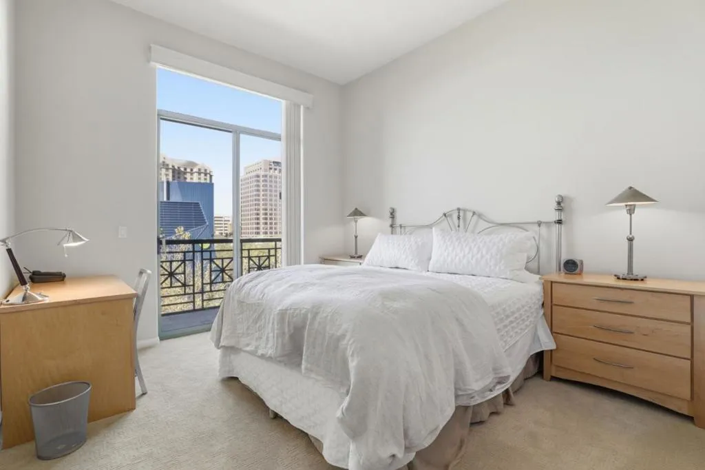 Desirable penthouse at Paseo Plaza in downtown San Jose. Rarely lived in as a private city retreat, this residence offers impressive skyline views and an elevated setting. Spacious living and dining area with marble-trimmed gas fireplace and wet bar ideal for relaxing or entertaining. The primary suite features balcony access, a large walk-in closet, and bath with dual vanities and shower-over-tub. Bright kitchen with minimal use and a recently purchased oven. Additional highlights include abundant natural light, in-unit laundry, and one deeded parking space. Paseo Plaza has completed major upgrades including a new roof, updated water system and boilers, and modernized garage gates and elevators. Secure community with pool, spa, fitness center, lounge, and landscaped courtyards. Prime downtown location near City Hall, MLK Library, SJSU, Caesar Chavez Park, San Pedro Square, dining, eateries, Caltrain, VTA Light Rail, SAP Center, Highways 280 & 87, and Mineta San Jose International Airport.