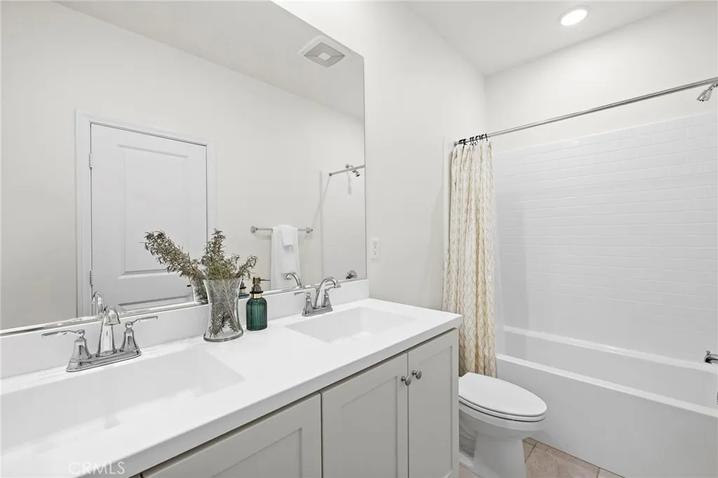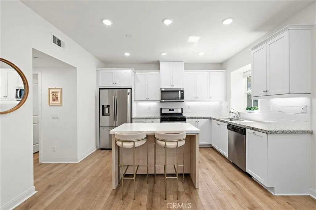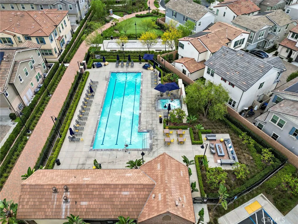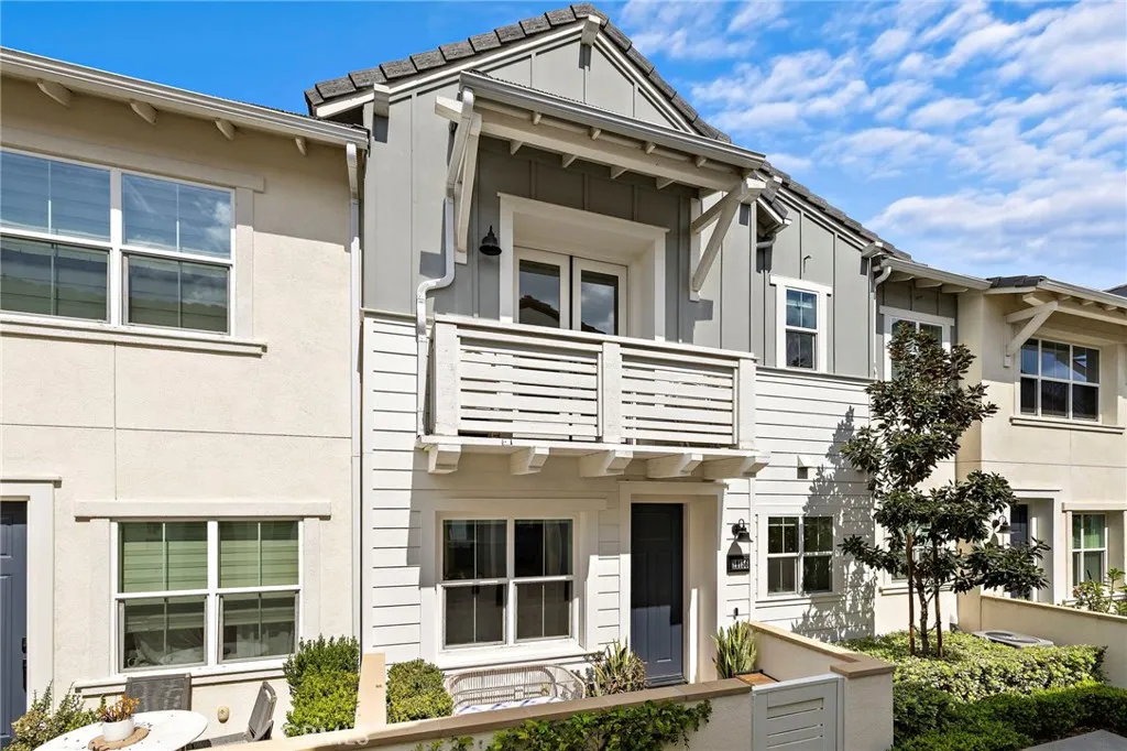 Located in The Groves, one of Whittier's most sought-after master-planned communities, this home puts resort-style living right outside your front door. The community amenities are genuinely impressive — a large pool with lounge seating, shade umbrellas, and built-in BBQs; a lap pool with a spa, firepit, and lounge area; a playground, a dog park, and a spectacular Tudor-style clubhouse anchoring a beautifully manicured central lawn with formal garden landscaping and mountain views. Every walkway and common area is meticulously maintained. Walking distance to shops, including Rodeo 72 Food Hall, EOS gym, Philz Coffee, CAVA, Stater Brothers, and more. The home itself is a 3-bedroom, 3-bathroom condo with 1,320 square feet, a craftsman farmhouse exterior, private front patio, and an upper balcony. The open-concept main level features wide plank wood-look flooring, recessed lighting, and a white shaker kitchen with quartz and granite countertops, subway tile backsplash, a center island with bar seating, and a full stainless steel appliance suite including a gas range, French door refrigerator, microwave, and dishwasher. A powder bath completes the main level. Upstairs, the primary suite includes French doors to the private balcony, a custom built-in walk-in closet, and an ensuite with a soaking tub and separate glass-enclosed shower. Two additional bedrooms share a full bath with a dual-sink vanity. Stacked LG washer and dryer included. The 2-car garage is EV-charger ready and features custom built-in cabinetry, a tankless water heater, and a whole-house water softener and filtration system. Fully paid-off solar panels included.
