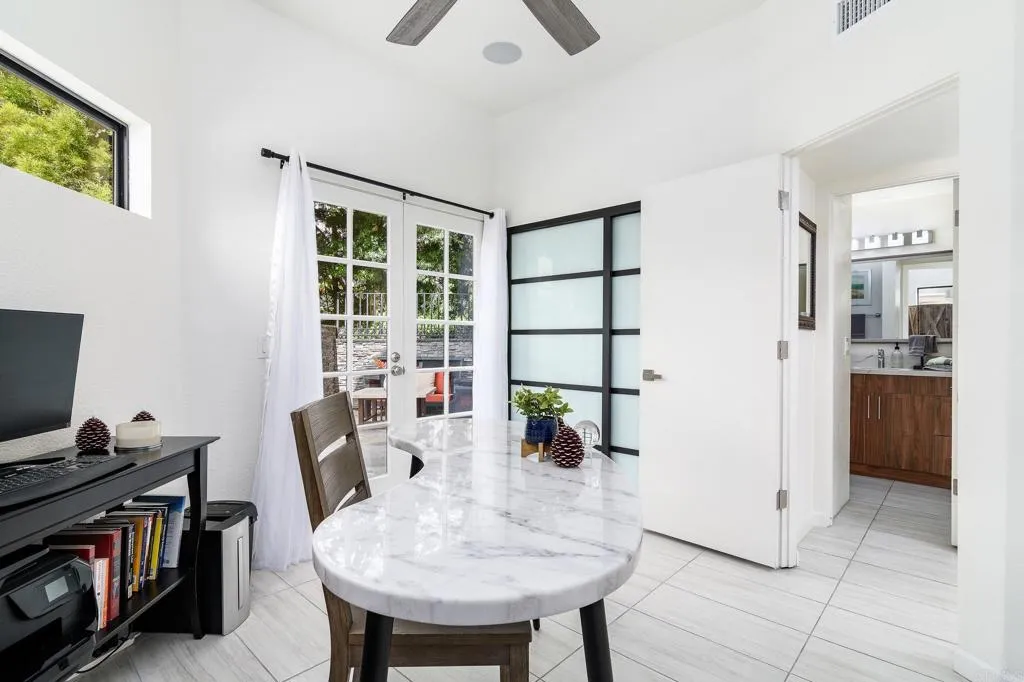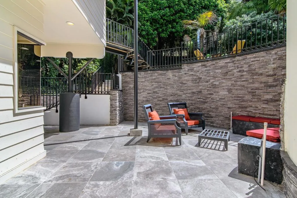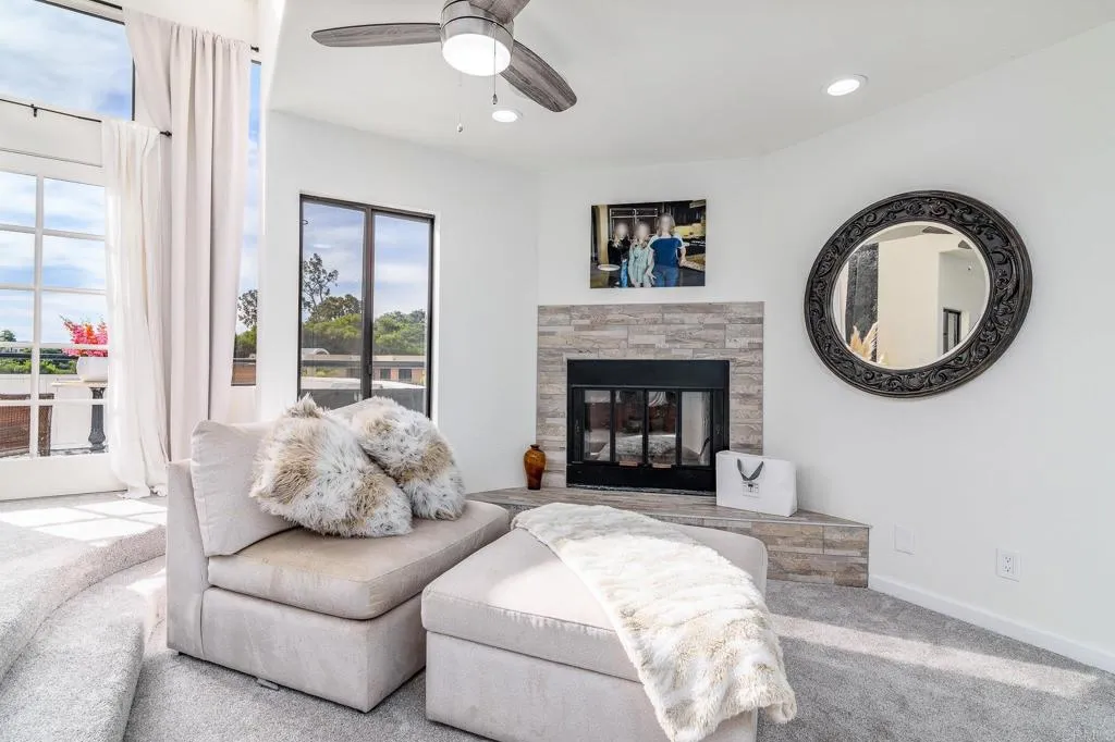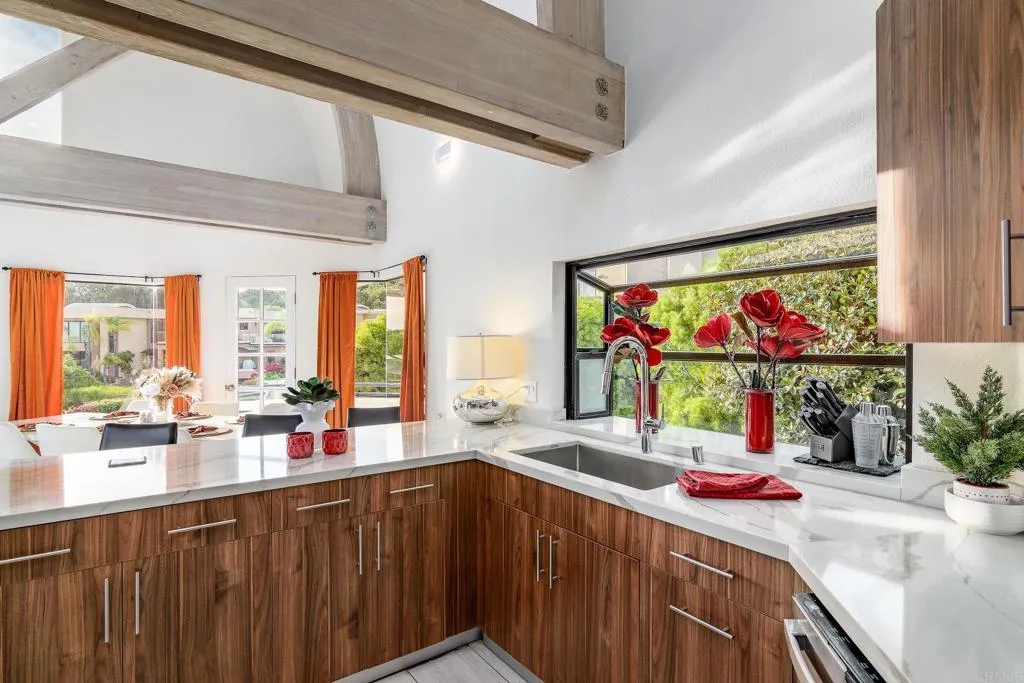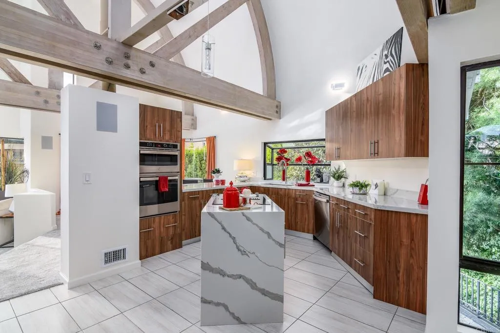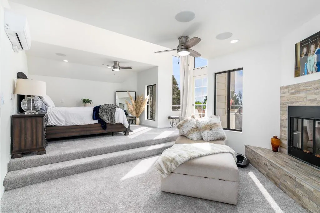 Designed by a renowned local architect, this contemporary home sits on a quiet Muirlands cul-de-sac with peek ocean views from multiple vantage points. Curved architecture and soaring cathedral ceilings with exposed wood beam trusses define the home's dramatic character. The main level features an open living and dining area anchored by a stacked stone fireplace, with French doors leading to one of several private balconies. The kitchen showcases walnut flat-panel cabinetry, a calacatta-style quartz waterfall island with cooktop, built-in wall oven, and an arched beam ceiling that mirrors the home's sculptural lines. The primary suite offers an elevated sleeping area, a second stacked stone fireplace, in-ceiling speakers, and balcony access with sunset views. The renovated primary bath includes dual sinks, a vanity area, and standalone shower. Three additional bedrooms and two renovated bathrooms with ample counter space round out the home. A lower level with its own private entrance features a second living area, wet bar, and flexible space to suit any lifestyle.Recent upgrades include a new roof, HVAC with multiple zoned controls, whole-home data wiring, Bose in-ceiling sound, Belgard hardscape, new deck and staircase, recessed lighting, new carpet, freshly painted inside and out, and epoxy-finished garage floors. Bold architecture paired with thoughtful, modern upgrades — this is La Jolla living at its finest, just minutes from world-class beaches, dining, and the Village.