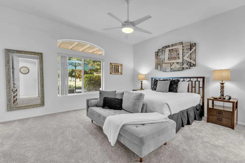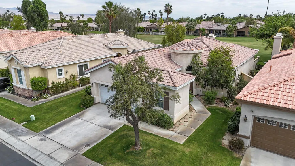 This desirable golf course residence features an open floor plan with high ceilings and abundant natural light. The kitchen is appointed with granite countertops, a breakfast bar, and a pantry. The living area offers ample space for entertainment and includes a gas fireplace and views of the Golf Course. The spacious primary suite includes a double vanity, soaking tub, separate shower, and a walk-in closet. A secondary bedroom is thoughtfully positioned for added privacy. Additional features include a full laundry room and an attached two-car garage with direct access, plus a dedicated golf cart space. Enjoy outdoor living on the patio overlooking the golf course, ideal for taking in the surrounding desert scenery. The community boasts a clubhouse, fitness center, saltwater pool and spa, tennis courts, pickleball courts, and bocce ball courts. Residents also have access to organized activities, including yoga, lap swimming, outdoor cycling, and aquatic classes. With proximity to the Empire Polo Grounds, Home to major events such as music festivals, equestrian, and sports events. This property presents a strong investment opportunity, including short-term rental potential (subject to local regulations) and a history of rental use. Generously sized lot with space suitable for a future pool.