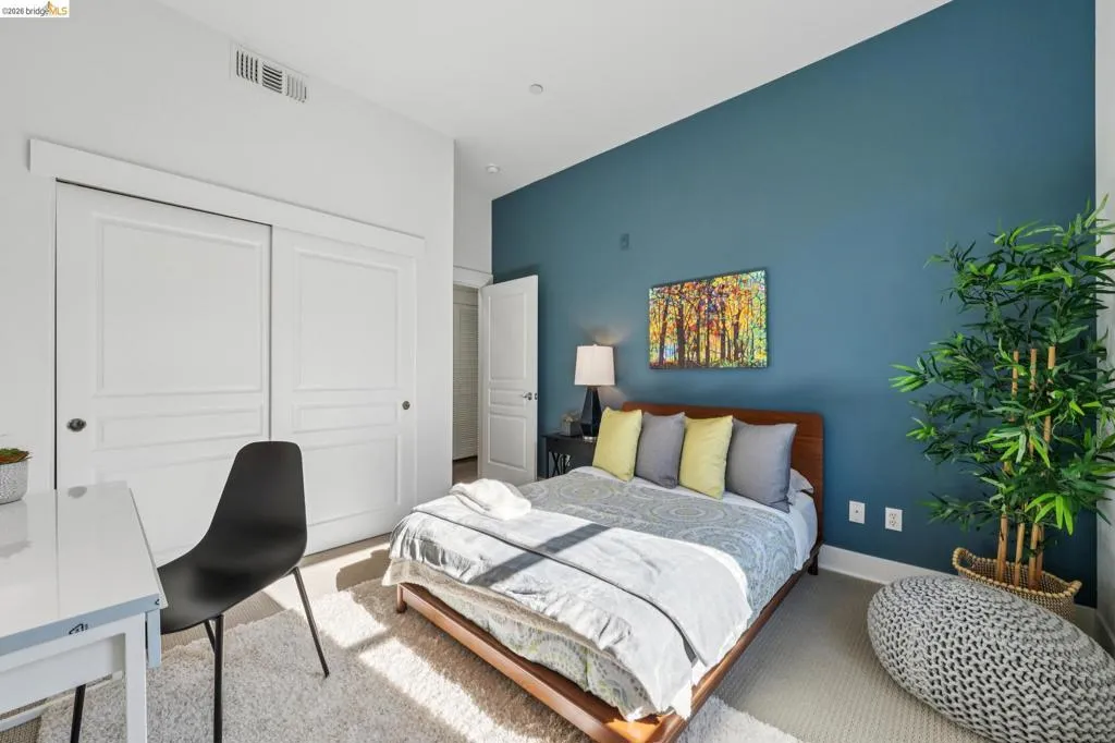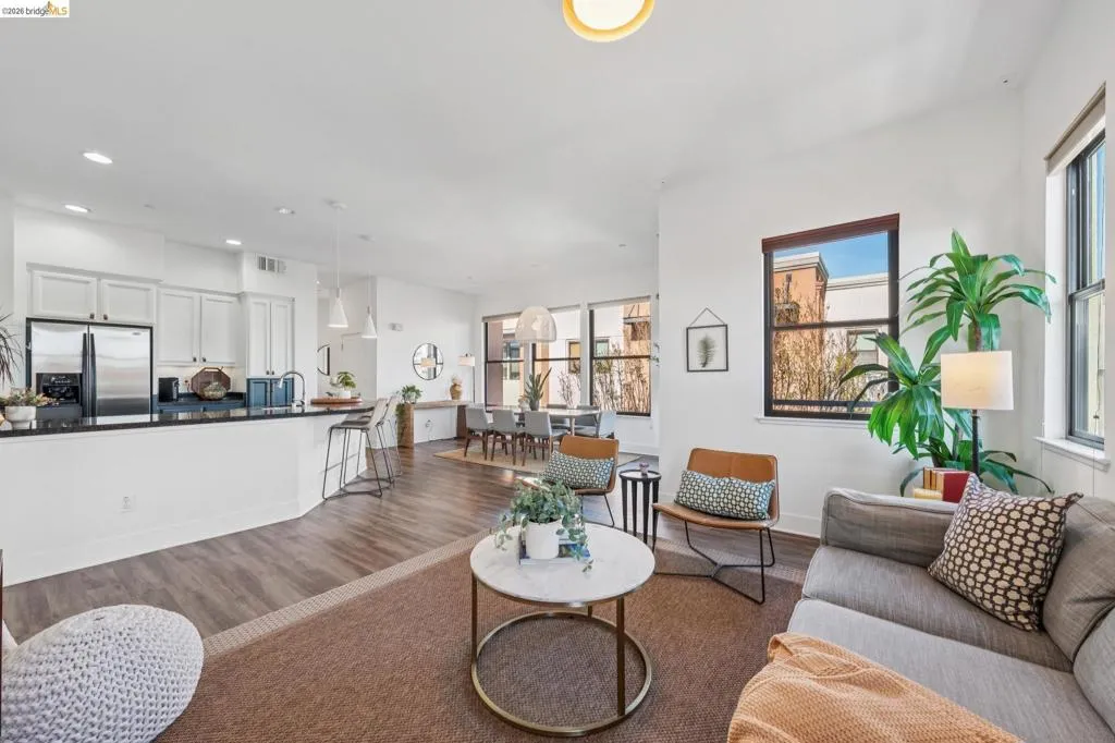 Enjoy modern townhouse style living in the Artisan Walk community! Situated in a quiet garden location in this well-run complex, this sun-drenched unit perfectly blends contemporary design with effortless functionality. The open-concept living areas feature expansive windows that flood the space with natural light with views of the Oakland city skyline, creating a bright and airy atmosphere. At the heart of the home, the updated kitchen shines with designer colors, stainless steel appliances, and breakfast bar seating, flowing seamlessly into the dining area. From here, enjoy a smooth transition to a spacious balcony—perfect for morning coffee or evening relaxation. This residence offers two spacious bedrooms and two full bathrooms, including a primary suite complete with dual sinks and a generous walk-in closet. The home includes a Nest thermostat, central heat and AC, and a compliant sewer lateral. Exceptional utility is found in the large tandem two-car garage with interior access and additional storage rooms. Ideally located with a 93 Walk Score, this move-in-ready gem is close to the Emeryville Greenway and numerous favorite local amenities and eateries. With easy access to transportation, this home represents the best of East Bay living.