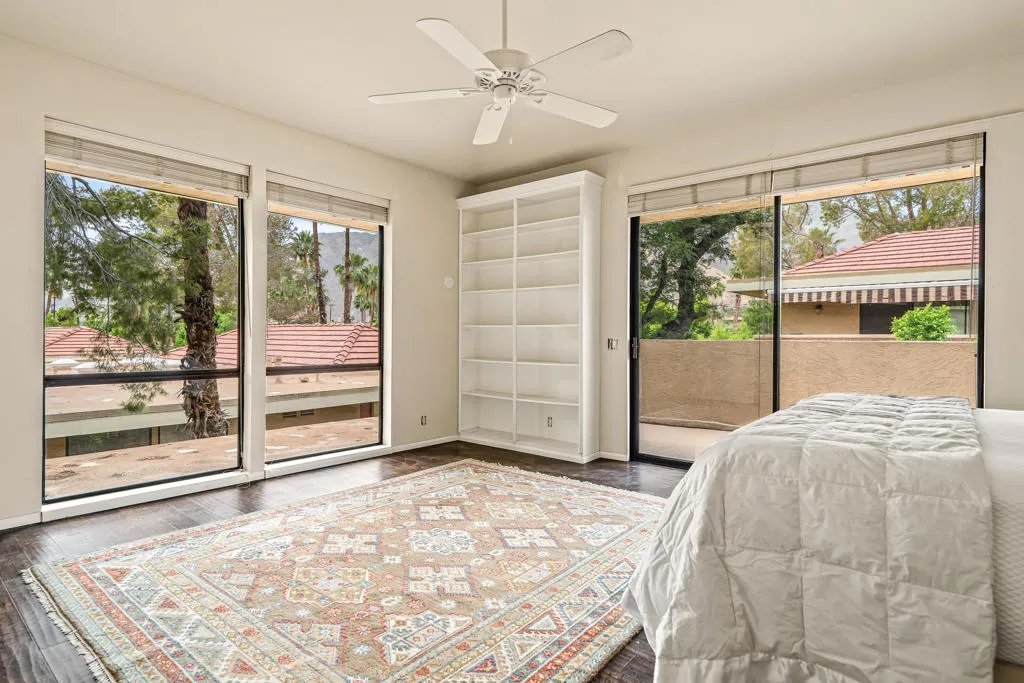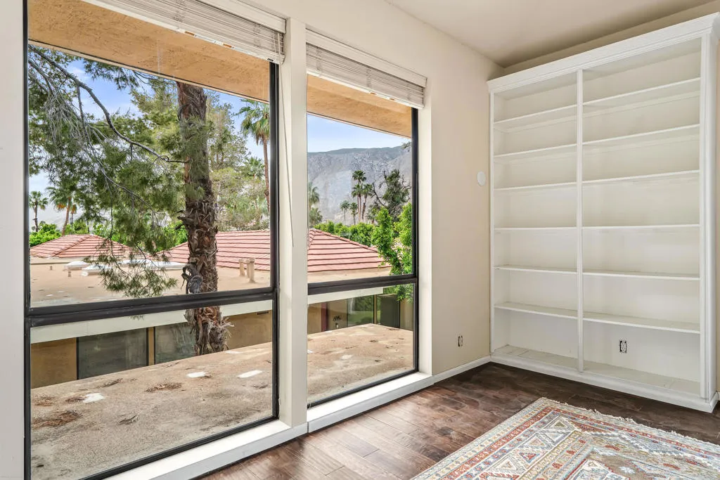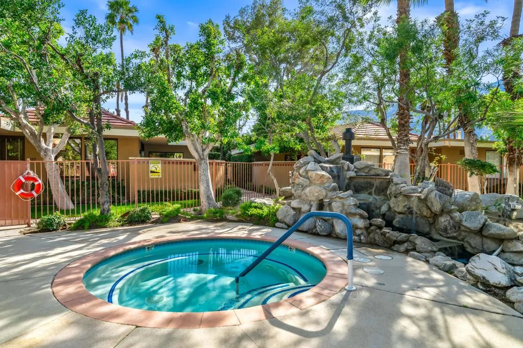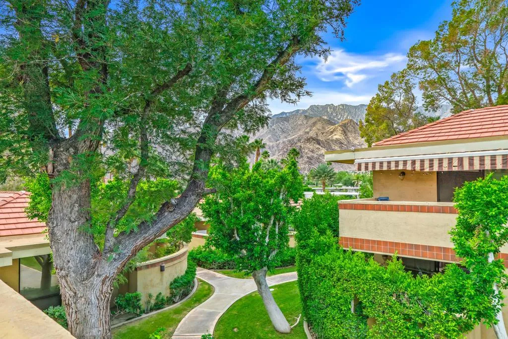 A rare opportunity to own a two-story, townhouse-style residence at the Historic Racquet Club Colony--one of only 20 exclusive villas, with just 10 two-story homes that seldom come to market. This exceptional approximately 1,500 sq ft home is elegant, dramatic, and truly one of a kind. Soaring vaulted ceilings, oversized rooms, and walls of glass create a striking presence while delivering seamless indoor-outdoor living--ideal as a full-time residence or sophisticated Palm Springs retreat. A welcoming entry foyer leads to a versatile 2nd bedroom/guest suite with full ensuite bath--perfect as a home office or creative space. The main living/dining areas feature travertine tile flooring and recessed lighting. The updated kitchen showcases natural wood shaker cabinetry, rich dark granite countertops, a gray mirrored backsplash, stainless steel appliances, deep under mount sink, and a built-in flat screen TV. Glass sliders open to a private, walled front patio offering European charm and romance, complete with a lion head fountain and faux boxwood walls--perfect for entertaining or relaxed desert living.The 2nd level primary suite is a true retreat. A charming natural light-filled nook off the staircase provides space for a desk or reading area, while the expansive bedroom features dramatic 12' vaulted ceilings and ''treehouse'' panoramic mountain views through floor-to-ceiling windows. Sliders open to a generous private second-story terrace, extending the living experience outdoors. The ensuite bath features a dressing area with a large mirrored double closet and a spacious layout. In-unit laundry, walk-in closets, and additional storage throughout--including under-stair space--add everyday convenience. Custom wood blinds, thoughtful upgrades, and abundant storage enhance comfort and livability throughout this distinctive residence. Set within lush, gated, fee-simple grounds, Racquet Club Colony offers a serene, resort-style environment with pool, spa, and cascading waterfall fountain surrounded by mature landscaping. Covered parking, ample guest parking, and a pet-friendly setting with a dedicated dog run complete the community. Ideally located minutes from shopping, dining, and fitness, and just 10 minutes to vibrant downtown Palm Springs--this is a compelling opportunity to own a dramatic, architecturally unique residence in one of the city's most exclusive enclaves.