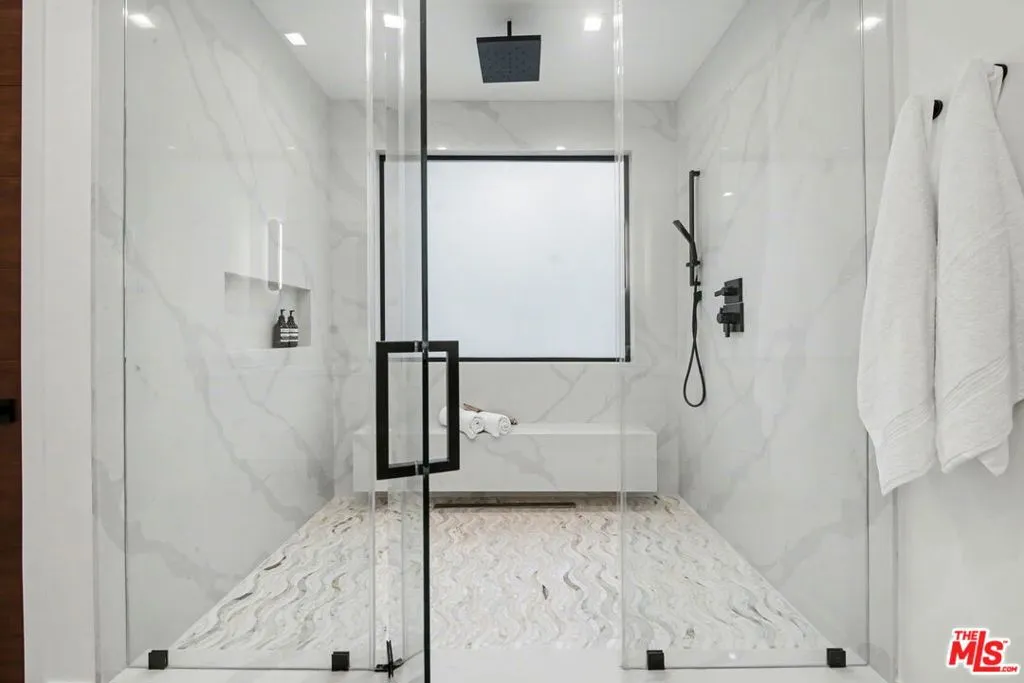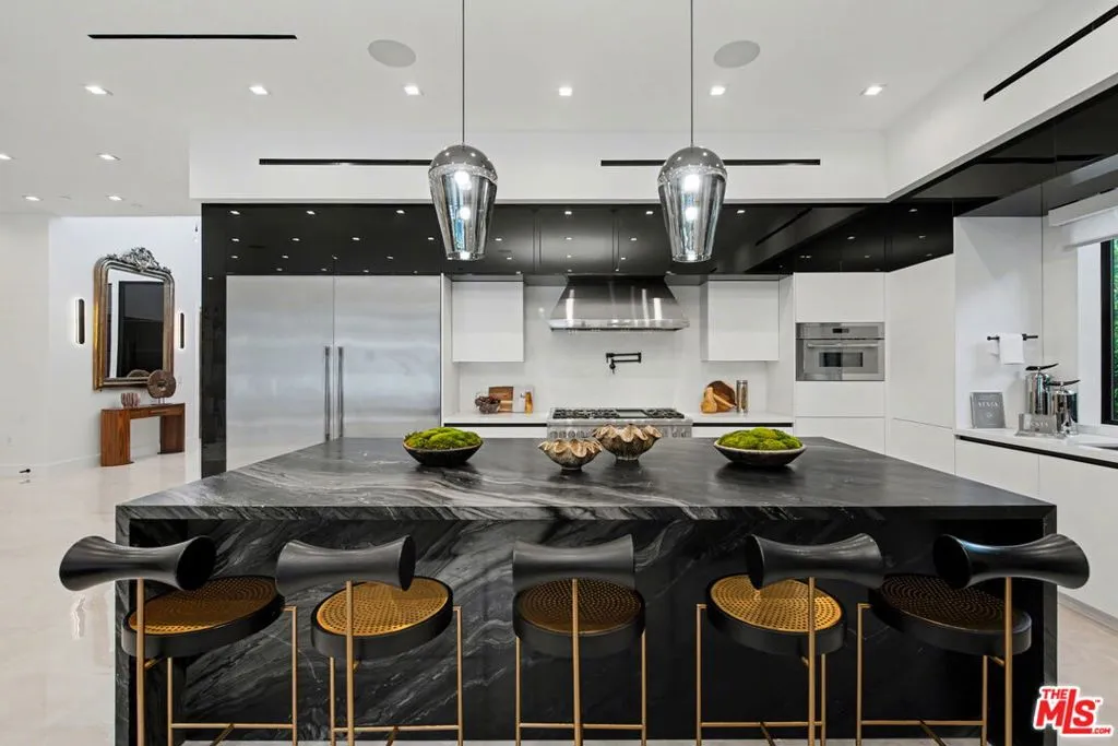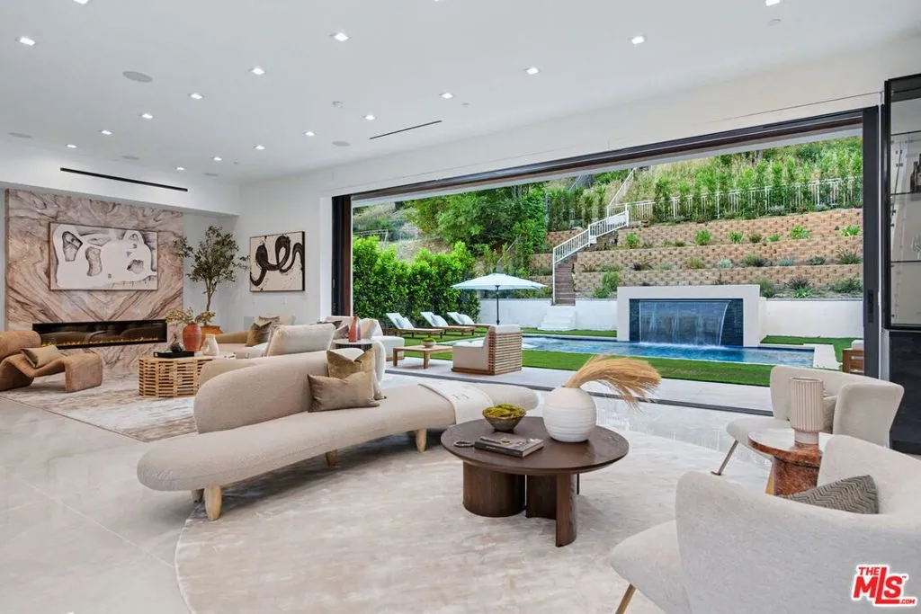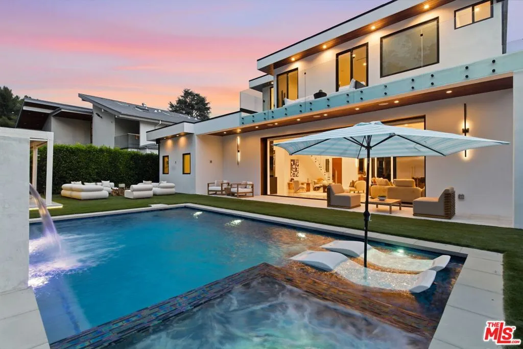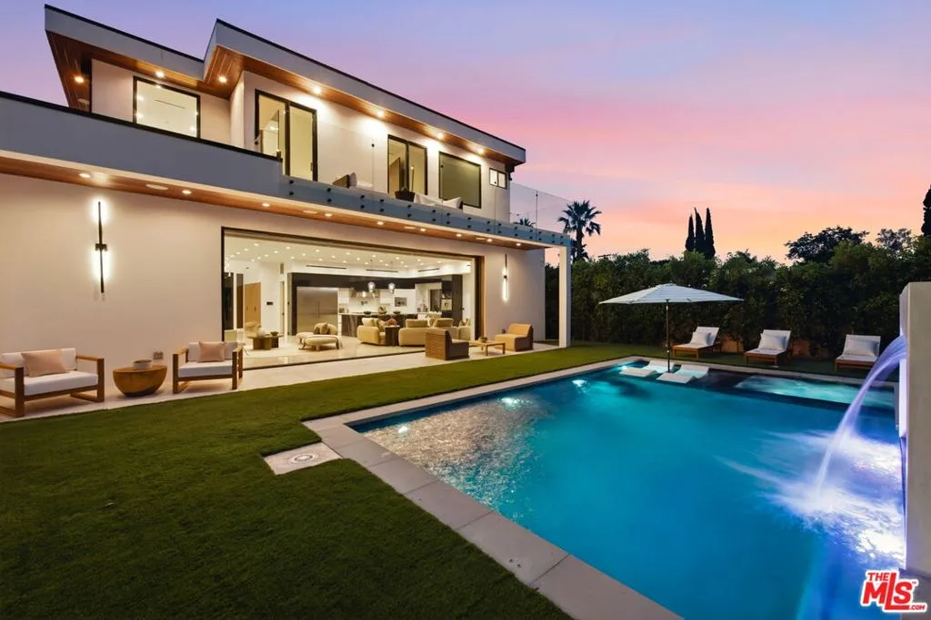 Welcome to this striking modern residence in the heart of Woodland Hills, where sleek architecture, smart home technology, and seamless indoor-outdoor living come together in perfect harmony. Privately gated and newer built, this thoughtfully designed home offers 3 bedrooms, 3.5 bathrooms, and a flexible layout ideal for both everyday living and elevated entertaining. Step inside to soaring ceilings and an expansive open-concept floor plan that effortlessly connects kitchen, living room, family room, and formal dining area. Walls of glass and disappearing pocket doors create a true indoor-outdoor experience, flooding the home with natural light while opening directly to the resort-style backyard. The outdoor space is a private oasis, featuring lush grassy areas, multiple seating and lounge spaces, and a stunning pool and spa with a tranquil waterfall feature. Entertain with ease in the fully equipped gazebo complete with dining area, built-in BBQ, and pizza oven perfect for hosting unforgettable gatherings year-round. The main level includes two spacious en-suite bedrooms along with a stylish powder room, offering comfort and privacy for guests or family. Upstairs, the primary suite serves as a true retreat, complete with a spa-like bathroom and an expansive walk-in closet. A separate upstairs space ideal as a home office, media room, or additional family lounge adds flexibility without being tied to the primary suite. Adding to the home's versatility, the current formal dining room was originally designed and approved as an en-suite fourth bedroom, offering the opportunity for an easy conversion back to a 4-bedroom, 4.5-bath layout upon buyer's request. Designed for modern living, the home is equipped with smart home features, clean contemporary finishes, and a cohesive aesthetic throughout. With its prime Woodland Hills location, gated privacy, and exceptional indoor-outdoor flow, this home delivers the perfect blend of luxury, functionality, and the California lifestyle.