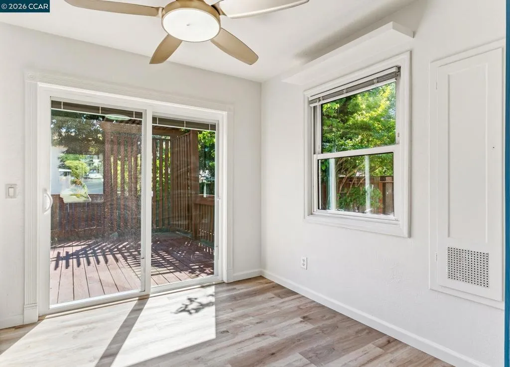 Charming, updated home with character, natural light, and inviting outdoor space. This thoughtfully refreshed property blends classic appeal with tasteful modern finishes. The bright, functional layout features an updated kitchen with white cabinetry, sleek hardware, and ample counter space, opening to comfortable living and dining areas filled with natural light. The living room is anchored by a fireplace and large window, creating a warm gathering space. The remodeled bathroom offers a custom vanity, marble surfaces, and designer fixtures with a timeless feel. Bedrooms are light-filled and comfortable, complemented by hardwood flooring that adds warmth and character. A spacious rear deck extends the living space outdoors—ideal for entertaining or relaxing—while the yard provides privacy and flexibility for gardening or play. Additional improvements include updated lighting, dual-pane windows, and a practical layout designed for everyday living. Conveniently located near local amenities, commuter routes, and the Vallejo waterfront.