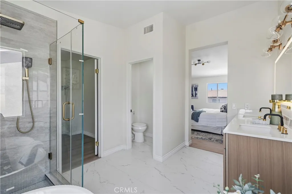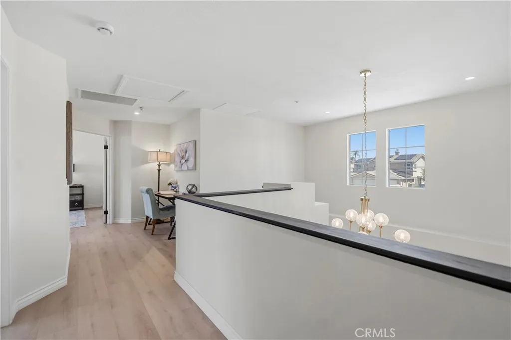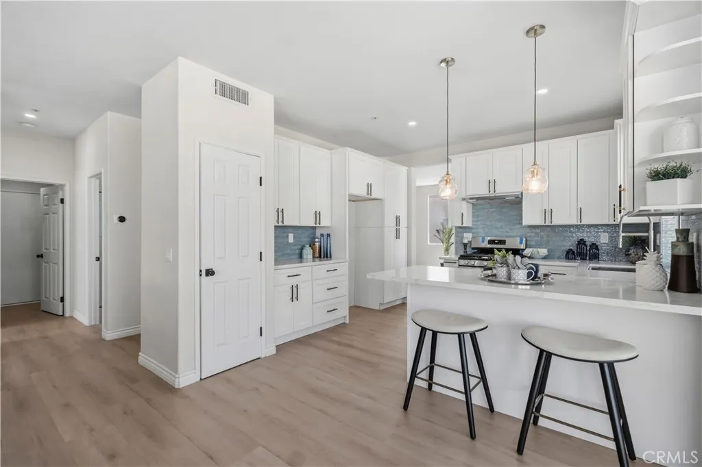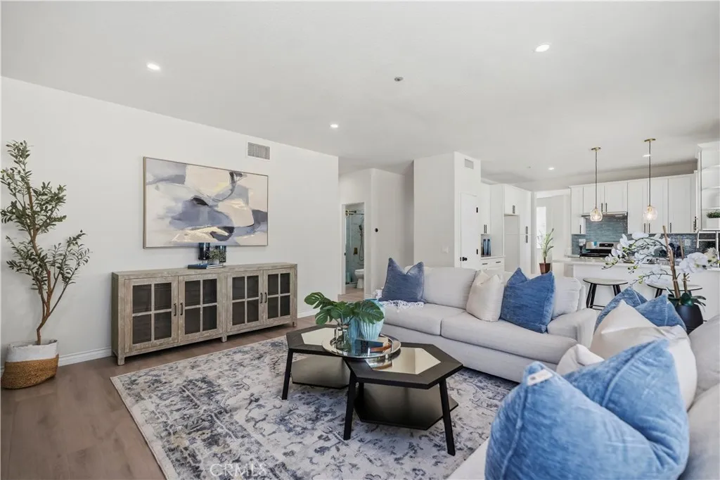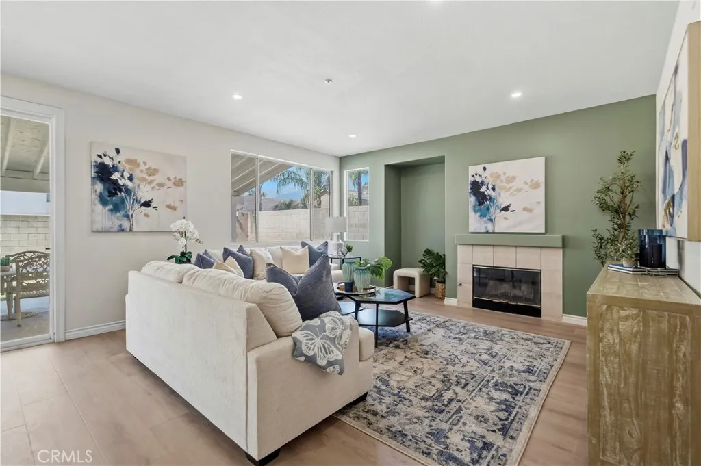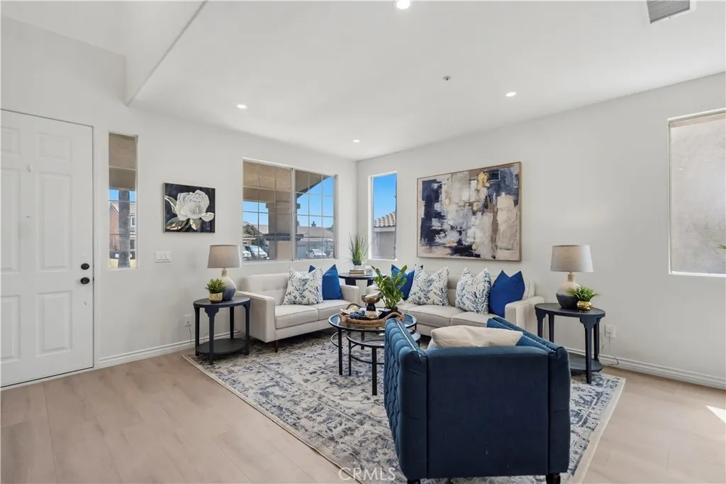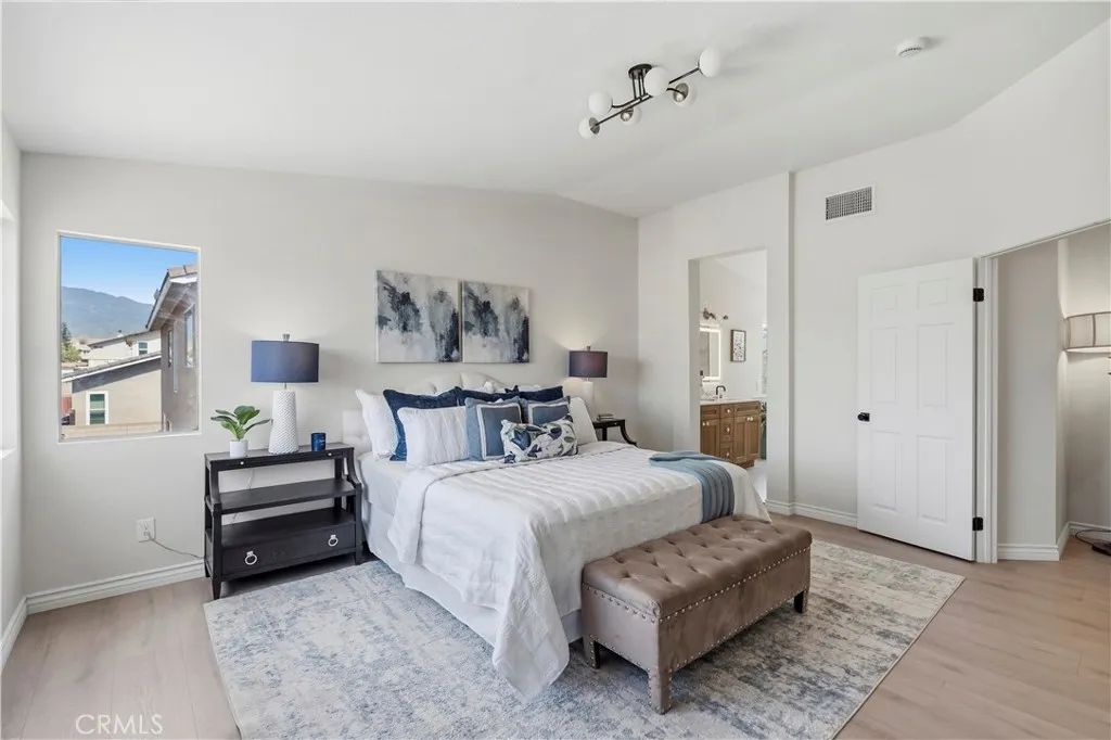 This beautifully upgraded home in Fontana showcases a bright and airy layout with soaring high ceilings that create an impressive sense of space upon entry. The open-concept living area is filled with natural light and features stylish finishes, modern décor, and a seamless flow into the dining area—perfect for both everyday living and entertaining. A striking staircase leads to the second floor, adding architectural character and visual appeal to the home. The thoughtfully designed floor plan includes one bedroom and one full bathroom on the first floor, ideal for guests, extended family, or a private home office. The upgraded kitchen is both functional and elegant, featuring quartz countertops, white cabinetry, stainless steel appliances, and a breakfast bar, all overlooking the backyard through large sliding glass doors that bring in abundant natural light. Upstairs, additional living spaces provide comfort and privacy, while the overall layout maximizes both functionality and modern living. Select areas of the home enjoy beautiful mountain views, offering a serene and scenic backdrop to everyday living. The home is enhanced with new flooring, fresh interior paint, and updated finishes throughout, creating a clean, move-in-ready environment. The backyard offers a covered patio area, perfect for outdoor dining, relaxation, and entertaining. Ideally located in a highly desirable school district, this home is also just minutes away from parks, schools, lakes, golf clubs, and shopping centers, offering both convenience and a vibrant lifestyle.