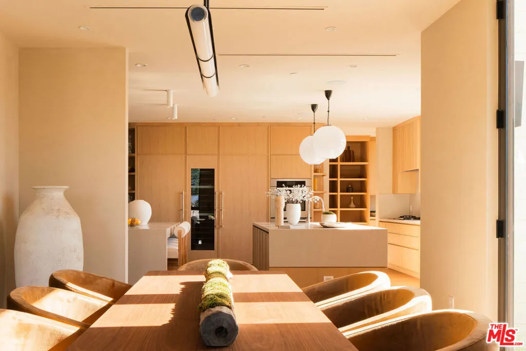 Set behind a composed masonry faade and framed by curated landscaping, this newly constructed contemporary residence pairs clean architectural lines with warm, textural finishes. Steel-framed openings and symmetrical design create a presence that feels both timeless and current. Inside, light-filled living spaces are defined by wide-plank oak floors, limewashed walls, and a refined blend of white oak and walnut millwork. Custom paneling, tailored built-ins, and sculptural lighting add depth while maintaining a cohesive, modern aesthetic. The main living room centers around a dramatic travertine fireplace with integrated shelving, while expansive openings flood the space with natural light. The layout flows seamlessly into the dining area and chef's kitchen, where white marble surfaces and slim Shaker-style cabinetry deliver both elegance and functionalityopen for entertaining yet comfortable for everyday living. Retractable sliding doors dissolve the line between indoors and out, extending the living space to a private, resort-like backyard. Mature hedging, layered greenery, and generous patio areas create multiple zones for dining and lounging, all surrounding a pool framed by clean hardscape and soft landscaping. Upstairs, the primary suite offers a calm, light-filled retreat. The spa-inspired bath features a freestanding soaking tub, expansive walk-in glass shower with bench, and a floating double vanity clad in rich wood with stone countertops and refined wall-mounted fixtures. Emperador Light marble and warm finishes add depth while maintaining a clean, contemporary feel. A custom dressing area with built-in shelving and tailored lighting completes the suite. Secondary bedrooms and baths continue the home's modern design language with consistent finishes and thoughtful detailing throughout. Resort-caliber amenities are thoughtfully positioned on the lower level, including a private cinema, a dedicated wellness suite featuring a fully outfitted fitness studio and spa bath with steam shower, as well as two additional guest suites. Outdoor entertaining areas extend the home's livability, creating a setting that functions as both retreat and gathering space. Meticulously executed, this contemporary residence blends architecture, comfort, and lifestyle with enduring appeal. Available furnished at $55,000 a month.