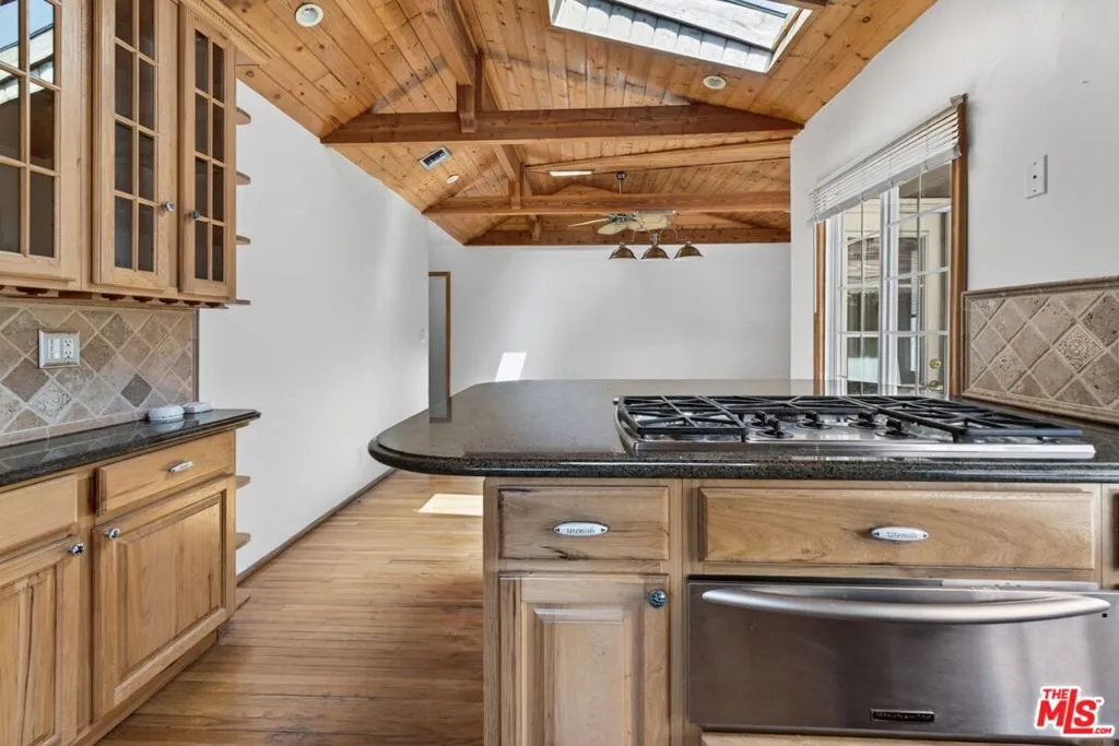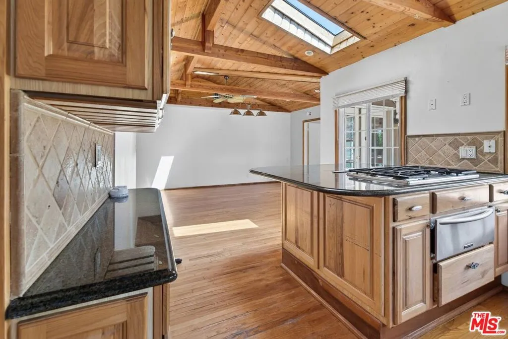 Welcome to a beautifully maintained residence in one of Burbank's most sought-after hillside neighborhoods, where timeless design, thoughtful details, and sweeping mountain views come together to create an exceptional living experience. From the moment you arrive, the lush, manicured landscaping and inviting entryway set a warm and elegant tone. Inside, you're greeted by striking stone flooring that transitions into rich hardwood floors that flow seamlessly throughout the home, with expansive windows throughout allowing an abundance of natural light to fill every space. To the right, the spacious living room offers a refined yet comfortable setting, centered around a stunning stone-accented fireplace, an ideal space to gather, relax, and enjoy cozy evenings at home. Continuing through the home, a versatile office space features custom built-ins and its own private bathroom, offering the perfect blend of functionality and style for working from home or hosting guests. The kitchen is beautifully appointed with marble countertops, warm wood cabinetry, a double oven, and a cohesive design that complements the home's timeless aesthetic, while just off the kitchen you'll find a separate dedicated laundry area, thoughtfully tucked away for added convenience. Expansive glass doors open to a generous backyard designed for effortless indoor-outdoor living, featuring a built-in barbecue, ample space for entertaining, and the perfect setting to relax or host gatherings. The primary suite serves as a private retreat with direct backyard access, a spacious closet with built-ins, and a spa-inspired bathroom showcasing elegant stone finishes from floor to ceiling, a luxurious walk-in shower, and gold-accented fixtures that create a sophisticated, modern feel. Additional bedrooms are generously sized and thoughtfully appointed, each with built-in closet features and complemented by a well-designed hall bath that continues the home's refined aesthetic. Set in a premier Burbank hillside location, this home offers a rare combination of privacy, views, and convenience, making it an ideal opportunity to enjoy elevated living in one of the city's most desirable communities.