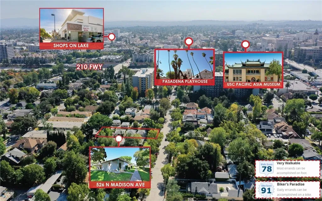 4 Single-story Bungalows several blocks north of Old Town Pasadena, Large ±13k SF Lot, highly desirable layout, Easy to Rent and Manage, Clear ADUs Upside (4 ADUs), 2 units upgraded. 526-532 N Madison Ave, a bungalow style 4-units Single story apartment in the City of Pasadena. Situated only several blocks north of Old Town Pasadena, 2 blocks west of Los Robles Ave, and just within walking distance of many dining, shopping, and other attractions in Pasadena. It is situated on a quiet residential street surrounded by single family houses. The property offers a highly desirable bungalow single-story layout (no adjoining walls) providing tenants with single family residential feel. It consists of 4 separate bungalows with a lush center courtyard/walkway providing serene atmosphere for the tenants. The unit mix is one (1) x 2bedroom+1bathroom and three (3) 1bedroom+1bathroom units, which makes it very easy to rent and manage. The property was built in 1940, has a total of ±3,326 SF building size (Average unit size is 830SF/unit) and is situated on a large ±13,185 SF lot. Each unit is charming with original hardwood flooring, ceiling fans, plenty of built in cabinets, tiled kitchen and bathroom, and in-unit laundry hookups. The front 1 bedroom unit #532 was recently leased for $2450/month. Two units (#532 and #530) have been upgraded with brand new kitchen and updated bathroom. Parking is provided via detached 3 car garages and 1 open space in the back. Each unit has individual water heaters and separately metered for electricity and gas. Each unit has its own laundry hookups. The property is in the highly desirable area of Pasadena just several blocks north of Old Town Pasadena. It is situated on a quiet tree-lined street and within minutes from the Gold Line and numerous additional shopping and dining options on Colorado Boulevard and Lake Avenue. Near Pasadena’s historic City Hall, it sits just minutes from the California Institute of Technology, Pasadena Community College, and the 210 and 110 Freeways, offering ease of access to neighboring cities and entertainment destinations in the region. Historic Old Pasadena’s charming storefronts house 200 shops plus a wide array of restaurants and night spots. The Pasadena Convention Center, Pacific Asia Museum, the historic Tournament of Roses house, and the Norton Simon Museum are minutes away. The property has superb access to FWY 110 and FWY 210.