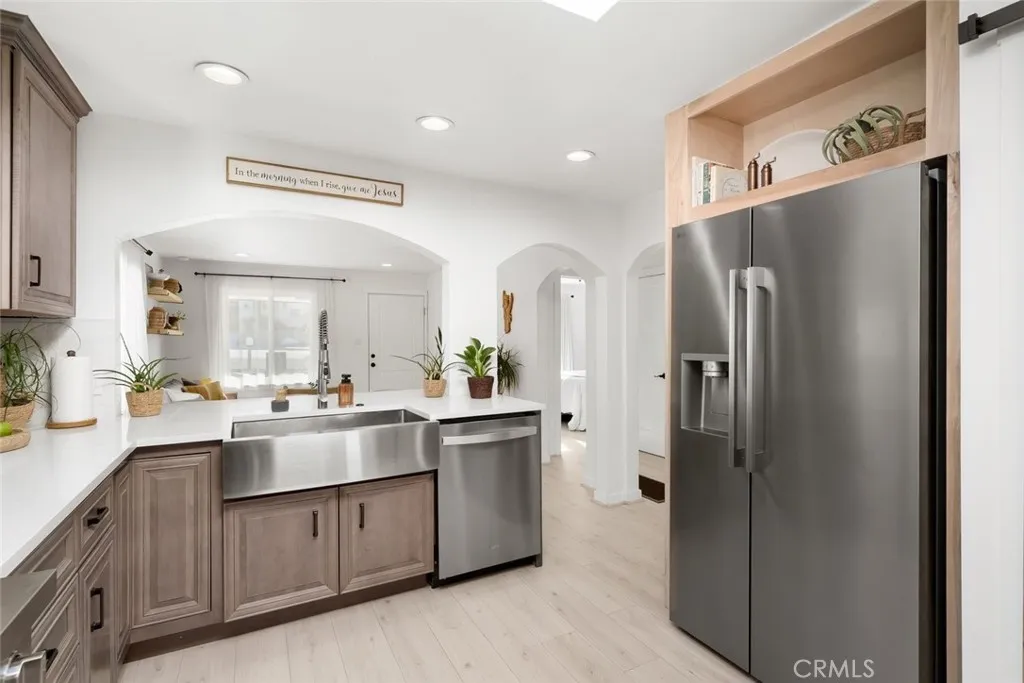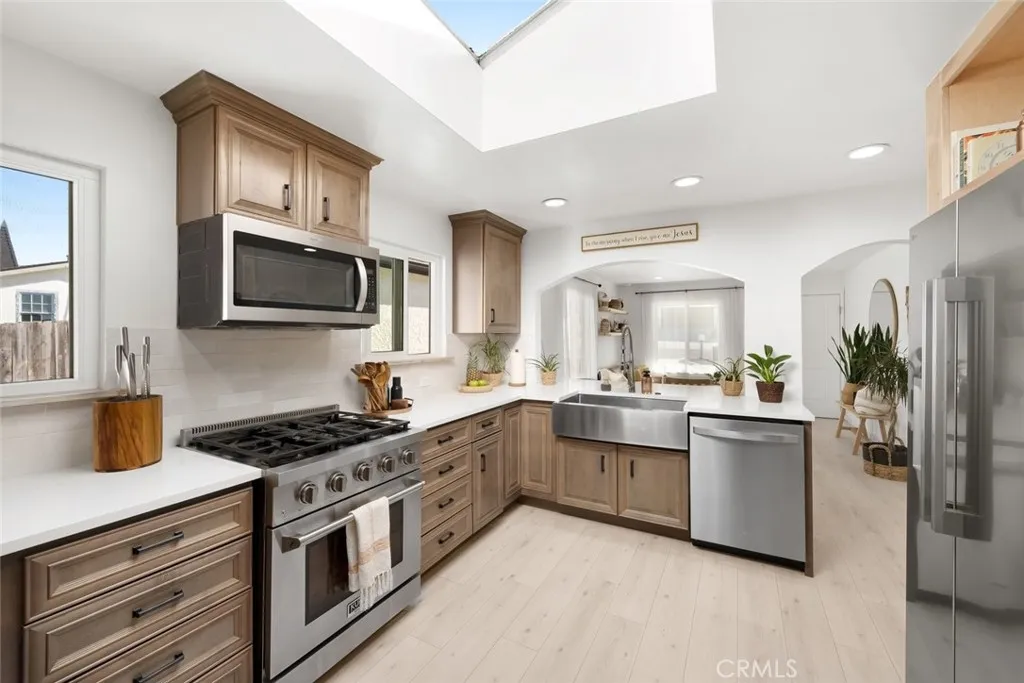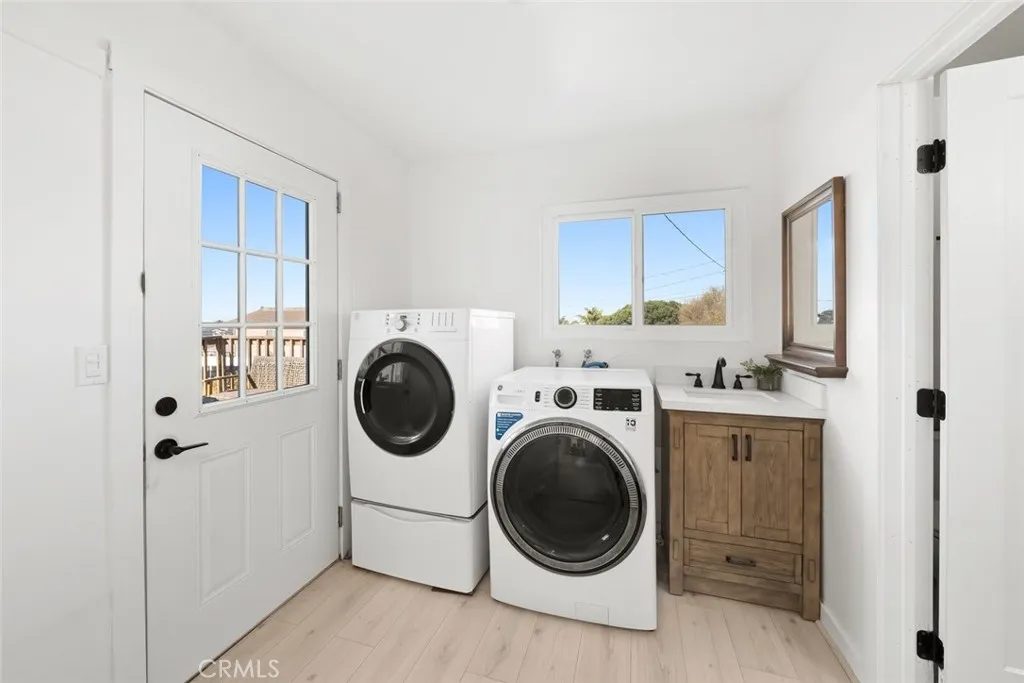 Beautifully updated 3-bedroom, 2-bath home, ideally located just a few blocks from the beach on a spacious R2 lot. Whether you're seeking multi-generational living or an opportunity to offset your mortgage with rental income, this property offers exceptional flexibility. The front of the home welcomes you with a bright, open-concept kitchen designed to impress—featuring quartz countertops, solid wood cabinetry, a farmhouse-style stainless steel sink, sleek tile backsplash, and a large skylight that fills the space with natural light. Two well-appointed bedrooms and a full bathroom with a solid wood vanity complete this section, with one bedroom offering direct access to a private patio. The back of the home opens up to a stunning flex space with its own private entrance—perfect as a guest suite, second living area, or oversized primary retreat. This inviting space showcases exposed wood beam ceilings, a cozy tile fireplace, and seamless indoor-outdoor flow to an expansive back deck. The generously sized back bedroom features new French doors and west-facing exposure, capturing ocean breezes and sunset light. An updated kitchenette with stainless steel appliances and subway tile backsplash adds even more convenience. Unwind in the spa-inspired bathroom, complete with a double farmhouse vanity and a walk-in rain shower. Additional highlights include a dedicated laundry room, multiple French doors leading to the backyard, and peek-a-boo ocean and dune views—with potential for panoramic ocean vistas from a future second story (buyer to verify). Upgrades throughout include Milgard Tuscany windows and doors, luxury vinyl plank flooring, recessed lighting, modern fixtures, and energy-efficient HVAC system with AC mini split for independent climate control of front and back of home. Outside is an entertainer’s dream backyard—featuring a covered dining patio, built-in BBQ area with smoker, warming drawer, and beverage refrigerator, plus a spacious seating area ideal for a fire pit. The lush lawn provides plenty of room for outdoor activities and relaxation. A rare opportunity to enjoy coastal living with built-in flexibility and future potential—schedule your private showing today!