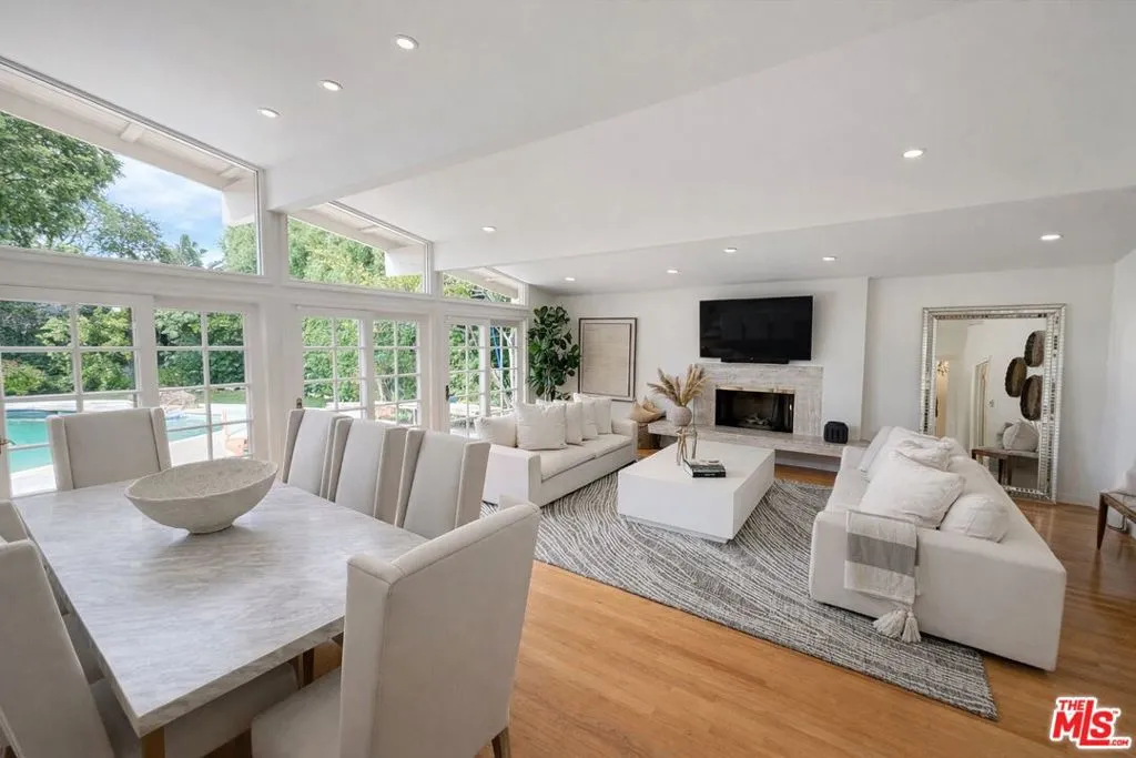 Located in one of the most desirable areas of Sherman Oaks, this gated residence is a true entertainer's dream. Featuring an open floor plan filled with natural light, the home welcomes you through custom double doors into a bright foyer with French doors spanning the rear of the home.Vaulted ceilings and a spacious living room with fireplace create an inviting atmosphere, while the family room offers a decorative updated fireplace and views of the private backyard. The Italian-designed kitchen is equipped with black granite countertops, SieMatic cabinetry, stainless steel built-in appliances, imported tile backsplash, and a custom center island with recessed lighting.The home offers generously sized bedrooms and a spacious primary suite with a large walk-in closet and en suite bath featuring dual vanities and a walk-in shower.The backyard is quiet and private, complete with beautifully landscaped grounds and a solar-heated custom pool perfect for relaxing or entertaining.