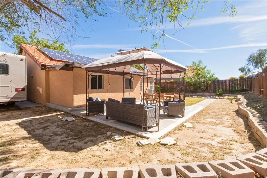 Beautiful single-story home featuring 3 bedrooms and 2 bathrooms with over 1,200 sq ft of comfortable living space. This home offers an open-concept layout with a spacious family room that flows seamlessly into the kitchen and dining area—perfect for entertaining. Enjoy a cozy fireplace, stylish laminate flooring, and modern quartz countertops in both the kitchen and bathrooms. The property is equipped with solar panels for energy efficiency and includes a spacious backyard with RV access, providing plenty of room for outdoor enjoyment. Conveniently located near the Palmdale Water Park, schools, and a variety of local shopping and dining options, this home offers both comfort and convenience.