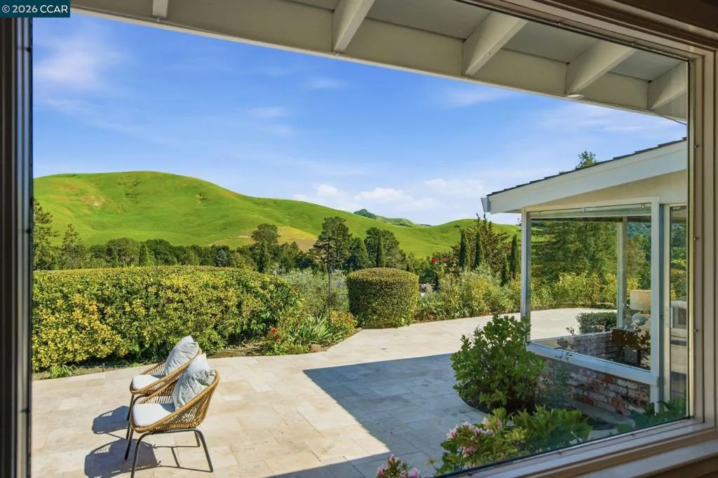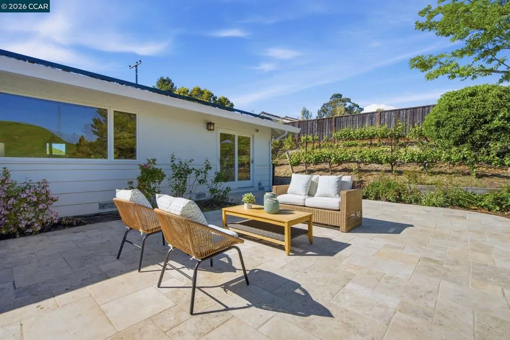 This bright and cheerful single-story home offers pastoral hillside views, your own private Pinot Noir vineyard, and effortless California living all on one level. Newly refinished hardwood floors flow from the entryway to the inviting living room with fireplace and framing picture-perfect views and a formal dining room. The eat-in kitchen with gas range has a cozy dining nook with built-ins. French doors from the dining room lead to a sunroom offering an additional 200+ square feet of bonus space. The home offers three bedrooms, including a primary suite with walk-in closet, large shower, and sliders that open directly to the yard. The two additional bedrooms with abundant natural light and the hall bath complete the layout. Outside, the flat yard offers space for play and relaxation, and a lower flat pad with chicken coup provides opportunity for a garden, bocce ball court or other pursuits. The gorgeous hillside features a spectacular vineyard planted with four varietals of Pinot Noir. There is owned solar, 4 Tesla Powerwalls, tankless water heater, and an EV charger. Close to top-rated K–8 schools, Rancho Laguna Park, the Moraga Farmers' Market, Canyon Club Brewery, and everything that makes Moraga so special.