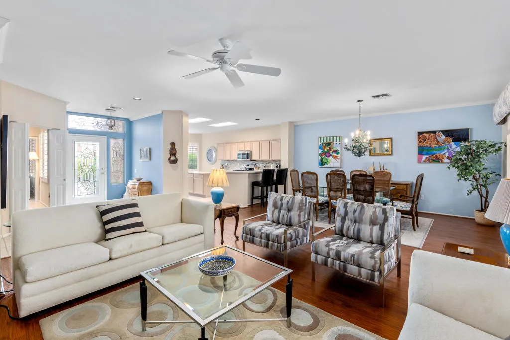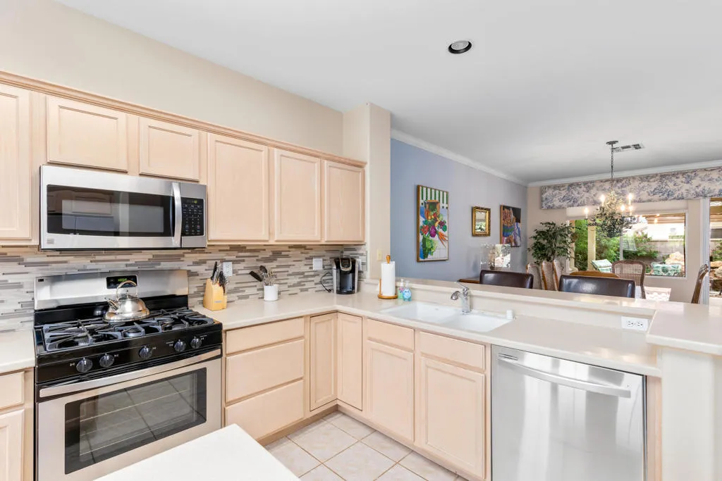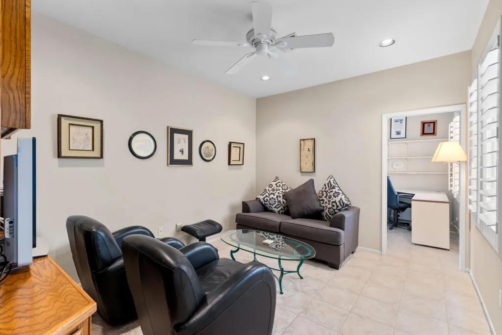 Welcome to this wonderful furnished St Croix model with great curb appeal and mature landscaping. This home has a generous living room, large dining area, 2 bedrooms, den, + office with closet for a 3rd bedroom if needed. Kitchen has Corian counters, updated backsplash, and stainless-steel appliances all in great condition. Two full bathrooms, extra-large primary bedroom and gracious guest room. Double car garage + golf cart garage, plenty of storage space. Private back yard has expanded covered patio with lopts of room for entertaining as well as a beautiful water feature. This is a low monthly cost solar home in a wonderful community close to the Mountain View clubhouse. The best of desert living here in Sun City!